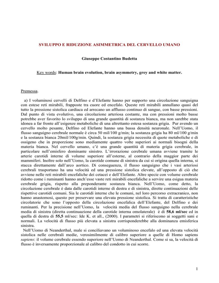 SVILUPPO E RIDUZIONE ASIMMETRICA DEL CERVELLO UMANO Giuseppe Costantino Budetta Key words: Human brain evolution, brain asymmetry, grey and white matter. Premessa. a) I voluminosi cervelli di Delfino e d’Elefante hanno per supporto una circolazione sanguigna con estese reti mirabili, frapposte tra cuore ed encefalo. Queste reti mirabili annullano quasi del tutto la pressione sistolica cardiaca ed arrecano un afflusso continuo di sangue, con basse pressioni. Dal punto di vista evolutivo, una circolazione arteriosa costante, ma con pressioni molto basse potrebbe aver favorito lo sviluppo di una grande quantità di sostanza bianca, ma non sarebbe stata idonea a far fronte all’esigenze metaboliche di una altrettanto estesa sostanza grigia. Pur avendo un cervello molto pesante, Delfino ed Elefante hanno una bassa densità neuronale. Nell’Uomo, il flusso sanguigno cerebrale normale è circa 50 mil/100 g/min; la sostanza grigia ha 80 ml/100 g/min e la sostanza bianca 20mil/100g/min. Quindi, la sostanza grigia necessita di quote metaboliche e di ossigeno che in proporzione sono mediamente quattro volte superiori ai normali bisogni della materia bianca. Nel cervello umano, c’è una grande quantità di materia grigia cerebrale, in particolare nell’emisfero dominante sinistro. L’irrorazione cerebrale umana avviene tramite le arterie carotidi interne di volume superiore all’esterne, al contrario della maggior parte dei mammiferi. Inoltre solo nell’Uomo, la carotide comune di sinistra da cui si origina quella interna, si stacca direttamente dall’arco aortico. Di conseguenza, il flusso sanguigno che i vasi arteriosi cerebrali trasportano ha una velocità ed una pressione sistolica elevate, all’opposto di ciò che avviene nelle reti mirabili encefaliche dei cetacei e dell’Elefante. Altre specie con volume cerebrale ridotto come i ruminanti hanno anch’esse vaste reti mirabili encefaliche a servire una esigua materia cerebrale grigia, rispetto alla preponderante sostanza bianca. Nell’Uomo, come detto, la circolazione cerebrale è data dalle carotidi interne di destra e di sinistra, dirette continuazioni delle rispettive carotidi comuni. Sia le carotidi interne che le comuni, nel loro percorso extracranico, non hanno anastomosi, questo per preservare una elevata pressione sistolica. Si tratta di caratteristiche circolatorie che sono l’opposto della circolazione encefalica dell’Elefante, del Delfino e dei ruminanti. Per la precisione nell’Uomo, la velocità media del flusso sanguigno nella cerebrale media di sinistra (diretta continuazione della carotide interna omolaterale) è di 58,6 ml/sec ed in quella di destra di 55,5 ml/sec: Ide K. et all., (2000). I parametri si riferiscono ai soggetti sani e normali. La velocità di flusso più elevata a sinistra corrisponderebbe alla dominanza emisferica sinistra. Nell’Uomo di Neanderthal, male si conciliavano un voluminoso encefalo ed una elevata velocità sistolica nelle cerebrali medie, verosimilmente di calibro superiore a quelle di Homo sapiens sapiens: il volume cerebrale essendo superiore nell’Uomo di Neanderthal. Come si sa, la velocità di flusso è inversamente proporzionale al calibro del condotto in cui scorre. 1 b) Nel cervello umano, il numero di connessioni interneuronali è circa 10 alla quattordicesima, cioè centomila miliardi. I computer sono già in grado di eseguire compiti meglio di un cervello umano, come giocare a scacchi, ma la maggior parte dei neuro scienziati dubita che la crescita della capacità del calcolo computerizzato comporti l’avvento di macchine più intelligenti dell’Uomo. Non esiste una crescita esponenziale che possa andare avanti all’infinito e non è detto che una maggiore capacità di calcolo comporti un incremento d’intelligenza. La materia cerebrale vivente è in costante cambiamento, in particolare dopo la nascita: minimi processi d’apprendimento implicano il rinforzo di alcune connessioni sinaptiche e di minuscole ramificazioni dendritiche, mentre altre s’indeboliscono. E’ un processo continuo che sta alla base del dinamismo cerebrale. Kandel E., (1994, 2007) dimostrò che l’apprendimento si combina con una modificazione biochimica: sotto stimolazione, i neuroni sono in grado di mutare e di assumere dimensioni maggiori. c) Nel 1984, Julian Jaynes formulò la teoria della cosiddetta mente bicamerale secondo cui in un passato remoto, la mente degli esseri umani sarebbe stata caratterizzata da una preponderanza dell’emisfero destro che avrebbe prodotto comandi interiori indotti dalle libere associazioni, quasi oniriche ed avrebbe dato più spazio alle visioni, alla dimensione magica ed al divino. Una tale ipotesi era stata suffragata da Torrey E. & Peterson M., (1974) e più recentemente da Bogerts B., (1997). Quest’ultimo Autore più degli altri, si è ricollegato alla teoria della mente bicamerale di Julian Jaynes, rilevando l’influsso del sistema limbico nell’insorgenza di alcune patologie mentali come la schizofrenia nella quale non esisterebbe alcuna dominanza dell’emisfero sinistro sul destro. Gainotti G.(1983) e Gordon H.W., in collaborazione con Giedd G.N. (1986), ipotizzano che alcuni tipi di comportamenti cognitivi incongrui, normali, o patologici (schizofrenia), possano collegarsi ad una dominanza emisferica imperfetta, temporanea, stabile, o stabilizzata. Sandu-Anca-Larisa et all. (2008) affermano un analogo concetto: l’incremento della sostanza bianca nel cervello degli schizofrenici avrebbe caratteristiche similari a specie di mammiferi con alto volume cerebrale e con una quantità molto preponderante di materia cerebrale bianca, rispetto alla massa grigia periferica, come per esempio il Delfino e l’Elefante. Una esagerata crescita del cervello si verifica anche tra i bambini con disordine dello spettro autistico (ASD). Nel complesso, la corteccia cerebrale dei bambini con ASD è più accelerata della corteccia cerebrale dei bambini di contro