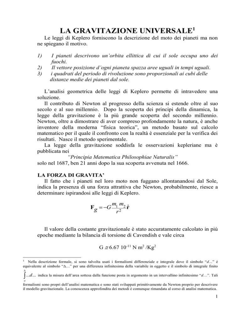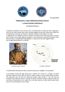 LA GRAVITAZIONE UNIVERSALE1 Le leggi di Keplero forniscono la descrizione del moto dei pianeti ma non ne spiegano il motivo. 1) 2) 3) I pianeti descrivono un’orbita ellittica di cui il sole occupa uno dei fuochi. Il vettore posizione d’ogni pianeta spazza aree uguali in tempi uguali. i quadrati del periodo di rivoluzione sono proporzionali ai cubi delle distanze medie dei pianeti dal sole. L’analisi geometrica delle leggi di Keplero permette di intravedere una soluzione. Il contributo di Newton al progresso della scienza si estende oltre al suo secolo e al suo millennio. Dopo la scoperta dei principi della dinamica, la legge della gravitazione è la più grande scoperta del secondo millennio. Newton, oltre a dimostrare di aver compreso profondamente la natura, è anche inventore della moderna “fisica teorica”, un metodo basato sul calcolo matematico per il quale il confronto con la realtà è essenziale per la verifica dei risultati. Nasce il metodo sperimentale. La legge della gravitazione soddisfa le osservazioni kepleriane ma è pubblicata nei “Principia Matematica Philosophiae Naturalis” solo nel 1687, ben 21 anni dopo la sua scoperta avvenuta nel 1666. LA FORZA DI GRAVITA’ Il fatto che i pianeti nel loro moto non fuggano allontanandosi dal Sole, indica la presenza di una forza attrattiva che Newton, probabilmente, riesce a determinare ispirandosi alle leggi di Keplero. Fg G m1 m2 rˆ r2 Il valore della costante gravitazionale è stato accuratamente calcolato in più epoche mediante la bilancia di torsione di Cavendish e vale circa G 6.67 10-11 N m2 /Kg2 Nella descrizione formale, si sono talvolta usati i formalismi differenziale e integrale dove il simbolo “d…” è equivalente al simbolo “…” per una differenza infinitesima della variabile in oggetto e il simbolo di integrale finito 1 b ...d... indica la misura dell’area sottesa dalla funzione posta in argomento in un intervallino infinitesimo “d…”. Tali a formalismi sono propri dell’analisi matematica e sono stati sviluppati primitivamente da Newton proprio per descrivere il modello gravitazionale. La conoscenza approfondita dei metodi è comunque rimandata al corso di analisi matematica. 1 D’altra parte, i pianeti non precipitano tuffandosi nel Sole, ciò indica la presenza di una seconda forza che li costringe a muoversi lungo una traiettoria ellittica. Le caratteristiche geometriche dell’orbita sono determinate dalla condizione di equilibrio tra le forze agenti e dal momento angolare. Sul corpo orbitante il lavoro delle forze è nullo. Il punto in cui il pianeta è più distante dal Sole è l’apogeo, il più vicino è il perigeo. IL CAMPO GRAVITAZIONALE La forza gravitazionale per agire non ha bisogno di contatto, agisce per effetto del campo. Quando è presente un corpo di massa M, ad ogni punto dello spazio è associato un vettore accelerazione di intensità G F M G 2 m r il vettore è diretto verso il baricentro del corpo stesso, il centro di gravità. La distribuzione vettoriale dei valori di accelerazione associati ad ogni punto dello spazio è detto campo gravitazionale della massa M. L’intensità del campo è la gravità. IL POTENZIALE GRAVITAZIONALE L’energia acquistata da un corpo in uno spostamento infinitesimo è un valore scalare che dipende dal lavoro delle forze locali e dalla direzione di moto: dW (F1 F2 ... Fn ) ds Nel caso gravitazionale, si considerano gli spostamenti nella direzione delle linee di campo 2 Γ G1 G2 ... Gn . L’energia per unità di massa acquistata da un corpo in uno spostamento infinitesimo è d dW Γ ds m L’energia per unità di massa acquistata nel passaggio dalla posizione all’infinito alla posizione attuale è il potenziale gravitazionale cambiato di segno. Valgono perciò le relazioni: r d G ( M1 M 2 M ... n ) , r1 r2 rn grad . L’ENERGIA POTENZIALE Una forza agente su di un corpo compie un lavoro solo se non è perpendicolare alla direzione di moto. Il lavoro svolto aumenta l’energia cinetica del corpo. La gravità è una forza centrale che contribuisce alla variazione di energia del sistema agendo sempre radialmente nella direzione dell’origine del campo: r // Fg . Su di un corpo di massa m, il lavoro dW Fds prodotto dal campo di un grave di massa M, è nullo solo all’infinito. Quando il corpo si trova a distanza r dall’origine, l’energia di posizione riferita all’infinito è l’energia potenziale gravitazionale r r E p W.r dE p Fg ds G Mm m r . Differenziando segue, d Fg grad E p E p rˆ m dr 3 La variazione di energia cinetica di un grave dipende solo dalla variazione di energia potenziale nel passaggio tra due posizioni: Ec E p,1 E p,2 . Il lavoro non dipende dal percorso seguito, la forza è conservativa. ENERGIA E MOTO ORBITALE (come applicazione) Un corpo in movimento in un campo gravitazionale segue traiettorie determinate dalla condizione di bilanciamento delle forze agenti trasversalmente al moto. Sul corpo agiscono simultaneamente la forza gravitazionale e la forza centrifuga Mm r2 mv 2 Fc r , Fg G rappresentate da vettori di intensità e direzione uguale, ma verso opposto. Per un moto naturalmente accelerato, dalla condizione Fg Fc si ottiene la componente di velocità dovuta all’azione del campo gravitazionale M v G r 12 Nel calcolo dell’energia cinetica complessiva si considera anche la velocità di approccio, cioè la velocità all’infinito v del corpo 1 mM 1 2 Ec m(v 2 v2 ) G mv 2 2r 2 L’energia totale del corpo immerso nel campo è data dall’energia cinetica più la potenziale E Ec E p G mM 1 2 mv 2r 2 4 per energia totale E < 0 “ E=0 “ E>0 l’orbita è ellittica “ parabolica “ iperbolica 5