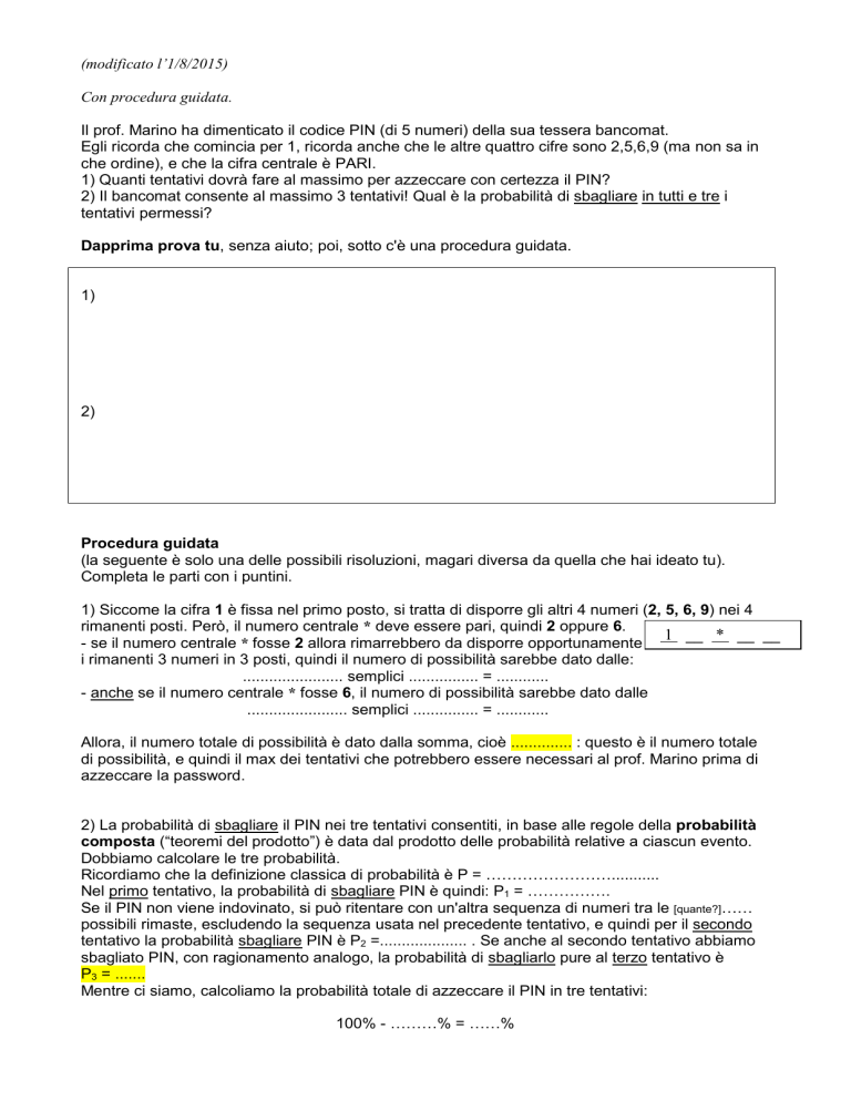 (modificato l’1/8/2015) Con procedura guidata. Il prof. Marino ha dimenticato il codice PIN (di 5 numeri) della sua tessera bancomat. Egli ricorda che comincia per 1, ricorda anche che le altre quattro cifre sono 2,5,6,9 (ma non sa in che ordine), e che la cifra centrale è PARI. 1) Quanti tentativi dovrà fare al massimo per azzeccare con certezza il PIN? 2) Il bancomat consente al massimo 3 tentativi! Qual è la probabilità di sbagliare in tutti e tre i tentativi permessi? Dapprima prova tu, senza aiuto; poi, sotto c'è una procedura guidata. 1) 2) Procedura guidata (la seguente è solo una delle possibili risoluzioni, magari diversa da quella che hai ideato tu). Completa le parti con i puntini. 1) Siccome la cifra 1 è fissa nel primo posto, si tratta di disporre gli altri 4 numeri (2, 5, 6, 9) nei 4 rimanenti posti. Però, il numero centrale * deve essere pari, quindi 2 oppure 6. 1 __ * __ __ - se il numero centrale * fosse 2 allora rimarrebbero da disporre opportunamente i rimanenti 3 numeri in 3 posti, quindi il numero di possibilità sarebbe dato dalle: ....................... semplici ................ = ............ - anche se il numero centrale * fosse 6, il numero di possibilità sarebbe dato dalle ....................... semplici ............... = ............ Allora, il numero totale di possibilità è dato dalla somma, cioè .............. : questo è il numero totale di possibilità, e quindi il max dei tentativi che potrebbero essere necessari al prof. Marino prima di azzeccare la password. 2) La probabilità di sbagliare il PIN nei tre tentativi consentiti, in base alle regole della probabilità composta (“teoremi del prodotto”) è data dal prodotto delle probabilità relative a ciascun evento. Dobbiamo calcolare le tre probabilità. Ricordiamo che la definizione classica di probabilità è P = ……………………........... Nel primo tentativo, la probabilità di sbagliare PIN è quindi: P1 = ……………. Se il PIN non viene indovinato, si può ritentare con un'altra sequenza di numeri tra le [quante?]…… possibili rimaste, escludendo la sequenza usata nel precedente tentativo, e quindi per il secondo tentativo la probabilità sbagliare PIN è P2 =.................... . Se anche al secondo tentativo abbiamo sbagliato PIN, con ragionamento analogo, la probabilità di sbagliarlo pure al terzo tentativo è P3 = ....... Mentre ci siamo, calcoliamo la probabilità totale di azzeccare il PIN in tre tentativi: 100% - ………% = ……%
