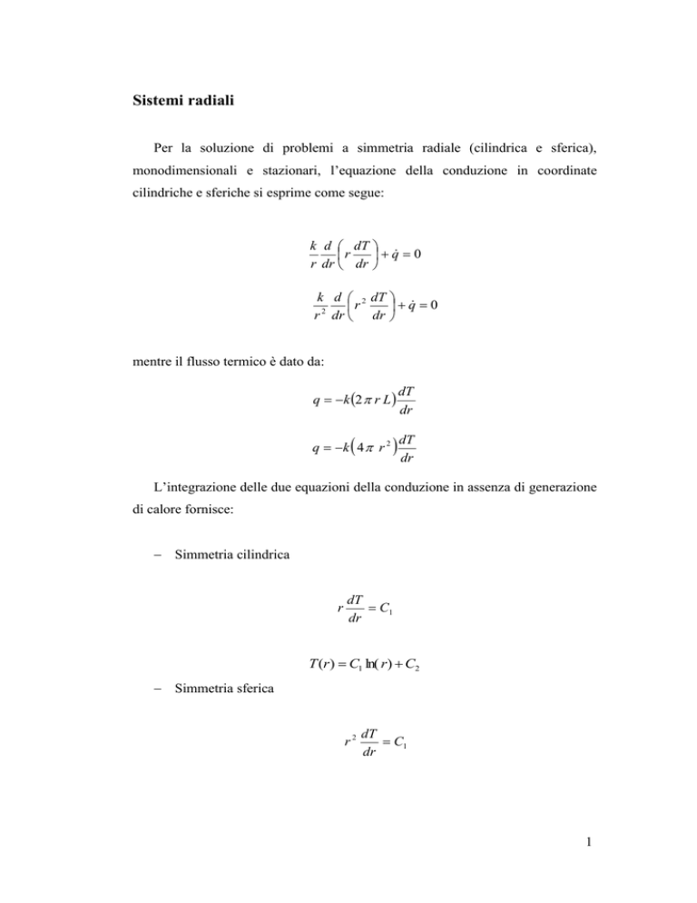 Sistemi radiali Per la soluzione di problemi a simmetria radiale (cilindrica e sferica), monodimensionali e stazionari, l’equazione della conduzione in coordinate cilindriche e sferiche si esprime come segue: k d dT r q 0 r dr dr k d 2 dT r q 0 r 2 dr dr mentre il flusso termico è dato da: q k 2 r L q k 4 r 2 dT dr dT dr L’integrazione delle due equazioni della conduzione in assenza di generazione di calore fornisce: Simmetria cilindrica r dT C1 dr T (r ) C1 ln( r ) C2 Simmetria sferica r2 dT C1 dr 1 T (r ) C1 C2 r Strato cilindrico omogeneo Le costanti di integrazione C1 e C2 si ottengono imponendo le condizioni al contorno T(r1) = Tr,1 e T(r2) = Tr,2 e risolvendo il sistema. Il risultato cui si perviene è: T (r ) Tr ,1 Tr , 2 r ln Tr , 2 r r ln 1 2 r2 L’andamento della temperatura all’interno dello strato è logaritmico. Allo stesso risultato si perviene utilizzando le espressioni del flusso termico che, in regime stazionario, è costante, cioè indipendente da r: q k 2 r L dT costante dr 2 Separando le variabili: q dr k 2 L dT r Integrando tra r1 e r2 q r2 r1 dr k 2 L Tr , 2 Tr ,1 r q ln r2 k 2 L (Tr ,1 Tr , 2 ) r1 q ln r2 k 2 L (T (r ) Tr , 2 ) r Integrando tra r e r2: Dividendo membro a membro le ultime due relazioni si ottiene: T (r ) Tr , 2 Tr ,1 Tr , 2 r r2 r ln 1 r2 ln Risolvendo invece rispetto a q: q k 2 L (Tr ,1 Tr , 2 ) (Tr ,1 Tr , 2 ) r r 1 ln 2 ln 2 r1 k 2 L r1 Il denominatore rappresenta la resistenza termica dello strato cilindrico: 3 R r 1 ln 2 k 2 L r1 ovvero con riferimento all’unità di lunghezza: R' 1 2 k ln r2 r1 strato cilindrico composto Con procedimento analogo a quello illustrato nel caso delle pareti multistrato il flusso termico sarà proporzionale alla differenza di temperatura dei fluidi a contatto e inversamente proporzionale alla somma di tutte le resistenze che il calore incontra: 4 q' T ,1 T , 2 r r r 1 1 1 1 1 ln 2 ln 3 ln 4 2 r1 h1 2 k A r1 2 k B r2 2 k C r3 2 r4 h4 L’espressione può essere scritta in termini di un coefficiente globale di trasmissione U1: q' U 1 2 r1 T ,1 T , 2 oppure in termini di un coefficiente U2: q' U 2 2 r2 T ,1 T , 2 dove U12r1 = U22r2 = … Esempio L’esistenza di uno spessore ottimale dell’isolamento termico di una tubazione è suggerita dalla presenza di due effetti antagonisti: al crescere dello spessore cresce la resistenza conduttiva al crescere dello spessore cresce l’area a contatto del fluido e quindi diminuisce la resistenza convettiva Esisterà quindi uno spessore dell’isolante che massimizza la resistenza termica totale, somma delle componenti conduttiva e convettiva. Si richiede di affrontare questo problema con riferimento al seguente sistema: 1. un tubo di rame di raggio ri viene utilizzato per trasportare un refrigerante a temperatura Ti inferiore a quella ambiente T. Esiste uno spessore ottimale dell’isolante? 5 2. Si confermi il risultato relativo al punto 1) calcolando la resistenza totale per unità di lunghezza di un tubo di 10 mm di diametro considerando gli spessori: 0, 2, 5, 10, 20, 40 mm. La conducibilità dell’isolante è k=0.055 W/mK e il coefficiente di convezione h=5 W/m2K. Soluzione Dati: Raggio interno e temperatura del tubo di rame; conducibilità e coefficiente di convezione Obiettivo: 1. Verificare se esiste uno spessore ottimale dell’isolante che minimizza lo scambio termico; 2. Calcolare la resistenza totale assumendo differenti spessori dell’isolante. Schema: : Ipotesi semplificative: Condizioni stazionarie Campo termico monodimensionale Resistenza conduttiva del tubo trascurabile 6 Scambi radianti trascurabili Analisi: Lo schema elettrico equivalente è: Sommando le due resistenze: ' Rtot ln( r / ri ) 1 2 k 2 r h Il flusso termico q’ è dato da: q' T Ti ' Rtot Lo spessore che massimizza o minimizza la resistenza deve soddisfare la condizione: ' dRtot 0 dr quindi 1 1 0 2 k r 2 r 2 h Poiché per r = k/h è r k h ' d 2 Rtot 0 (concavità verso l’alto), la resistenza presenta dr 2 un minimo e dunque non esiste uno spessore ottimale dell’isolante. 7 Il risultato trovato induce a ragionare piuttosto in termini di raggio critico: rcr k h al disotto del quale il flusso q’ cresce all’aumentare di r. Con i valori numerici assegnati il raggio critico risulta: rcr 0.055W / mK 0.011 m 5W / m 2 K Poiché il raggio del tubo (ri = 0.005 m) risulta inferiore al raggio critico per valori di r compresi tra ri e rcr l’effetto dell’isolamento sarà di accrescere il flusso termico. Il diagramma che segue mostra gli andamenti delle resistenze conduttiva, convettiva e totale in funzione della differenza (r – ri) che rappresenta lo spessore dell’isolante. Commenti: 1. Si osservi che anche per spessori dell’isolante di 20 mm la resistenza è inferiore a quella del tubo non isolato; 8 2. Per ri < rcr, come in questo caso, la resistenza totale diminuisce ed il flusso termico aumenta all’aumentare dell’isolamento. Questo effetto è desiderato nel caso di conduttori elettrici per i quali la dissipazione jouleiana verso l’esterno risulta favorita. Viceversa, per ri>rcr l’isolamento riduce sempre il flusso termico e questo effetto è favorevole nel caso nel caso di tubi che veicolano fluidi a temperatura maggiore di quella ambiente; 3. La diminuzione della resistenza all’aumentare dello spessore dell’isolante si verifica solo per tubi piccoli o per coefficienti di convezione bassi, Per valori tipici della conducibilità (k=0.03 W/mK) e nel caso di convezione in aria (h=10 W/m2K) il raggio critico risulta rcr=0.003 m, ragion per cui questa criticità in pratica non esiste, salvo che per i conduttori elettrici. In questo caso la guaina protettiva, che ha una conducibilità dell’ordine di 0.3 W/mK, incrementa il raggio critico di un ordine di grandezza (da 3 mm a 3 cm) interessando gran parte delle applicazioni elettriche. 4. Il raggio critico si manifesta soltanto per simmetrie cilindriche e sferiche e non per quella piana, per la quale la resistenza convettiva