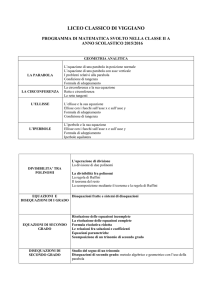 ANNO SCOLASTICO 2012/13 PROGRAMMA FINALE DI MATEMATICA - CLASSE 3 C Testo in uso : Bergamini – Trifone – Barozzi : MANUALE BLU 2.0 DI MATEMATICA - Zanichelli Modulo S – Equazioni, disequazioni e funzioni Capitolo 1 : Equazioni e disequazioni Le disequazioni e le loro proprietà; le disequazioni di grado superiore al secondo; le disequazioni irrazionali e con valore assoluto. Risoluzione grafica di semplici disequazioni modulari e irrazionali . Unità 2 : Le funzioni Le funzioni e le loro caratteristiche. Grafici di funzioni traslate, simmetriche rispetto all’asse x, dilatate. Grafico di y f (x) . Modulo L – Geometria analitica Capitolo : Il piano cartesiano La distanza di un punto da una retta; la bisettrice di un angolo; i fasci di rette. Cappitolo : La circonferenza La circonferenza e la sua equazione; le posizioni di una retta rispetto ad una circonferenza; le rette tangenti ad una circonferenza; alcune condizioni per determinare l’equazione di una circonferenza; la posizione di due circonferenze; i fasci di circonferenze. Cappitolo : La parabola La parabola e la sua equazione; le posizioni di una retta rispetto ad una parabola; le rette tangenti ad una parabola; alcune condizioni per determinare l’equazione di una parabola. Unità 4 : L’ellisse L’ellisse e la sua equazione; le posizioni di una retta rispetto ad un’ellisse; le rette tangenti ad un’ ellisse; formula dello sdoppiamento ; alcune condizioni per determinare l’equazione di un’ ellisse; l’ellisse traslata. Unità 5 : L’iperbole L’iperbole riferita al centro e agli assi e la sua equazione ; asintoti di una iperbole. Modulo O - Goniometria Capitolo 10 : Le funzioni goniometriche La misura degli angoli; le funzioni seno e coseno; la funzione tangente; le funzioni goniometriche di angoli particolari; le funzioni goniometriche inverse; i grafici delle funzioni goniometriche e le trasformazioni geometriche. Capitolo 11 : Le formule goniometriche Gli angoli associati; le formule di addizione e sottrazione; le formule di duplicazione; le formule di bisezione; il periodo delle funzioni goniometriche. Capitolo 12 : Le equazioni e le disequazioni goniometriche Le equazioni goniometriche elementari; le equazioni lineari in seno e coseno; le equazioni omogenee di secondo grado in seno e coseno; le disequazioni goniometriche. Modulo Q - Trigonometria Capitolo 13 : La trigonometria I triangoli rettangoli; applicazione dei teoremi sui triangoli rettangoli; i triangoli qualunque; le applicazioni della trigonometria. Le trasformazioni geometriche Traslazione e relative equazioni : dilatazione e relative equazioni. Risoluzione approssimata di una equazione Metodo di bisezione. L'insegnante I rappresentanti Maria Milani Luino, 8 giugno 2013