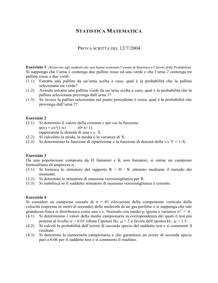 STATISTICA MATEMATICA PROVA SCRITTA DEL 12/7/2004 Esercizio 1 (Riservato agli studenti che non hanno sostenuto l’esame di Statistica e Calcolo delle Probabilità) Si supponga che l’urna 1 contenga due palline rosse ed una verde e che l’urna 2 contenga tre palline rosse e due verdi. (1.1) Estratta una pallina da un’urna scelta a caso, qual è la probabilità che la pallina selezionata sia verde? (1.2) Avendo estratto una pallina verde da un’urna scelta a caso, qual è la probabilità che la pallina selezionata provenga dall’urna 1? (1.3) Se invece la pallina selezionata nel punto precedente è rossa, qual è la probabilità che provenga dall’urna 2? Esercizio 2 (2.1) Si determini il valore della costante c per cui la funzione (x) = cx2(1-x) (0<x<1) rappresenta la densità di una v.c. X. (2.2) Si calcolino la moda, la media e la varianza di X. (2.3) Si determinino la funzione di ripartizione e la funzione di densità della v.c Y = 1-X. Esercizio 3 Da una popolazione composta da H fumatori e K non fumatori, si estrae un campione bernoulliano di ampiezza n. (3.1) Si fornisca lo stimatore del rapporto R = H / K ottenuto mediante il metodo dei momenti. (3.2) Si determini lo stimatore di massima verosimiglianza per R. (3.3) Si stabilisca se il suddetto stimatore di massima verosimiglianza è corretto. Esercizio 4 Si consideri un campione casuale di n = 81 rilevazioni della componente verticale della velocità (espressa in metri al secondo) delle molecole di un gas perfetto e si supponga che tale grandezza fisica si distribuisca come una v.c. Normale con media ignota e varianza 2 = 4. (4.1) Si determinino i valori della media campionaria in corrispondenza dei quali il test più potente al livello = 0.01 rifiuta l’ipotesi H0: = 2 a favore dell’ipotesi H1: = 1.5. (4.2) Si calcoli la probabilità dell’errore di seconda specie del suddetto test e si commenti il risultato. (4.3) Si determini la numerosità campionaria n che garantisce un errore di seconda specie pari a 0.06 per il suddetto test e si commenti il risultato.
