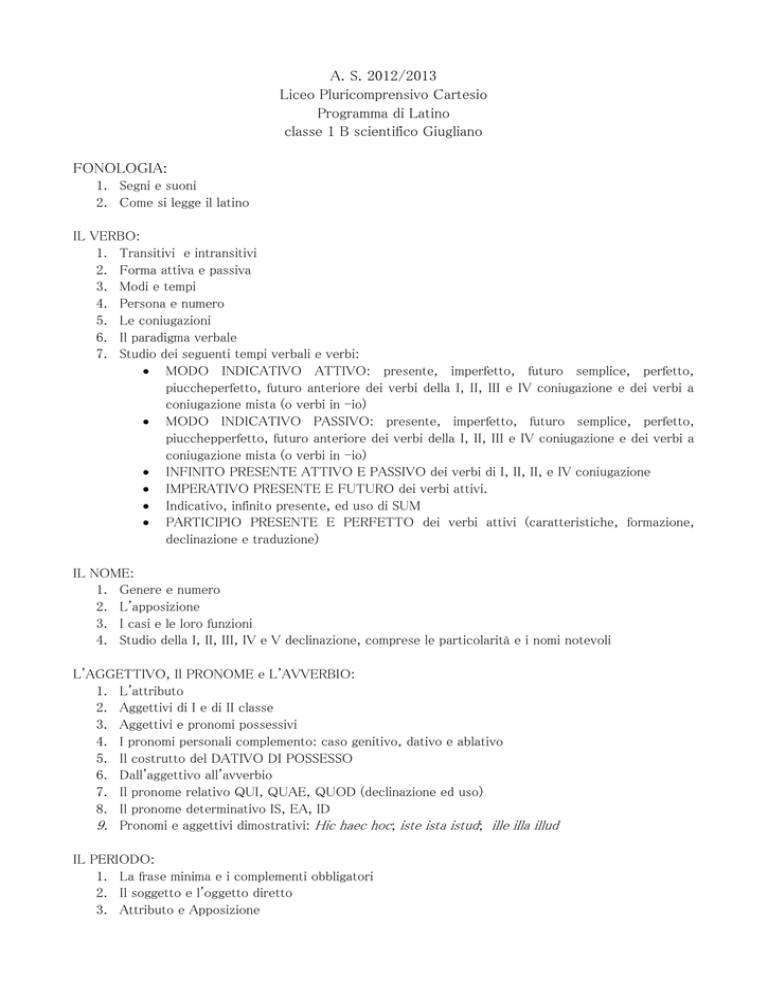A. S. 2012/2013 Liceo Pluricomprensivo Cartesio Programma di Latino classe 1 B scientifico Giugliano FONOLOGIA: 1. Segni e suoni 2. Come si legge il latino IL VERBO: 1. Transitivi e intransitivi 2. Forma attiva e passiva 3. Modi e tempi 4. Persona e numero 5. Le coniugazioni 6. Il paradigma verbale 7. Studio dei seguenti tempi verbali e verbi: MODO INDICATIVO ATTIVO: presente, imperfetto, futuro semplice, perfetto, piuccheperfetto, futuro anteriore dei verbi della I, II, III e IV coniugazione e dei verbi a coniugazione mista (o verbi in -io) MODO INDICATIVO PASSIVO: presente, imperfetto, futuro semplice, perfetto, piucchepperfetto, futuro anteriore dei verbi della I, II, III e IV coniugazione e dei verbi a coniugazione mista (o verbi in -io) INFINITO PRESENTE ATTIVO E PASSIVO dei verbi di I, II, II, e IV coniugazione IMPERATIVO PRESENTE E FUTURO dei verbi attivi. Indicativo, infinito presente, ed uso di SUM PARTICIPIO PRESENTE E PERFETTO dei verbi attivi (caratteristiche, formazione, declinazione e traduzione) IL NOME: 1. Genere e numero 2. L'apposizione 3. I casi e le loro funzioni 4. Studio della I, II, III, IV e V declinazione, comprese le particolarità e i nomi notevoli L'AGGETTIVO, Il PRONOME e L'AVVERBIO: 1. L'attributo 2. Aggettivi di I e di II classe 3. Aggettivi e pronomi possessivi 4. I pronomi personali complemento: caso genitivo, dativo e ablativo 5. Il costrutto del DATIVO DI POSSESSO 6. Dall'aggettivo all'avverbio 7. Il pronome relativo QUI, QUAE, QUOD (declinazione ed uso) 8. Il pronome determinativo IS, EA, ID 9. Pronomi e aggettivi dimostrativi: Hic haec hoc; iste ista istud; ille illa illud IL PERIODO: 1. La frase minima e i complementi obbligatori 2. Il soggetto e l'oggetto diretto 3. Attributo e Apposizione 4. I COMPLEMENTI: di specificazione di termine d' agente e di causa efficiente di mezzo di modo di compagnia e di unione di causa di vocazione predicativo del soggetto e dell'oggetto di tempo determinato e continuato di materia di argomento di qualità I complementi di luogo 5. LE DETERMINAZIONI di LUOGO e le PREPOSIZIONI delle determinazioni di luogo 6. Le PROPOSIZIONI SUBORDINATE: la proposizione relativa la proposizione temporale la proposizione causale l'ABLATIVO ASSOLUTO La docente prof. Roberta Papa