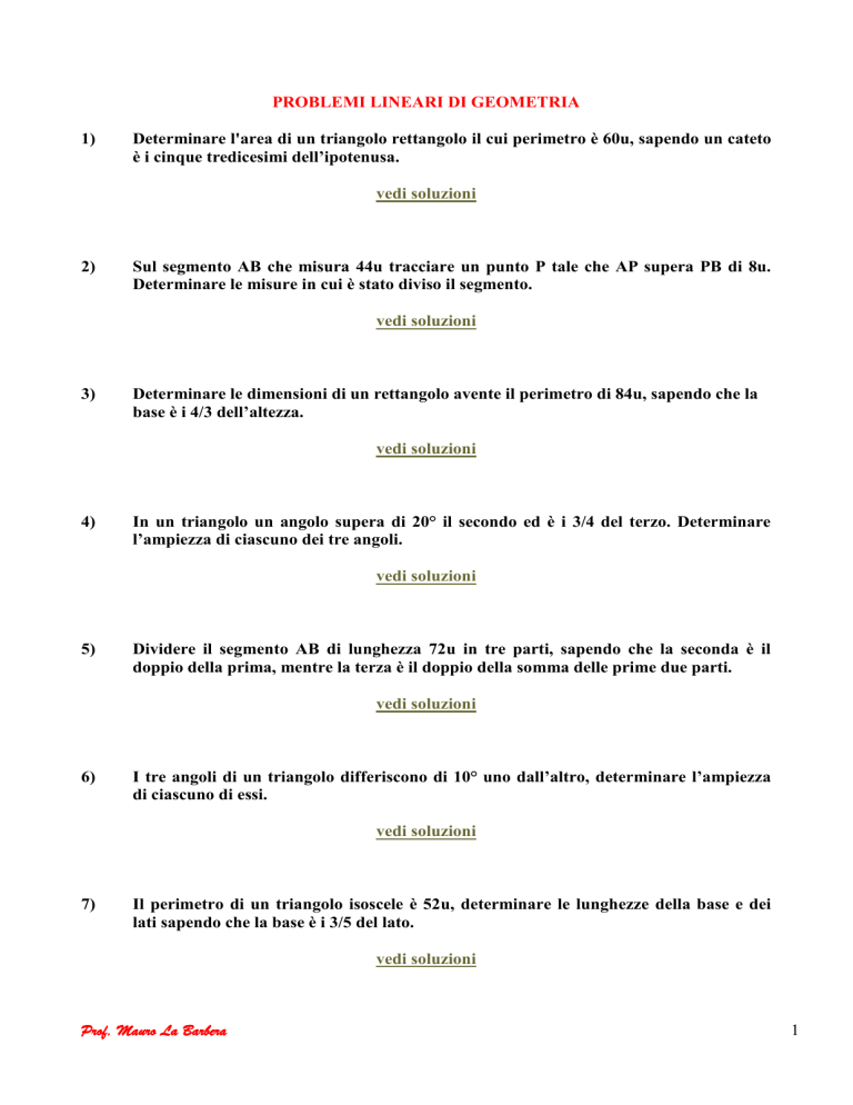PROBLEMI LINEARI DI GEOMETRIA 1) Determinare l'area di un triangolo rettangolo il cui perimetro è 60u, sapendo un cateto è i cinque tredicesimi dell’ipotenusa. vedi soluzioni 2) Sul segmento AB che misura 44u tracciare un punto P tale che AP supera PB di 8u. Determinare le misure in cui è stato diviso il segmento. vedi soluzioni 3) Determinare le dimensioni di un rettangolo avente il perimetro di 84u, sapendo che la base è i 4/3 dell’altezza. vedi soluzioni 4) In un triangolo un angolo supera di 20° il secondo ed è i 3/4 del terzo. Determinare l’ampiezza di ciascuno dei tre angoli. vedi soluzioni 5) Dividere il segmento AB di lunghezza 72u in tre parti, sapendo che la seconda è il doppio della prima, mentre la terza è il doppio della somma delle prime due parti. vedi soluzioni 6) I tre angoli di un triangolo differiscono di 10° uno dall’altro, determinare l’ampiezza di ciascuno di essi. vedi soluzioni 7) Il perimetro di un triangolo isoscele è 52u, determinare le lunghezze della base e dei lati sapendo che la base è i 3/5 del lato. vedi soluzioni Prof. Mauro La Barbera 1 8) In un rettangolo la base supera di 4u il doppio dell’altezza e il perimetro è di 26u. Determinare l’area della figura. vedi soluzioni 9) La quarta parte della base di un rettangolo supera di 5u la metà dell’altezza, determinare la diagonale del rettangolo sapendo che il perimetro della figura è 124u. vedi soluzioni 10) La somma delle diagonali di un rombo è 112u, inoltre, i 3/8 della maggiore sono uguali alla metà della minore. Determinare l’area della figura. vedi soluzioni Prof. Mauro La Barbera 2