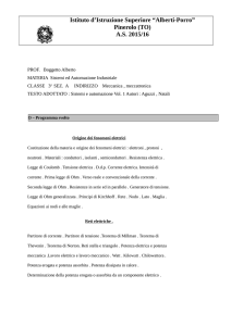 TECNOLOGIA DISEGNO E PROGETTAZIONE 3 B-ET A.S.2000/2001 OBIETTIVI CONOSCITIVI Per poter accedere alla quarta classe si richiede che gli studenti abbiano raggiunto i seguenti obiettivi: 1) conoscenza dei principali componenti passivi indicati nel programma 2) conoscenza di simboli e indicazioni utilizzati per il disegno di impianti civili e industriali 3) saper realizzare il disegno di un impianto e di un circuito tramite il pacchetto ORCADWIN\CAPTURE 4) conoscenza delle regole per il cablaggio di un semplice impianto, per la realizzazione di un circuito filato e/o per lo sbroglio a mano di un circuito stampato 5) minime capacità di analisi e di progettazione di semplici impianti civili e industriali da realizzare in base alle conoscenze acquisite nella stessa materia 6) minime capacità di analisi e di progettazione di semplici circuiti elettronici da realizzare in base alle conoscenze acquisite nel corso medesimo (Elettronica) 7) essere in grado di stendere una relazione completa di preventivo spese sulle prove effettuate utilizzando WORD; nella relazione devono essere indicati i calcoli di progetto necessari a dimensionare i vari elementi presenti nel circuito e i criteri in base ai quali sono state fatte particolari scelte di progetto 8) usare un linguaggio tecnico appropriato. PROGRAMMA DI TDP Anno 2000/2001 TECNOLOGIA RESISTORI: Caratteristiche generali: Coefficiente di temperatura Potenza dissipabile nominale Comportamento alle alte frequenze Normalizzazioni , serie E12 Codice colore Stabilità Tolleranza Vari tipi di resistori: Resistori a strato spesso e sottile Resistori a filo Potenziometri: Generalità Leggi di variazione in funzione del cursore. Classe 3Bet CONDENSATORI: Legge che ne descrive il comportamento Caratteristiche costruttive Parametri caratteristici dei condensatori: Tolleranza Tensione nominale Coefficiente di temperatura Resistenza di isolamento Fattore di perdita Vari tipi di condensatori: Condensatori con dielettrico plastico Condensatori ceramici Condensatori elettrolitici in alluminio e al tantalio Condensatori variabili Legge di variazione della capacità Compensatori di capacità Codice colori per i condensatori STRUTTURA DELL'ATOMO Meccanica quantistica Definizione di orbitale Tavola periodica Semiconduttori Bande di energia SEMICONDUTTORI INTRINSECI E DROGATI: Conduzione nei metalli Conduzione nei semiconduttori intrinseci e drogati Legge dell'azione di massa e della neutralità della carica Pacchetti software: WORD - EXCEL - ORCADWIN\CAPTURE – STEP7 DISEGNO Si sono realizzate le tavole relative agli impianti elettrici civili ed industriali, ai circuiti digitali realizzati in laboratorio. Nella realizzazione dei disegni si è fatto uso del pacchetto ORCADWIN\CAPTURE. PROGETTAZIONE Antinfortunistica Simbologia Si sono realizzati i seguenti impianti civili elettrici: Impianto Interrotto, deviato, commutato, invertito. Impianti elettrici civili con relè: Impianto con relè commutatore e con relè interruttore. Impianti industriali: Impianti dimostrativi con relè octal e con relè undecal e temporizzatore Aviatore marcia-arresto, teleinvertitore senza passaggio all'alt, automatismo con relè temporizzatori, fotocellula , interruttore di prossimità e finecorsa. PLC : Siemens S5 Introduzione storica, stuttura hardware, software di gestione: STEP7 Circuiti digitali: PROGETTO: Sonda Logica: si è realizzato il progetto del circuito, il master, assemblaggio componenti. Ogni impianto o circuito realizzato è stato accompagnato dalla realizzazione di una relazione e da una tabella dei costi il tutto redatto col pacchetto software WORD. Dopo ogni tipo di impianto è stato proposto alla classe un progetto mai realizzato precedentemente. Si richiede quindi la capacità di progettazione. AREA DI PROGETTO TITOLO: IL CIELO E IL TEMPO DESCRIZIONE: Gli studenti conosceranno come anticamente si ci si poneva rispetto all’osservazione del cielo e alla misura del tempo: si ripercorre il cammino dell'uomo verso la conoscenza della realtà, si va dall'osservazione dei cicli naturali alla costruzione di un sistema cosmologico razionale. E' previsto un momento applicativo: costruzione di un orologio solare con materiale di recupero. Si prevede la compilazione di documentazione di tipo anche multimediale consultabile da chiunque sia interessato a chiusura del progetto eventualmente negli anni sucessivi. Si prevede infine la realizzazione negli anni successivi di un orologio elettronico digitale. Data............................ Insegnante: Vasi Donatella SCHEMI IMPIANTI ELETTRICI CIVILI ED INDUSTRIALI REALIZZATI NELL'A.S 2000/01 ESERCIZI DA SVOLGERE DURANTE L'ESTATE PER COLMARE IL DEBITO FORMATIVO SCHEMI CIRCUITI DIGITALI