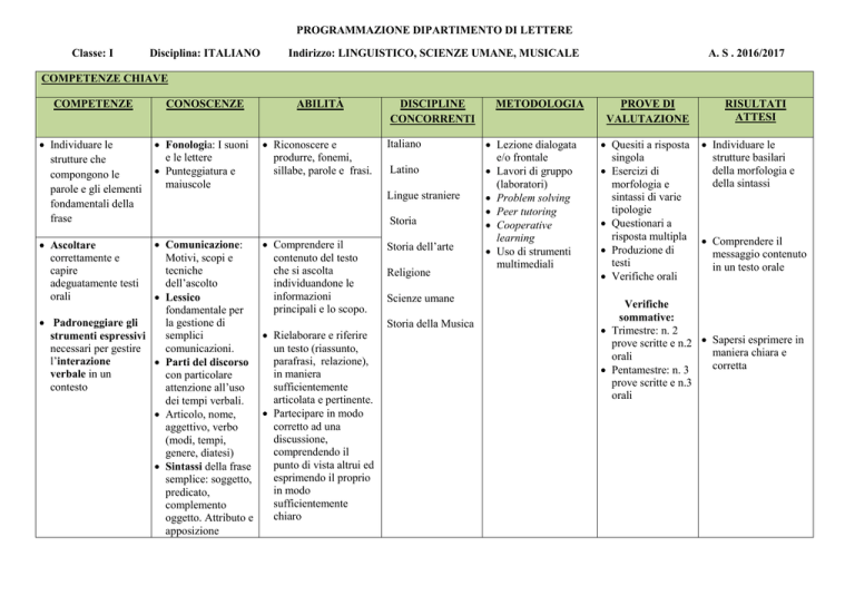 PROGRAMMAZIONE DIPARTIMENTO DI LETTERE Classe: I Disciplina: ITALIANO Indirizzo: LINGUISTICO, SCIENZE UMANE, MUSICALE A. S . 2016/2017 COMPETENZE CHIAVE COMPETENZE Individuare le strutture che compongono le parole e gli elementi fondamentali della frase CONOSCENZE Fonologia: I suoni e le lettere Punteggiatura e maiuscole ABILITÀ Riconoscere e produrre, fonemi, sillabe, parole e frasi. Comunicazione: Comprendere il Motivi, scopi e contenuto del testo tecniche che si ascolta dell’ascolto individuandone le informazioni Lessico principali e lo scopo. fondamentale per la gestione di Padroneggiare gli semplici Rielaborare e riferire strumenti espressivi necessari per gestire comunicazioni. un testo (riassunto, l’interazione parafrasi, relazione), Parti del discorso verbale in un in maniera con particolare contesto sufficientemente attenzione all’uso articolata e pertinente. dei tempi verbali. Partecipare in modo Articolo, nome, corretto ad una aggettivo, verbo discussione, (modi, tempi, comprendendo il genere, diatesi) punto di vista altrui ed Sintassi della frase esprimendo il proprio semplice: soggetto, in modo predicato, sufficientemente complemento chiaro oggetto. Attributo e apposizione Ascoltare correttamente e capire adeguatamente testi orali DISCIPLINE CONCORRENTI Italiano Latino Lingue straniere Storia Storia dell’arte Religione Scienze umane Storia della Musica METODOLOGIA Lezione dialogata e/o frontale Lavori di gruppo (laboratori) Problem solving Peer tutoring Cooperative learning Uso di strumenti multimediali PROVE DI VALUTAZIONE Quesiti a risposta singola Esercizi di morfologia e sintassi di varie tipologie Questionari a risposta multipla Produzione di testi Verifiche orali RISULTATI ATTESI Individuare le strutture basilari della morfologia e della sintassi Comprendere il messaggio contenuto in un testo orale Verifiche sommative: Trimestre: n. 2 prove scritte e n.2 Sapersi esprimere in maniera chiara e orali corretta Pentamestre: n. 3 prove scritte e n.3 orali COMPETENZE CHIAVE COMPETENZE Leggere e comprendere testi scritti CONOSCENZE ABILITÀ Conoscere tecniche Leggere, anche ad alta e strategie di voce, comprendere ed lettura. Testo interpretare testi scritti narrativo e generi di vario tipo: letterari della narrativa: e non letterari fiaba, favola, novella, romanzo Conoscere caratteristiche, temi e significati del mito. Caratteristiche del genere epico. Iliade e Odissea Produrre testi Conoscere le scritti su argomenti tecniche e le e per scopi diversi strategie di scrittura relative ai diversi tipi di teso. Testi narrativi, descrittivi, informativoespositivi (riassunto, tema espositivo, relazione). Scegliere la modalità di scrittura in relazione allo scopo Pianificare e produrre un testo in relazione alla situazione comunicativa DISCIPLINE CONCORRENTI METODOLOGIA PROVE DI VALUTAZIONE RISULTATI ATTESI Saper leggere e comprendere un testo semplice Produrre un testo scritto corretto e coerente PROGRAMMAZIONE DIPARTIMENTO DI LETTERE Classe: I Disciplina: LATINO Indirizzo: LINGUISTICO, SCIENZE UMANE A. S . 2016/2017 COMPETENZE CHIAVE COMPETENZE Leggere un testo semplice in lingua latina Usare il lessico studiato in funzione della comprensione di frasi o brevi testi con relativa traduzione Individuare le strutture principali morfosintattiche all’interno di un CONOSCENZE Fonologia: suoni, accenti e parole Flessione nominale: prima declinazione Flessione verbale: indicativo presente e imperfetto e infinito presente di sum; indicativo e infinito presente delle quattro coniugazioni attive/passive; indicativo imperfetto delle quattro coniugazioni attive/passive Sintassi Complementi: luogo, d’agente e causa efficiente, mezzo, modo compagnia e unione, vantaggio e svantaggio, predicativo del soggetto e dell’oggetto Morfologia Seconda declinazione. Aggettivi della prima classe ABILITÀ DISCIPLINE CONCORRENTI Leggere, anche ad alta voce, testi in lingua latina Italiano Tradurre frasi e/o brani semplificati con sufficiente correttezza rispettando la morfologia e il lessico Storia Analizzare i testi e riconosce le strutture morfosintattiche Lingue straniere Storia dell’arte Religione METODOLOGIA Lezione dialogata e/o frontale Lavori di gruppo (laboratori) Problem solving Peer tutoring Cooperative learning Uso di strumenti multimediali PROVE DI VALUTAZIONE RISULTATI ATTESI Esercizi di varie tipologie. Traduzioni di frasi e semplici testi. Verifiche orali Conoscere gli elementi fondamentali della fonologia, morfologia e sintassi della lingua latina Verifiche sommative: Trimestre: n. 2 prove scritte e n. 2 orali Pentamestre: n. 3 prove scritte e n. 3 orali Essere in grado di leggere testi latini di lieve difficoltà Saper analizzare, comprendere e tradurre facili testi latini COMPETENZE CHIAVE COMPETENZE testo Individuare gli aspetti principali della civiltà dell’antica Roma CONOSCENZE ABILITÀ Aggettivi possessivi; Aggettivi pronominali Flessione verbale Peto e quaero Indicativo futuro attivo/passivo delle quattro coniugazioni e del verbo sum Imperativo delle quattro coniugazioni e del verbo sum La coniugazione dei verbi in io Sintassi: Complementi: causa, luogo e particolarità, denominazione Proposizione causale Dativo di possesso Flessione nominale Terza declinazione (tutta) Flessione verbale Indicativo perfetto attivo e passivo quattro coniugazioni e verbi in io, e del verbo sum Sintassi: Complementi di tempo; qualità Civiltà: Famiglia, giochi, religione della lingua latina DISCIPLINE CONCORRENTI METODOLOGIA PROVE DI VALUTAZIONE RISULTATI ATTESI Esporre con sufficiente chiarezza aspetti della civiltà romana PROGRAMMAZIONE DIPARTIMENTO DI LETTERE Classe: I Disciplina: GEOSTORIA Indirizzo: LINGUISTICO, SCIENZE UMANE, MUSICALE A. S . 2016/2017 COMPETENZE CHIAVE COMPETENZE CONOSCENZE Comprendere il La preistoria I principali passaggi cambiamento e la storici relativi alle diversità dei tempi civiltà del Vicino storici attraverso il Oriente (Sumeri, confronto fra epoche B