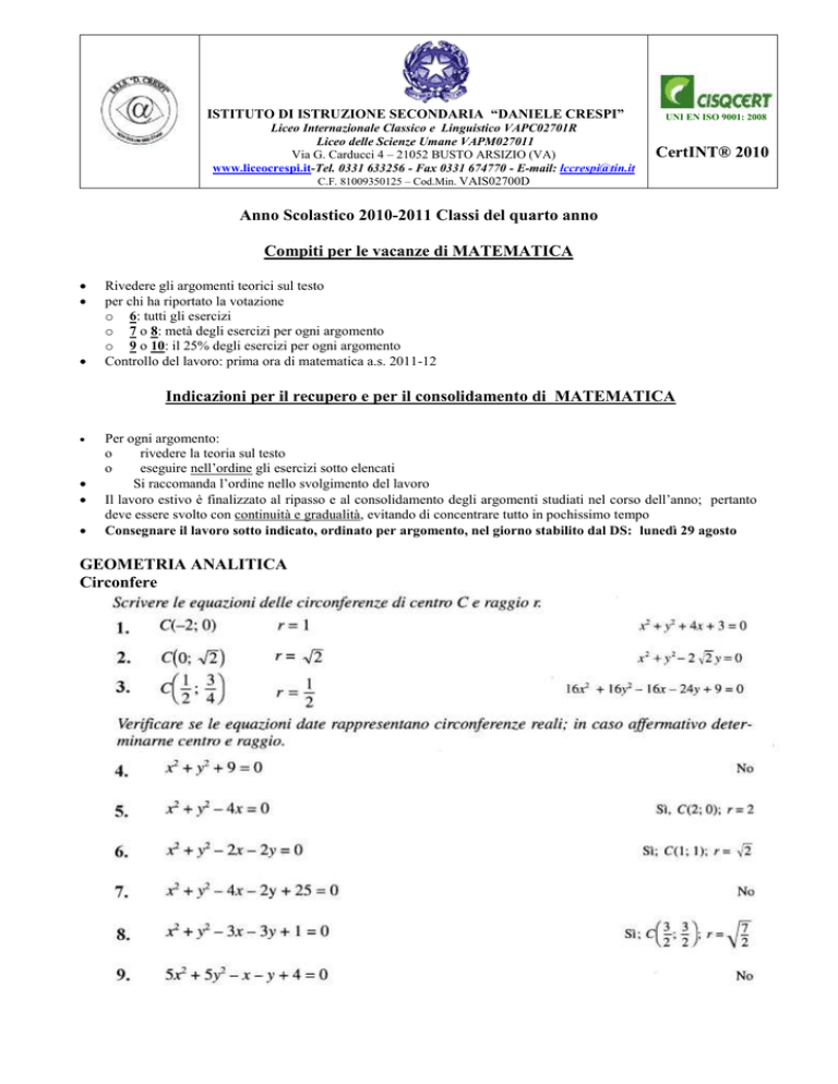 ISTITUTO DI ISTRUZIONE SECONDARIA “DANIELE CRESPI” Liceo Internazionale Classico e Linguistico VAPC02701R Liceo delle Scienze Umane VAPM027011 Via G. Carducci 4 – 21052 BUSTO ARSIZIO (VA) www.liceocrespi.it-Tel. 0331 633256 - Fax 0331 674770 - E-mail: [email protected] C.F. 81009350125 – Cod.Min. VAIS02700D UNI EN ISO 9001: 2008 CertINT® 2010 Anno Scolastico 2010-2011 Classi del quarto anno Compiti per le vacanze di MATEMATICA Rivedere gli argomenti teorici sul testo per chi ha riportato la votazione o 6: tutti gli esercizi o 7 o 8: metà degli esercizi per ogni argomento o 9 o 10: il 25% degli esercizi per ogni argomento Controllo del lavoro: prima ora di matematica a.s. 2011-12 Indicazioni per il recupero e per il consolidamento di MATEMATICA Per ogni argomento: o rivedere la teoria sul testo o eseguire nell’ordine gli esercizi sotto elencati Si raccomanda l’ordine nello svolgimento del lavoro Il lavoro estivo è finalizzato al ripasso e al consolidamento degli argomenti studiati nel corso dell’anno; pertanto deve essere svolto con continuità e gradualità, evitando di concentrare tutto in pochissimo tempo Consegnare il lavoro sotto indicato, ordinato per argomento, nel giorno stabilito dal DS: lunedì 29 agosto GEOMETRIA ANALITICA Circonfere Parabola GONIOMETRIA Valori delle funzioni goniometriche, archi associati, formule goniometriche Equazioni goniometriche Disequazioni goniometriche TRIGONOMETRIA Triangoli rettangoli 53. Determinare la misura del perimetro e l’area di un triangolo rettangolo sapendo che un cateto 12 misura 24 cm e il seno dell’angolo ad esso opposto è [60 cm e 120 cm2] 13 54. Il triangolo isoscele ABC ha la base AB di 70 cm e il seno dell’angolo alla base pari a 12 ; 13 determinare il perimetro del triangolo e la lunghezza dell’altezza CH relativa alla base. [252 cm e 84 cm] 55. Determinare il perimetro di un triangolo isoscele ABC di cui si conosce l’altezza AH, di 21 cm, relativa alla base BC e il cui angolo al vertice è di 120°. [ 42 2 3 cm] 56. Nel triangolo ABC, rettangolo in A, il cateto AB è di 24 cm e il seno dell’angolo ad esso 4 opposto è ; determinare il perimetro del triangolo. [72 cm] 5 Triangoli generici Risolvere i seguenti triangoli essendo a, b, c le misure di lati e , , gli angoli ad essi opposti. 57. a 2 , b 2 3 , 120 58. a 6 3 , 60 , 45 [ 60 , 30 , 90 ] [b 6 2 , c 3 2 3 1 , 75 ] 59. a 4 2 , b 4 , 30 60. a 3 , b 1, c 2 ESPONENZIALI E LOGARITMI Equazioni esponenziali e logaritmiche [ c 4 , 30 , 120 ] [ c 2 , 30 , 30 ]
