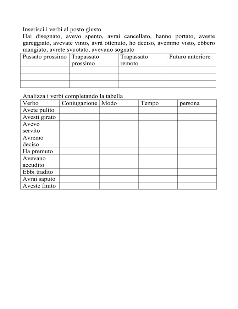 Inserisci i verbi al posto giusto Hai disegnato, avevo spento, avrai cancellato, hanno portato, aveste gareggiato, avevate vinto, avrà ottenuto, ho deciso, avemmo visto, ebbero mangiato, avrete svuotato, avevano sognato Passato prossimo Trapassato Trapassato Futuro anteriore prossimo remoto Analizza i verbi completando la tabella Verbo Coniugazione Modo Avete pulito Avesti girato Avevo servito Avremo deciso Ha premuto Avevano accudito Ebbi tradito Avrai saputo Aveste finito Tempo persona