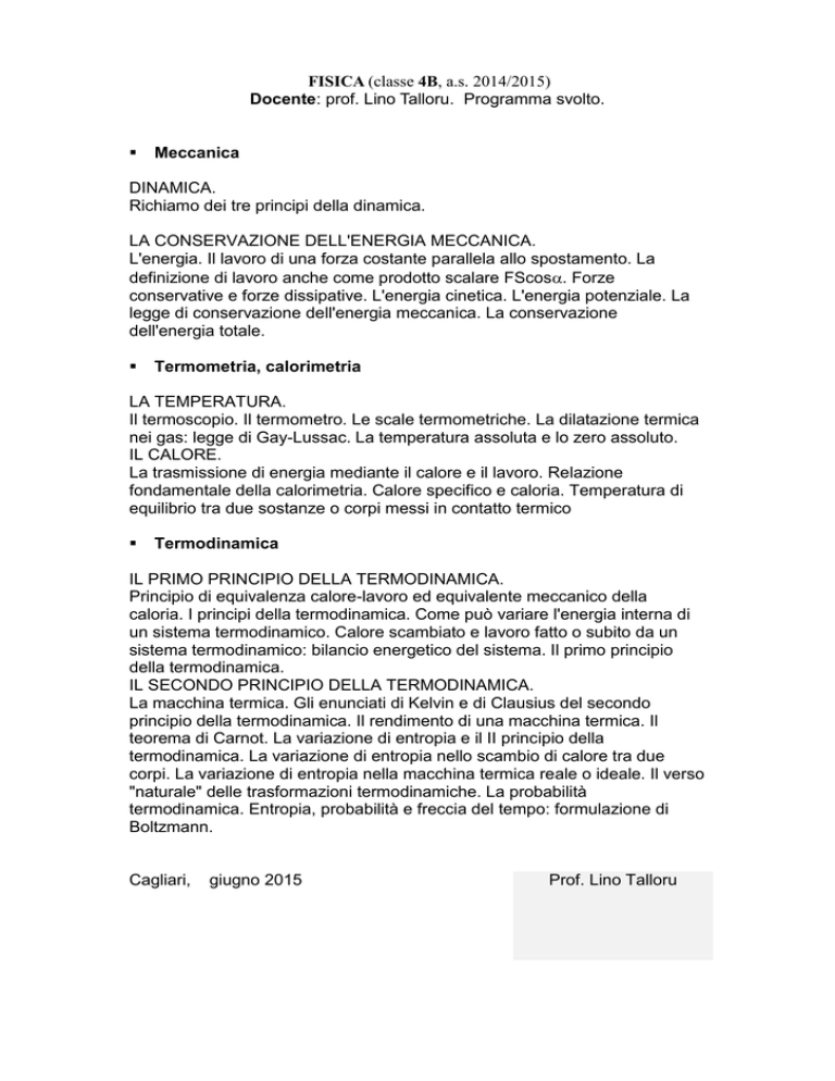 FISICA (classe 4B, a.s. 2014/2015) Docente: prof. Lino Talloru. Programma svolto. Meccanica DINAMICA. Richiamo dei tre principi della dinamica. LA CONSERVAZIONE DELL'ENERGIA MECCANICA. L'energia. Il lavoro di una forza costante parallela allo spostamento. La definizione di lavoro anche come prodotto scalare FScos. Forze conservative e forze dissipative. L'energia cinetica. L'energia potenziale. La legge di conservazione dell'energia meccanica. La conservazione dell'energia totale. Termometria, calorimetria LA TEMPERATURA. Il termoscopio. Il termometro. Le scale termometriche. La dilatazione termica nei gas: legge di Gay-Lussac. La temperatura assoluta e lo zero assoluto. IL CALORE. La trasmissione di energia mediante il calore e il lavoro. Relazione fondamentale della calorimetria. Calore specifico e caloria. Temperatura di equilibrio tra due sostanze o corpi messi in contatto termico Termodinamica IL PRIMO PRINCIPIO DELLA TERMODINAMICA. Principio di equivalenza calore-lavoro ed equivalente meccanico della caloria. I principi della termodinamica. Come può variare l'energia interna di un sistema termodinamico. Calore scambiato e lavoro fatto o subito da un sistema termodinamico: bilancio energetico del sistema. Il primo principio della termodinamica. IL SECONDO PRINCIPIO DELLA TERMODINAMICA. La macchina termica. Gli enunciati di Kelvin e di Clausius del secondo principio della termodinamica. Il rendimento di una macchina termica. Il teorema di Carnot. La variazione di entropia e il II principio della termodinamica. La variazione di entropia nello scambio di calore tra due corpi. La variazione di entropia nella macchina termica reale o ideale. Il verso "naturale" delle trasformazioni termodinamiche. La probabilità termodinamica. Entropia, probabilità e freccia del tempo: formulazione di Boltzmann. Cagliari, giugno 2015 Prof. Lino Talloru