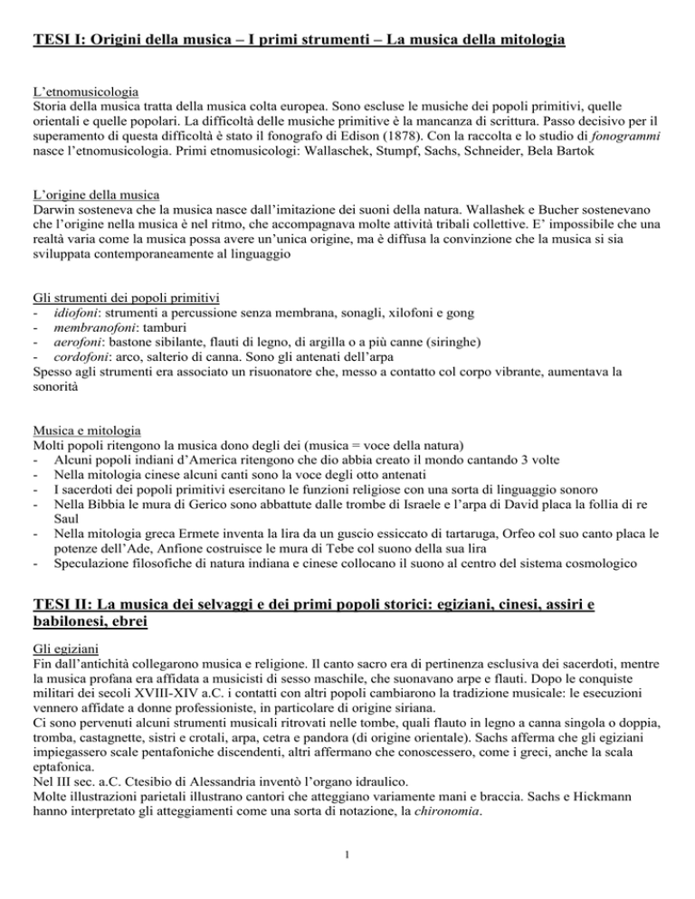 TESI I: Origini della musica – I primi strumenti – La musica della mitologia L’etnomusicologia Storia della musica tratta della musica colta europea. Sono escluse le musiche dei popoli primitivi, quelle orientali e quelle popolari. La difficoltà delle musiche primitive è la mancanza di scrittura. Passo decisivo per il superamento di questa difficoltà è stato il fonografo di Edison (1878). Con la raccolta e lo studio di fonogrammi nasce l’etnomusicologia. Primi etnomusicologi: Wallaschek, Stumpf, Sachs, Schneider, Bela Bartok L’origine della musica Darwin sosteneva che la musica nasce dall’imitazione dei suoni della natura. Wallashek e Bucher sostenevano che l’origine nella musica è nel ritmo, che accompagnava molte attività tribali collettive. E’ impossibile che una realtà varia come la musica possa avere un’unica origine, ma è diffusa la convinzione che la musica si sia sviluppata contemporaneamente al linguaggio Gli strumenti dei popoli primitivi - idiofoni: strumenti a percussione senza membrana, sonagli, xilofoni e gong - membranofoni: tamburi - aerofoni: bastone sibilante, flauti di legno, di argilla o a più canne (siringhe) - cordofoni: arco, salterio di canna. Sono gli antenati dell’arpa Spesso agli strumenti era associato un risuonatore che, messo a contatto col corpo vibrante, aumentava la sonorità Musica e mitologia Molti popoli ritengono la musica dono degli dei (musica = voce della natura) - Alcuni popoli indiani d’America ritengono che dio abbia creato il mondo cantando 3 volte - Nella mitologia cinese alcuni canti sono la voce degli otto antenati - I sacerdoti dei popoli primitivi esercitano le funzioni religiose con una sorta di linguaggio sonoro - Nella Bibbia le mura di Gerico sono abbattute dalle trombe di Israele e l’arpa di David placa la follia di re Saul - Nella mitologia greca Ermete inventa la lira da un guscio essiccato di tartaruga, Orfeo col suo canto placa le potenze dell’Ade, Anfione costruisce le mura di Tebe col suono della sua lira - Speculazione filosofiche di natura indiana e cinese collocano il suono al centro del sistema cosmologico TESI II: La musica dei selvaggi e dei primi popoli storici: egiziani, cinesi, assiri e babilonesi, ebrei Gli egiziani Fin dall’antichità collegarono musica e religione. Il canto sacro era di pertinenza esclusiva dei sacerdoti, mentre la musica profana era affidata a musicisti di sesso maschile, che suonavano arpe e flauti. Dopo le conquiste militari dei secoli XVIII-XIV a.C. i contatti con altri popoli cambiarono la tradizione musicale: le esecuzioni vennero affidate a donne professioniste, in particolare di origine siriana. Ci sono pervenuti alcuni strumenti musicali ritrovati nelle tombe, quali flauto in legno a canna singola o doppia, tromba, castagnette, sistri e crotali, arpa, cetra e pandora (di origine orientale). Sachs afferma che gli egiziani impiegassero scale pentafoniche discendenti, altri affermano che conoscessero, come i greci, anche la scala eptafonica. Nel III sec. a.C. Ctesibio di Alessandria inventò l’organo idraulico. Molte illustrazioni parietali illustrano cantori che atteggiano variamente mani e braccia. Sachs e Hickmann hanno interpretato gli atteggiamenti come una sorta di notazione, la chironomia. 1 I popoli mesopotamici La musica aveva funzioni religiose, più tardi fu usata anche in studi matematici. Gli strumenti più usati erano l’arpa (in particolare presso i sumeri), la cetra, flauti diritti in legno o metallo, castagnette, sistri e piatti. La musica fu anche usata dagli assiri per stimolare i soldati al combattimento. Israele: la cantillazione, il jubilus, i salmi La musica ebraica ebbe un periodo di splendore nel periodo dei re (XI-X sec. a.C.). Davide era un provetto arpista e compositore di salmi (si pensava che avesse composto lui stesso tutti i 150 salmi, ma così non è). Salomone organizzò professionalmente i cantori del tempio di Gerusalemme. Gli strumenti più usati erano il kinnor (strumento a 10 corde pizzicate), lo sciofar (corno di capra), l’ugab (zampogna o flauto diritto). Uno studio condotto all’inizio del ‘900 da Idelsohn su alcune popolazioni ebraiche stanziate nello Yemen e in Palestina, mostra evidenti affinità con le melodie gregoriane. Studi successivi mostrano che modi esecutivi e forme del primo canto cristiano erano propri della musica ebraica ed estranei alla musica greco-romana. Le caratteristiche comuni sono: - cantillazione: recitazione intonata su poche note contigue regolata dal ritmo dei versi sacri - jubilus: vocalizzo, a volte esteso, svolto sulle sillabe di una sola parola (spesso “alleluja”) I cinesi I suoni venivano messi in relazione con l’ordine dell’universo (punti cardinali, stagioni, pianeti, colori…) Attribuivano alla musica la capacità di influire sui costumi. Dalle prime dinastie la musica era basata su una scala pentafonica, ma già dal III sec. a.C si usava una scala di 12 suoni (non cromatica!) formata da 6 lu maschili e 6 lu femminili. Si usavano molti strumenti, spesso organizzati in organismi simili alle nostre orchestre. Gli strumenti più diffusi erano: - king, un litofono formato da lastre di pietra calcarea a L, appese a un telaio e percosse con un mazzuolo - chin, salterio con cassa a forma di semitubo munito di 7 corde - cheng, un organo a bocca - pipar, liuto dal manico corto Gli indiani Il popolo extraeuropeo dalla storia musicale più varia ed estesa. Il sistema musicale, risalente al II sec. a.C. si basa su un gran numero di scale. Comune a tutte le scale è l’ottava, divisa, come nel sistema occidentale, in toni e semitoni. Ma l’organizzazione di tale scala è molto complessa in quanto ogni intervallo è diviso in 2, 3 o 4 srutis o elementi (in tutto 22). Questo sistema consente un gran numero di scale modali. Il modo è detto ragas (colore, stato d’animo) e ve ne sono diverse migliaia. Gli strumenti più usati: cimbali e tamburi (tra cui il tabla, tamburo doppio