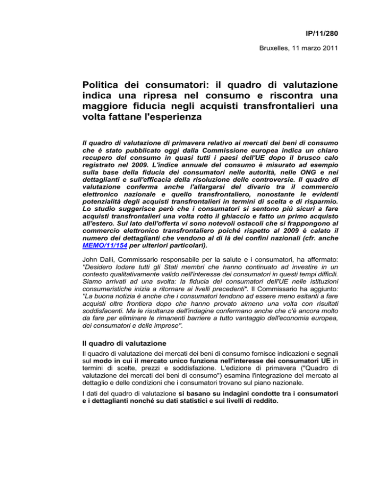 IP/11/280 Bruxelles, 11 marzo 2011 Politica dei consumatori: il quadro di valutazione indica una ripresa nel consumo e riscontra una maggiore fiducia negli acquisti transfrontalieri una volta fattane l'esperienza Il quadro di valutazione di primavera relativo ai mercati dei beni di consumo che è stato pubblicato oggi dalla Commissione europea indica un chiaro recupero del consumo in quasi tutti i paesi dell'UE dopo il brusco calo registrato nel 2009. L'indice annuale del consumo è misurato ad esempio sulla base della fiducia dei consumatori nelle autorità, nelle ONG e nei dettaglianti e sull'efficacia della risoluzione delle controversie. Il quadro di valutazione conferma anche l'allargarsi del divario tra il commercio elettronico nazionale e quello transfrontaliero, nonostante le evidenti potenzialità degli acquisti transfrontalieri in termini di scelta e di risparmio. Lo studio suggerisce però che i consumatori si sentono più sicuri a fare acquisti transfrontalieri una volta rotto il ghiaccio e fatto un primo acquisto all'estero. Sul lato dell'offerta vi sono notevoli ostacoli che si frappongono al commercio elettronico transfrontaliero poiché rispetto al 2009 è calato il numero dei dettaglianti che vendono al di là dei confini nazionali (cfr. anche MEMO/11/154 per ulteriori particolari). John Dalli, Commissario responsabile per la salute e i consumatori, ha affermato: "Desidero lodare tutti gli Stati membri che hanno continuato ad investire in un contesto qualitativamente valido nell'interesse dei consumatori in questi tempi difficili. Siamo arrivati ad una svolta: la fiducia dei consumatori dell'UE nelle istituzioni consumeristiche inizia a ritornare ai livelli precedenti". Il Commissario ha aggiunto: "La buona notizia è anche che i consumatori tendono ad essere meno esitanti a fare acquisti oltre frontiera dopo che hanno provato almeno una volta con risultati soddisfacenti. Ma le risultanze dell'indagine confermano anche che c'è ancora molto da fare per eliminare le rimanenti barriere a tutto vantaggio dell'economia europea, dei consumatori e delle imprese". Il quadro di valutazione Il quadro di valutazione dei mercati dei beni di consumo fornisce indicazioni e segnali sul modo in cui il mercato unico funziona nell'interesse dei consumatori UE in termini di scelte, prezzi e soddisfazione. L'edizione di primavera ("Quadro di valutazione dei mercati dei beni di consumo") esamina l'integrazione del mercato al dettaglio e delle condizioni che i consumatori trovano sul piano nazionale. I dati del quadro di valutazione si basano su indagini condotte tra i consumatori e i dettaglianti nonché su dati statistici e sui livelli di reddito. Risultanze chiave Progressi nelle condizioni che si offrono ai consumatori sul piano nazionale L'indice delle condizioni per i consumatori è definito da fattori quali l'efficacia nella risoluzione delle controversie e nel trattamento dei reclami, la fiducia dei consumatori nelle autorità, nei dettaglianti, nei pubblicitari e nelle organizzazioni dei consumatori nonché la qualità della regolamentazione. L'indice 2010 rivela che le condizioni per i consumatori sono migliorate dopo il rapido peggioramento nel 2009: ora la maggior parte dei paesi ha raggiunto o superato i livelli del 2008. I paesi di punta che presentano le migliori condizioni sono Regno Unito, Irlanda, Lussemburgo, Austria, Finlandia, Paesi Bassi, Italia, Danimarca, Germania, Belgio e Svezia, che superano tutti la media UE. Il differenziale del commercio elettronico Il quadro di valutazione indica che continua la crescita del commercio elettronico nazionale: nel 2010 il 36% dei consumatori UE ha fatto acquisti on line da venditori nazionali (rispetto al 34% nel 2009). Il commercio elettronico transfrontaliero continua però a registrare una crescita lenta (9% nel 2010 rispetto all'8% nel 2009) nonostante i chiari vantaggi che esso offre in termini di risparmi e di scelte come è indicato negli studi precedenti. Bisogna intensificare gli sforzi per raggiungere l'obiettivo dell'Agenda digitale (20% entro il 2015). Fare acquisti on line nel mercato unico: percezioni ed esperienze dei consumatori Le percezioni dei consumatori sembrano essere un importante ostacolo al commercio elettronico transfrontaliero. Tra i consumatori che non hanno effettuato un acquisto transfrontaliero a distanza: - il 62% è timoroso di essere frodato e truffato; - il 59% evoca preoccupazioni su cosa fare se si presentano problemi; - il 49% è scoraggiato dai previsti problemi in termini di consegna. Queste preoccupazioni però sono molto meno diffuse tra i consumatori che hanno effettivamente fatto acquisti transfrontalieri (rispettivamente 34%, 30% e 20%). Tra i consumatori che hanno già fatto acquisti oltre frontiera il 61% affronta con pari fiducia lo shopping on line transfrontaliero e quello domestico rispetto a soltanto il 33% della popolazione generale. Il commercio elettronico transfrontaliero sembra essere almeno altrettanto affidabile del commercio elettronico nazionale se non addirittura di più: - soltanto il 16% degli acquisti transfrontalieri ha subito ritardi (18% per gli acquisti nazionali); - il prodotto non è arrivato nel 5% dei casi transfrontalieri (6% per gli acquisti nazionali). 2 Queste risultanze suggeriscono che si debba far opera di informazione più efficace sulle consulenze transfrontaliere esistenti e sui meccanismi che servono a far applicare la legge e ad ottenere riparazione. Tra essi vi sono la rete di cooperazione per la tutela dei consumatori (rete CPC) cui partecipano le autorità nazionali incaricate di far rispettare la normativa e i centri europei dei consumatori che forniscono aiuto e consulenze gratuite ai consumatori che fanno acquisti nel mercato unico. Importanti ostacoli al commercio elettronico transfrontaliero sono riscontrabili sul lato dell'offerta. La proporzione di dettaglianti che vendono in altri paesi dell'UE è scesa al 22% nel 2010 (25% nel 2009) an