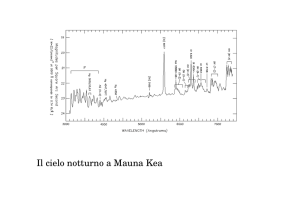 Il cielo come laboratorio Lezione 5 Enrico Maria Corsini Dipartimento di Astronomia Università di Padova Padova, 14 Novembre 2002 Telescopi ottici Rivelatori di immagini Spettri astronomici Telescopi ottici Rivelatori di immagini Spettri astronomici Telescopi ottici: • Spettro elettromagnetico • Osservatori astronomici • Strumentazione • Domanda di tempo di osservazione Spettro elettromagnetico Telescopi ottici nel mondo IAC Roque de los Muchachos (Spagna) ESO La Silla (Chile) ESO Paranal (Chile) Strumentazione al VLT Domanda di tempo di osservazione Telescopi ottici Rivelatori di immagini Spettri astronomici Rivelatori di immagini: • Lastre fotografiche e CCD • Struttura dei CCD • Funzionamento dei CCD Rivelatori di immagini Fino agli anni ‘80: lastre fotografiche Dalla fine degli anni ‘80: CCD (Charged Coupled Device) Vantaggi dei CCD: • Maggiore sensibilità • Linearità • Immagini digitali (CCD di AFOSC @1.80m, Cima Ekar) CCD I CCD funzionano grazie all’effetto fotoelettrico: Energia crescente • se il sistema viene riscaldato o assorbe fotoni (E=1.26 eV) gli e- passano dalla banda di valenza alla banda di conduzione • nella banda di conduzione gli e- sono liberi di muoversi (= corrente elettrica) • un campo elettrico esterno previene la ricombinazione fotone fotone tra e- e nuclei Banda di conduzione 1.26 eV Banda di valenza buca elettrone Struttura dei CCD Struttura dei CCD Area dell’immagine Supporto di ceramica, metallo o plastica Connettori Connessioni Piedini Strato di silicio Amplificatore Registro seriale Struttura dei CCD CCD visto da sopra colonna Elettrodi orizzontali trasparenti pixel Elettrodo Isolante Silicio n CCD visto di lato Silicio p Funzionamento dei CCD PIOGGIA (FOTONI) NASTRI TRASPORTATORI VERTICALI (COLONNE DEI CCD) SECCHI (PIXEL) NASTRO TRASPORTATORE ORIZZONTALE (REGISTRO SERIALE) CONTENITORE GRADUATO (AMPLIFICATORE IN USCITA) Al termine della pioggia i secchi contengono una certa quantità di acqua (= al termine della posa i pixel contengono una certa quantità di carica) I nastri trasportatori entrano in funzione e spostano i secchi. La prima fila di secchi sui nastri verticali viene spostata sul nastro orizzontale. I nastri verticali si fermano. Il nastro orizzontale travasa il contenuto del primo secchio nel contenitore graduato. Il contenuto di pioggia del primo secchio viene misurato. Il contenitore viene svuotato ed è pronto a ricevere la pioggia contenuta nel secondo secchio. La procedura è ripetuta per tutti i secchi della fila. ` Una nuova fila di secchi viene spostata sul nastro orizzontale e la procedura di misura è ripetuta per tutte le file di secchi. L’ultima fila di secchi viene spostata sul nastro orizzontale. La lettura del CCD è completa quando il contenuto tutti i secchi è stato misurato. Struttura dei CCD CCD visto da sopra Amplificatore Registro seriale CCD visto di lato Struttura dei CCD 160mm Registro seriale Amplificatore CCD visto da sopra Bordo del silicio Cariche Area dell’immagine Telescopi ottici Rivelatori di immagini Spettri astronomici Spettri astronomici: • Acquisizione di spettri di oggetti astronomici • Analisi di spettri digitali • (Classificazione morfologica delle galassie) • Esempi di spettri di galassie Acquisizione di spettri Spettrografo: fenditura + reticolo di dispersione + CCD Produce dati (= Spettri) in 2 dimensioni: • spaziale (x) lungo la fenditura • spettrale (l=lunghezza d’onda) Fenditura CCD Reticolo Fenditura Spettro della galassia Galassia l Riga di emissione del cielo x Analisi di spettri digitali Riduzione: procedura per trasformare il dato “grezzo” in dato scientifico Procedura: • sottrazione del bias • correzione per flatfield • rimozione dei raggi cosmici • calibrazione in lunghezza d’onda • calibrazione in flusso • sottrazione del cielo Sottrazione del bias Bias: livello elettronico del CCD Si ottiene con un’esposizione di 0 sec con otturatore chiuso media=197.6 ± 0.8 ImaB = Immagine - bias Correzione per flatfield Flat-field: spettro ottenuto con cupola chiusa e luci accese Serve a rivelare e rimuovere gli effetti della non uniforme risposta dei pixel colpiti da luce Deve essere normalizzato (=reso mediamente 1) per eliminare la dipendenza dalla l Media di colonne del flatfield Flatfield Le colonne del flatfield vengono mediate e la funzione che riproduce il profilo viene usata per normalizzare il flatfield Media=1.00 ± 0.03 Flatfield normalizzato ImaBF = ImaB / flatN Sottrazione dei raggi cosmici 1 Raggi cosmici Raggi cosmici: radiazione cosmica che colpisce il CCD con eventi casuali Si notano pixel o gruppi di pixel molto brillanti Sezione di spettro 2 3 Maschera Spettro ripulito Calibrazione in lunghezza d’onda Spettro di confronto: spettro a righe note di emissione di una lampada di un gas o di un miscela di gas La posizione di ogni riga di emissione sull’immagine (in pixel) viene messa in relazione alla sua l (in Å) He 5876Å Spettro di He-Ar La funzione che converte da pixel in Å è detta soluzione in dispersione Identificazione delle righe Soluzione bidimensionale Utilizzando un polinomio di quinto grado si ottiene uno spettro con λiniziale = 4458.3 Å e intervallo dλ = 2.6 Å/px Calibrazione in flusso Spettro della stella standard Si usa lo spettro di una stella detta standard spettrofotometrica di cui è noto il flusso in funzione della l Viene estratto lo spettro monodimensionale e misurato il flusso (in conteggi di fotoni) a varie l Si determina la funzione di calibrazione che converte da conteggi in erg cm-2 sec-1 Å-1 Spettro 1D della stella Misura dei flussi Curva di calibrazione Spettro prima della calibrazione in flusso Spettro dopo la calibrazione in flusso Con la calibrazione in flusso viene rimossa la non uniforme sensibilità del CCD alle varie lunghezze d’onda Sottrazione del cielo Spettro della galassia+cielo Riga di emissione del cielo Spettro senza cielo Classificazione morfologica delle g