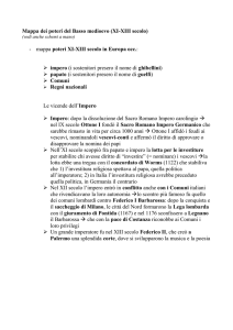 LA RINASCITA DELL’IMPERO IN OCCIDENTE La disgregazione post carolingia • 887 dissoluzione dell’Impero carolingio, fine dell’unità politica dell’Europa • Graduale allontanamento di Germania, Italia, Francia • Sviluppi politici ed istituzionali differenti Le invasioni • Nuove popolazioni mettono intanto a ferro e a fuoco l’Europa tra IX e XI secolo: Normanni, dalla Scandinavia e dalla Danimarca Ungari, dalle pianure del Volga Saraceni, pirati musulmani che agiscono sulle coste dell’Italia e della Provenza Normanni • Abilissimi navigatori, con i drakkar risalgono anche il corso dei fiumi • Dalla metà del IX sec arrivano in Inghilterra, lungo le coste atlantiche della Francia e delle Fiandre, in Russia, nel Mediterraneo Occidentale • Sottomettono l’Inghilterra, che tra il 1018 e il 1035 fa parte del regno danese di Canuto il Grande (anche con la penisola scandinava) Il Drakkar Normanni • Assedii di Parigi 845, 885-886 (Carlo il Grosso viene deposto perché si rivela incapace di difendere la città) • Nel 911 con Rollone si insediano in Normandia, concessa loro in feudo • Da qui partiranno per conquistare definitivamente l’Inghilterra e l’Italia meridionale La Normandia Normanni • In Russia ed Ucraina occidentale, si fondono con gli slavi locali fondando insediamenti urbani e poi i principati di Kiev e Novgorod… • … che nella prima metà del X secolo si uniscono sotto la corona del principe di Kiev • 988 Vladimir I di Kiev riceve il battesimo a Costantinopoli Il principato di Kiev Ungari • Stanziati lungo il medio Danubio dall’895, compiono scorrerie e saccheggi • Si dirigono verso le pianure tedesche e l’Italia in primavera • Prendono di mira campagne e piccoli borghi • Nel 924 distruggono completamente Pavia • Incastellamento Ungari • Sconfitti da Enrico I (933) e da Ottone I (955), diradano in seguito le razzie • Vengono gradualmente evangelizzati dai vescovadi tedeschi • Stefano I il Santo (997-1038) si fa battezzare nel 1000 • Con lui nasce il Regno di Ungheria, che si feudalizza e si lega alla monarchia tedesca Santo Stefano e la sua corona Saraceni • Conquistano la Sicilia dopo anni di guerra contro i Bizantini (827-902) • Tentano di occupare Puglia e Sardegna • Sconfitti in modo significativo da una lega guidata dal Papa nel 915 • Bizantini riprendono il controllo del Mediterraneo e dello Ionio • Cacciati anche dalla Liguria e dalla Provenza nel X secolo Germania - Enrico • Rinasce l’autorità regia: Enrico I di Sassonia (919-936) • Coesione territoriale, minor dispersione feudale • 5 ducati principali (Turingia, Franconia, Baviera, Sassonia, Svevia) • Lenta riorganizzazione del Regno Germania • Esercito regio fedele al re (cavalleria pesante) • Sottomissione degli slavi • Soffocamento delle ribellioni nobiliari • Prima pesante sconfitta degli Ungari nel 933 Germania - Ottone I • Il figlio Ottone I (936-973) prosegue la sua opera • Lavora per il rafforzamento autorità regia a discapito dell’aristocrazia Germania - Ottone I • Per limitare il potere della grande feudalità e raggirare il problema dell’ereditarietà: concede poteri comitali ad ecclesiastici (vescovi e abati) • “Chiesa Imperiale”: controllo sulle nomine Germania – Ottone I • Conquiste militari: Boemia, terre lungo l’Elba • Cristianizzazione degli abitanti • Grande vittoria sugli Ungari a Lechfeld 955 • Prima campagna di Italia 951: sconfigge Berengario di Ivrea e sposa Adelaide di Borgogna • Incoronato Re di Italia a Pavia nel 952 Germania – Ottone I Imperatore • II campagna di Italia 961-965: ordine messo in crisi da continue lotte tra feudatari • Giovanni XII lo incorona Imperatore nel 962 a Roma • Depostolo, lo sostituisce con Leone VIII • Privilegium Othonis: il candidato al papato giuri fedeltà all’Impero prima della consacrazione L’Impero di Ottone I • Sottomissione della Chiesa all’autorità imperiale • Ultimi anni: tentativo di unificazione della penisola • Alleanza con Costantinopoli contro gli Arabi: fa sposare il figlio Ottone con Teofano nipote del basileus • Muore nel 973 L’Impero di Ottone II • Ottone II (973983) • Intraprese subito la pacificazione della Germania (attacchi di slavi e normanni, lotte feudali) L’Impero di Ottone II • 980 offensiva antiaraba in Italia per liberare la Sicilia • 982 disfatta di Punta Stilo • 983 muore in Germania L’Impero di Ottone III • Ottone III (9831002) diviene imperatore a tre anni! L’Impero di Ottone III • Teofano e Adelaide reggono l’Impero • Educato da Gerberto di Aurillac (poi papa Silvestro II), ideali universalistici • 997 trasferisce la capitale a Roma • Collaborazione col Papa L’Impero di Ottone III • Renovatio Imperii Romanorum: impero universale fondato sulla collaborazione tra sfera religiosa e sfera politica • Pellegrinaggio nel 1000 in Polonia e Ungheria per il battesimo cristiano dei sovrani di quei regni • Muore nel 1002 • Un grande sogno? L’Impero di Enrico II • Enrico II (1002-1024) • Concentra le energie sulla Germania • Grandi famiglie feudali sempre più autonome • Sinodo di Pavia 1022 per riformare la Chiesa in decadenza col papa Benedetto VIII • Si estingue con lui la dinastia dei Sassonia L’Impero dei Franconia • Gli succede Corrado II della casa di Franconia (1024-1039) • Vuole rafforzare l’autorità imperiale e limitare le prerogative nobiliari • Interviene nella scelta di vescovi e abati cui concede poteri comitali • Interviene a Milano contro il potente arcivescovo Ariberto di Intimiano L’Impero dei Franconia • Constitutio de Feudis (1037), ereditarietà dei feudi minori • Poi Enrico III (1039-1056) • Enrico IV (1056-1106) • Enrico V (1111-1125)