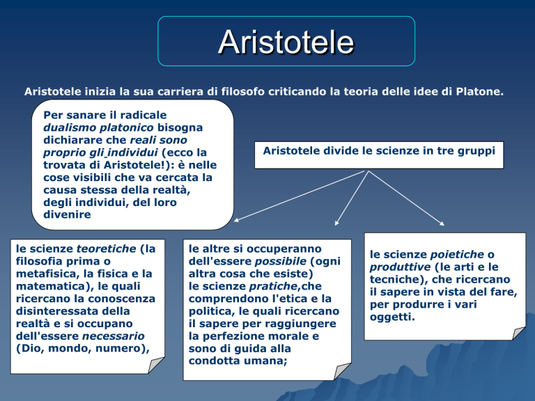 Aristotele Aristotele inizia la sua carriera di filosofo criticando la teoria delle idee di Platone. Per sanare il radicale dualismo platonico bisogna dichiarare che reali sono proprio gli individui (ecco la trovata di Aristotele!): è nelle cose visibili che va cercata la causa stessa della realtà, degli individui, del loro divenire le scienze teoretiche (la filosofia prima o metafisica, la fisica e la matematica), le quali ricercano la conoscenza disinteressata della realtà e si occupano dell'essere necessario (Dio, mondo, numero), Aristotele divide le scienze in tre gruppi le altre si occuperanno dell'essere possibile (ogni altra cosa che esiste) le scienze pratiche,che comprendono l'etica e la politica, le quali ricercano il sapere per raggiungere la perfezione morale e sono di guida alla condotta umana; le scienze poietiche o produttive (le arti e le tecniche), che ricercano il sapere in vista del fare, per produrre i vari oggetti. Metafisica La scienza più alta è per Aristotele la metafisica (che in realtà lui chiamava filosofia prima e, più tardi, verrà anche detta ontologia, cioè studio dell'essere), viene da lui definita in quattro modi essa è la scienza che studia le cause e i principi primi, studia l'essere in quanto essere; studia la sostanza; In altri termini la matematica studia l'essere come quantità la fisica studia l'essere come movimento studia Dio e la sostanza immobile. Dire che la metafisica studia l'essere in quanto essere significa che essa non ha per oggetto una realtà in particolare, bensì la realtà in generale, cioè gli aspetti fondamentali e comuni di tutta la realtà. solo la metafisica studia l'essere in quanto tale, considerando le caratteristiche universali di ogni essere (ecco perché è chiamata "filosofia prima" mentre la altre scienze sono "filosofie seconde"), ed è dunque il presupposto indispensabile di ogni ricerca. Se la metafisica è lo studio dell'essere, che cosa è L’essere l'essere? 1l'essere come categoria; 2 l'essere come potenza e atto; 3 l'essere come accidente; 4l'essere come vero (e il non essere come falso). i primi tre aspetti A. dice che l'essere ha molteplici aspetti e significati (noi diciamo ad es. che l'uomo è, la neve è sui monti, Dio è...). Esso viene perciò diviso da A. in quattro gruppi principali: Col termine "categorie" Aristotele intende le caratteristiche fondamentali che ogni essere possiede. Esse sono dieci: sostanza, qualità, quantità, relazione, agire, subire, dove (luogo), quando (tempo), avere e giacere. La prima di esse, la sostanza, è la più importante perché è il riferimento comune alle altre categorie che, in qualche modo, la presuppongono (la qualità ecc. è sempre riferita a qualcosa che esiste di già: l'uomo, ovvero la sostanza, è alto, uno, padre, cammina ecc.). Il che ci porta a concludere che, se l'essere si identifica con le sue categorie e le categorie si riferiscono alla sostanza, la domanda su "che cos'è l'essere ?" si trasforma in "che cos'è la sostanza?". La sostanza La sostanza è in primo luogo ogni individuo concreto (uomo, cavallo, albero, tavolo ecc.) a cui si riferiscono delle proprietà che lo caratterizzano. La forma è la "natura" propria di una cosa, è ciò che la rende quella che è e la distingue dalle altre; è dunque la sua "essenza", il suo significato fondamentale, il suo "essere dell'essere". E' quindi un sinolo, unione di due elementi che A. chiama materia (hyle) e forma (eidos, morphé). La materia è invece ciò di cui una cosa è fatta, ciò di cui è composta (ad es. un uomo è fatto di carne ed ossa; una sfera è fatta di bronzo ecc.), ed è dunque un elemento passivo, che viene 'strutturato', dalla forma, nel senso che è la forma che rende ad es. l’uomo 'animale razionale', mentre la materia sarà il corpo dell'uomo. . Entrambe però, la materia e la forma, sono necessarie per fare una sostanza: non può esistere un uomo senza il corpo (materia), né l'anima (forma) senza il corpo Accidenti Dalla forma, che è l’essenza necessaria, si distinguono gli accidenti Gli accidenti sono le varie qualità che si possono avere o non avere senza per questo influire sulla sostanza stessa. Ad es. Socrate non cessa di essere uomo mentre può essere allegro, triste, sano, malato, ecc. Per cui mentre l'accidente cambia nel tempo, la sostanza rimane la stessa, identica, pur nel mutare delle varie qualità Tornando alla sostanza, possiamo notare che praticamente ogni cosa è una sostanza, in quanto di ogni cosa - da Dio al più piccolo sasso - si può sempre e comunque chiedere che cos'è?. Ciò significa che tutti gli esseri, prima di qualunque altro valore, hanno questo che li accomuna: il fatto di essere delle sostanze. Il che implica che, per A., tutte le scienze, in quanto sono tutte rivolte alla ricerca e alla definizione delle sostanze, abbiano la stessa dignità. La conoscenza A. afferma, come già Platone, che la conoscenza nasce dalla meraviglia nei confronti della realtà e consiste nel chiedersi il perché delle cose. Ma chiedersi perché una cosa esista o perché sia così e non altrimenti, equivale a chiedersi qual è la causa (=condizione, fondamento, ragione) della cosa stessa, e quindi vi potranno essere diversi tipi di cause. A. elenca quattro cause: materiale, formale, efficiente, finale. La causa materiale è appunto la materia, ciò di cui una cosa è fatta (il bronzo è la cosa materiale della statua). La causa formale è la forma o essenza della cosa (la 'ragione' è la forma o essenza dell'uomo). La teoria delle cause è legata al problema del mutamento o, meglio, del divenire. la causa efficiente è ciò che dà origine, inizio a qualcosa (il padre è la causa efficiente del figlio). La causa finale è il fine, lo scopo a cui una cosa tende (il diventare adulto è la causa finale del bambino). Che vi siano delle cose che mutano è una esperienza quotidiana. Ma come poter definire il divenire il generale? Per A. il divenire è il passa