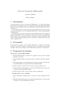 Corso di Laurea in Matematica – a.a. 2006/07 Programma preliminare del corso di Geometria 5 - 6 CFU Prof. Emilia Mezzetti Curve in R3 Curve regolari in R3. Parametro lunghezza d’arco. Retta tangente. Curvatura. Piano osculatore. Versori tangente, normale e binormale. Torsione. Formule di Frenet. Curve a curvatura o a torsione costante nulla. Forma canonica locale. Calcolo dell'apparato di Frenet. Circolo osculatore. Il teorema fondamentale della teoria locale delle curve. Trasformata di una curva in un'isometria di R3. Confronto fra gli apparati di Frenet di curve congruenti. Teorema di esistenza, e unicità a meno di congruenza, di una curva con curvatura e torsione assegnate (cenni di dimostrazione). Superfici regolari in R3 Superfici parametrizzate. Superfici regolari. Criteri di regolarità: parametrizzazione di Monge, superfici di livello. Piano tangente. Funzioni differenziabili su una superficie. Campi vettoriali su una superficie. Applicazioni differenziabili e diffeomorfismi tra superfici. Cambiamento di coordinate locali. Differenziale di un’applicazione differenziabile tra superfici. Versore normale. Campo vettoriale normale. Superfici orientabili. Il nastro di Moebius. Prima forma fondamentale. Area di una regione di superficie. Mappa di Gauss. Operatore forma. Seconda forma fondamentale. Curvatura normale di una curva contenuta in una superficie, teorema di Meusnier. Direzioni e curvature principali, curvatura gaussiana e curvatura media. Loro espressioni in coordinate locali. Sezioni normali. Formula di Eulero per la curvatura normale. Classificazione dei punti di una superficie. Direzioni asintotiche. Superfici rigate, rigate sviluppabili. Superfici di rotazione. Quadriche. Curve asintotiche. Linee di curvatura. Superfici minime. Superfici i cui punti sono tutti ombelichi. Geodetiche. Geometria intrinseca delle superfici. Isometrie e isometrie locali tra superfici. Simboli di Christoffel. Equazioni di Gauss e di Codazzi - Mainardi. Teorema Egregium di Gauss e sue conseguenze. Teorema di Bonnet (senza dim.). Varietà differenziabili. Varietà topologiche e varietà differenziabili. Cenni alla nozione di spazio tangente. Metrica riemanniana. Alcuni esempi: toro piatto, piano stereografico, disco di Poincaré, semipiano superiore di Poincaré. Riferimento principale. M.P. Do Carmo: Differential geometry of curves and surfaces, Prentice-Hall, 1976 Altri testi consigliati B. O'Neill: Elementary differential geometry, 2nd ed., Academic Press, 1997 M. Spivak: A Comprehensive Introduction to Differential Geometry, Publish or Perish . 1970-1975
