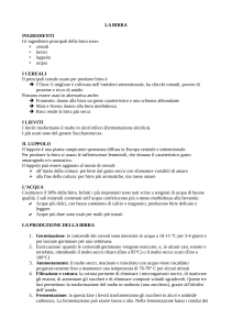 Bevande alcoliche • Fermentate (vino, birra, sidro) • Fermentate e distillate (grappa, whisky ecc…) • Liquorose (amari, digestivi, liquori dolci) I lieviti sono tra i più importanti microrganismi utilizzati a scopi industriali e per le produzioni alimentari. Sono organismi eucariotici, funghi unicellulari. In presenza di ossigeno essi sono in grado di effettuare la respirazione aerobica, in assenza di ossigeno il loro metabolismo diventa anaerobico, con ridotta crescita cellulare e produzione di grandi quantità di etanolo. (FERMENTAZIONE ALCOLICA) PRODUZIONE DI BEVANDE ALCOLICHE FERMENTATE: Le bevande alcoliche fermentate vengono prodotte in tutto il mondo da una grande varietà di prodotti vegetali, ricchi di carboidrati facilmente utilizzabili. La FERMENTAZIONE ALCOLICA riveste maggiore importanza, i lieviti utilizzano gli zuccheri naturalmente presenti per produrre alcool FATTORI CHIMICO-FISICI CHE INFLUENZANO LA FERMENTAZIONE Temperatura: i lieviti responsabili della fermentazione sono mesofili con un optimun tra i 30-35°C. Ossigeno: dopo la fase aerobica di avvio fermentazione bisogna limitare l’ossigenazione per evitare fenomeni ossidativi. Acidità: un pH di circa 3 inibisce l’insorgenza di microrganismi diversi dai lieviti alcoligeni. FERMENTAZIONE ALCOLICA C6H12O6 GLUCOSIO 2 CH3CH2OH + 2 CO2 2 ALCOL ETILICO + 2 ANIDRIDE CARBONICA Vinificazione Vini rosati Uva Mosto Aggiunta di SO2 Vinificazione in rosso Vinacce: + lieviti, coloranti, tannini, acidi Vinificazione in bianco Assenza di vinacce Vini rossi Vini bianchi Lieviti naturali sono presenti sulle uve Lievito da vino Saccharomyces ellipsoideus Aggiunto all’inizio del processo. Il trattamento con SO2 ha un effetto antiossidante e antisettico. il lievito da vino è resistente alla concentrazione di anidride solforosa, che ostacola la crescita di lieviti indesiderati e altri microrganismi Fermentazione condotta in contenitori di varie dimensioni con una valvola di sola uscita da cui la CO2 può uscire ma non può entrare aria Travaso e separazione del vino dal Sedimento di lieviti e vari precipitati. Altro trattamento con SO2 per eliminare i lieviti residui ed eventuali specie indesiderate FERMENTAZIONE MALO-LATTICA Quando tutti gli zuccheri sono stati fermentati ad etanolo, i livelli dei lieviti diminuiscono e si può avere la crescita dei batteri lattici (Lactobacillus plantarum, Lactobacillus casei, Pediococcus, Leuconostoc oenus, Oenococcus) Questi batteri sono responsabili della FERMENTAZIONE MALO-LATTICA in cui l’acido malico viene decarbossilato ad acido lattico con produzione di CO2, ad opera dell’enzima malolattico. La fermentazione malolattica segue di alcuni giorni quella alcolica e il suo valore principale è quello di deacidificare il vino. BATTERI LATTICI CHE PARTECIPANO ALLA FERMENTAZIONE MALO-LATTICA Oenococcus oeni Leuconostoc ALTERAZIONI DI NATURA MICROBICA La crescita incontrollata degli stessi microrganismi responsabili delle fermentazioni o di microrganismi non desiderati, può determinare alterazioni del vino. FIORETTA: provocata da lieviti del genere Candida. Essi determinano una diminuzione del livello di alcol etilico che viene ossidato con produzione di CO2 e acqua. Si manifesta come un velo bianco rugoso sul collo e le pareti della bottiglia. SPUNTO ACETICO: dovuto alla proliferazione di Acetobacter che ossida l’alcol etilico con produzione di acido acetico. SPUNTO LATTICO: dovuto agli stessi batteri lattici (eterofermentanti) che producono composti secondari oltre all’acido lattico (mannite, glicerolo, acido acetico, acido propionico e butirrico) Composizione chimica del vino • Acqua 85-90%. • Alcoli: principalmente etanolo; tracce di metanolo, glicerolo, inositolo, sorbitolo. Gradazione alcolica = % v/v. • Anidride carbonica. • Acidi organici (tartarico, malico, citrico, succinico, lattico, acetico). • Zuccheri (glucosio, fruttosio). • Sostanze volatili (es. acetaldeide; acetato di etile). • Sostanze coloranti: polifenoli (antociani, flavoni). • Resveratrolo (nei vini rossi). • In quantità minima: pectine, sali minerali, vitamine. Metabolismo dell’alcool etilico • In minima quantità eliminato dal polmone e dal rene • 90 % metabolizzato nel fegato: Alcol etilico acetaldeide Enzimi responsabili: 1) Alcol deidrogenasi (nel citoplasma) 2) Sistema microsomiale (nel reticolo endoplasmatico) 3) Catalasi Danni da abuso di alcool • Sistema nervoso centrale: alterazioni nella trasmissione nervosa; • Sistema neurovegetativo: vasodilatazione cutanea e mucosa; diuresi; • Apparato cardiovascolare: riduzione della contrattilità del miocardio e accumulo di lipidi; arteriopatie periferiche; • Apparato gastroenterico: lesioni; malassorbimento di nutrienti; lesioni pancreatiche. • Fegato: epatite, cirrosi, tumori. Birra lieviti Malto d’orzo, luppolo, acqua birra • Alcol etilico 4-12% • Acqua 85% • CO2 • Estratto: zuccheri, sostanze azotate, tannini, sali, acidi, vitamine gruppo B PRODUZIONE della BIRRA Materie prime per la produzione della birra sono vari cereali: orzo, grano riso. Essi contengono proteine ed amidi che devono essere trasformati in miscele di amminoacidi e carboidrati più semplici per essere facilmente utilizzabili. I lieviti utilizzati per la produzione di birra possono essere di due tipi: - LIEVITI DI FONDO (Saccharomyces carlsbergensis) che sedimentano sul fondo del tino di fermentazione. Svolgono una fermentazione a 14-23°C per 5-7 giorni e sono quelli di largo utilizzo. - LIEVITI DI SUPERFICIE (Saccharomyces cerevisiae) che restano distribuiti uniformemente nel mosto e vengono trasportati verso la superficie dalla CO2 prodotta durante la fermentazione. Vengono utilizzati per produrre birre ad elevata gradazione alcolica. Germinazione dell’orzo bagnato ed attivazione dei suoi enzimi con liberazione enzimatica dei carboidrati solubili MALTO Malto + acqua + cereali MACERAZIONE in un TINO PER INFUSIONE Ulteriore attività enzim