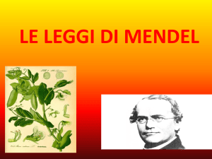 GREGORIO MENDEL 1822- 1884 UN SISTEMA SPERIMENTALE CONTROLLATO E FACILE DA MANIPOLARE GENETICAMENTE STRUTTURA DEL FIORE UN SISTEMA SPERIMENTALE CONTROLLATO E FACILE DA MANIPOLARE GENETICAMENTE ISOLAMENTO DI LINEE PURE MANIPOLAZIONE DEI FIORI PER EVITARE L’AUTOFECONDAZIONE Esperimento ripetuto invertendo il sesso delle piante RISULTATI DEGLI ESPERIMENTI OTTENUTI INCROCIANDO PIANTE CHE DIFFERISCONO PER UN SOLO CARATTERE Linee pure F1 F2 Rapp. F2 1. semi lisci X rugosi Tutti lisci 5474 lisci; 1850 rugosi 2,96:1 2. semi gialli X verdi Tutti gialli 6022 gialli; 2001 verdi 3,01:1 3. petali rossi Tutti rossi 705 rossi; 224 bianchi 3,15:1 4. fiori terminali X assiali Tutti assiali 651 assiali;207 terminali 2,95:1 5. baccelli sempl. X concamer. Tutti semplici 882 semplici; 299 concam. 2,82:1 6. baccelli verdi X gialli Tutti verdi 428 verdi; 152 gialli 3,14:1 7. steli lunghi Tutti lunghi 787 lunghi; 277 corti 2,84:1 X bianchi X corti Nella F1 il carattere che viene espresso è detto dominante, l’altro recessivo. Nella F2 piante con carattere dominante : piante carattere recessivo = 3:1 LE OSSERVAZIONI DI MENDEL GLI IBRIDI F1 ESPRIMONO SOLO IL CARATTERE DOMINANTE NELLA GENERAZIONE F2 COMPAIONO PIANTE SIA CON IL CARATTERE RECESSIVO CHE CON IL CARATTERE DOMINANTE NELLA GENERAZIONE F2 LE PIANTE CON CARATTERE DOMINANTE SONO IL TRIPLO DI QUELLE CON CARATTERE RECESSIVO IL MODELLO DI MENDEL PER CIASCUN CARATTERE UN ORGANISMO POSSIEDE DUE DETERMINANTI CHE POSSONO ESSERE NELLA FORMA DOMINANTE O RECESSIVA NELLA FORMAZIONE DEI GAMETI UNO SOLTANTO DEI DUE DETERMINANTI VIENE SEGREGATO CON UGUALE PROBABILITA’ IL GAMETE MASCHILE FECONDA IL GAMETE FEMMINILE FORMANDO UNO ZIGOTE CON DUE DETERMINANTI PER CIASCUN CARATTERE IL MODELLO SPIEGA I RISULTATI SPERIMENTALI IL MODELLO PREDICE CHE INCROCIANDO UN IBRIDO DI PRIMA GENERAZIONE CON UN OMOZIGOTE RECESSIVO SI DEVE OTTENERE PER IL 50% UN FENOTIPO DOMINANTE E PER IL RIMANENTE 50% UN FENOTIPO RECESSIVO PRIMA LEGGE DI MENDEL I DUE MEMBRI DI UNA COPPIA DI DETERMINANTI (ALLELI) SI SEPARANO L’UNO DALL’ALTRO DURANTE LA FORMAZIONE DEI GAMETI Fenotipi liscio e rugoso SECONDA LEGGE DI MENDEL DURANTE LA FORMAZIONE DEI GAMETI LA SEGREGAZIONE DI UNA COPPIA DI ALLELI DI UN GENE È INDIPENDENTE DALLA SEGREGAZIONE DEGLI ALLELI DI UN ALTRO GENE MEIOSI PROBABILITA’ E STATISTICA Applicazioni delle leggi di Mendel per predire il risultato degli incroci genetici Con che probabilità si ottiene un certo tipo di progenie? Per questi calcoli si utilizzano 3 regole matematiche: Regola della somma Regola del prodotto Espansione binomiale Metodi statistici per valutare se i dati osservati negli incroci siano in accordo con gli attesi: Metodo del chi quadrato Regola del prodotto: usata per prevedere la probabilità di eventi indipendenti. P che si verifichi l’evento E1 al primo lancio e la probabilità che si verifichi l’evento E2 al secondo lancio P (E1, E2) = P(E1) x P(E2) Regola del prodotto: usata per prevedere la probabilità di eventi indipendenti P (E1, E2) = P(E1) x P(E2) g = recessivo = verde G = Dominante = giallo GG x gg F1 Gg x Gg F2 GG, Gg, gg 1 2 1 3/4 1/4 La generazione F2 era composta per 3/4 da piante con piselli gialli e per 1/4 da piante con piselli verdi Qual è la probabilità di osservare 3 piante con semi verdi? (1/4)3 = 1/64 = 0,016 Regola della somma: usata per prevedere la probabilità di eventi mutualmente esclusivi. P di ottenere con un lancio l’evento E1 oppure l’evento E2 P (E1 oppure E2) = P(E1) + P(E2) Regola della somma: usata per prevedere la probabilità di eventi mutualmente esclusivi P (E1 oppure E2) = P(E1) + P(E2) Esempio: gameti GgLl x GgLl GL Gialli Gg Rugosi Ll gL gl GL GGLL GGLl GgLL GgLl gameti Qual è la probabilità di ottenere progenie con semi gialli e rugosi, semi gialli e lisci, e semi verdi e rugosi? Gl Gl GGLl GGll GgLl Ggll gL GgLL GgLl ggLL ggLl gl GgLl Ggll ggLl ggll 9: 3: 3: 1 9/16 + 3/16 + 3/16 = 15/16 o 0,94 = 94% 9/16 3/16 3/16 1/16 La distribuzione binomiale Quando si fa uso della probabilità bisogna rendersi conto che vi sono modi diversi in cui una serie di eventi può manifestarsi Esempio: matrimonio tra due genitori eterozigoti (Aa) per l’albinismo P che il figlio abbia normale pigmentazione = ¾ (¼ AA + ½ Aa) P che il figlio sia albino = ¼ (aa) Quale è la probabilità di generare 3 figli tutti albini? ¼ x ¼ x ¼ = 1/64 Quale è la probabilità di 3 figli dei quali 1 albino e 2 con pigmentazione normale? Probabilità di varie serie di eventi: 1° A, 2°N, 3°N = ¼ x ¾ x ¾ = 9/64 1° N, 2°A, 3°N = ¾ x ¼ x ¾ = 9/64 1° N, 2°N, 3°A = ¾ x ¾ x ¼ = 9/64 Regola della somma: 9/64 + 9/64 + 9/64 = 27/64 La distribuzione binomiale Come si fa a calcolare le probabilità quando le combinazioni possibili aumentano? Per esempio: nel caso di 5 figli dei quali 2 affetti da albinismo e 3 con pigmentazione normale? Oppure: Qual è la proporzione di famiglie con 5 figli composte da 3 maschi e 2 femmine ? PER CALCOLARE LA PROBABILITA’ BISOGNA APPLICARE LA DISTRIBUZIONE BINOMIALE La distribuzione binomiale Qual è la proporzione di famiglie con 5 figli composte da 3 maschi e 2 femmine (3M + 2F) trascurando l’ordine di nascita, cioè MMMFF e MFMFM sono equivalenti a = Probabilità che nasca un maschio = (M) = ½ b = Probabilità che nasca una femmina = (F) = ½ n = numero totale di termini = 5 La binomiale per questa situazione è: (a + b)n = (a + b)5 L’espansione ci dice la frequenza (probabilità) di ogni tipo di campione di una data dimensione (trascurando l’ordine di comparsa) MMMMM; MMMMF; MMMFF; MMFFF; MFFFF; FFFFF Il triangolo di Pascal dà i coefficienti che precedono ciascun termine dell’espansione per n grandi (a + b)5 = a5 + 5a4b + 10 a3b2 + 10a2b3 + 5ab4 + b5 1 MMMMM; 5 MMMMF; 10 MMMFF 10 MMFFF; 5 MFFFF; 1 FFFFF 10 a3b2 = 10 x (1/2)5 = 10/32 = 5/16 Triangolo di Pascal n 1 2 3 4 5 6 1 1 1 4 1 1 5 6 2 3 3 1 1 6 1 1 4 10 10 5 15 20 15 6 1 1 1 Ogni termine del triangolo è la somma dei due numeri 