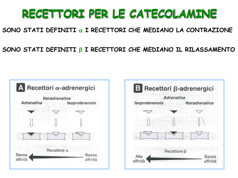 RECETTORI PER LE CATECOLAMINE SONO STATI DEFINITI I RECETTORI CHE MEDIANO LA CONTRAZIONE SONO STATI DEFINITI I RECETTORI CHE MEDIANO IL RILASSAMENTO RECETTORI PER LE CATECOLAMINE 1980-90 Gli studi molecolari di cloning hanno messo in evidenza l’esistenza di 10 recettori diversi per la NA In particolare sono state definite due famiglie eterogenee: 1: 1A, 1B, 1C, 1D 2: 2A, 2B, 2c : 1, 2, 3 RECETTORI PER LE CATECOLAMINE Studio di tipo farmacologico Negli anni ‘70 lo sviluppo di farmaci agonisti del recettore ha suggerito l’esistenza di eterogeneità nell’ambito di questi recettori Fenossibenzamina: recettori 1 post-sinaptici giunzionali Clonidina: recettori 2 pre-sinaptici recettori 2 postsinaptici extragiunzionali DISTRIBUZIONE E FUNZIONE DEI RECETTORI 1 MUSCOLATURA LISCIA VASALE arteriole e vene contrazione MUSCOLATURA LISCIA ORGANI stomaco rilassamento intestino: pareti sfinteri rilassamento tratto genito-urinario contrazione CUORE contrazione contrazione OCCHIO muscolo radiale dell’iride contrazione FEGATO glicogenolisi gluconeogenesi RECETTORI Famiglia 1 1 Sottotipi Trasduzione 1A IP3/DAG 1B IP3/DAG 1C IP3/DAG 1D ? DISTRIBUZIONE E FUNZIONE DEI RECETTORI TERMINALI NERVOSI catecolaminergici gangli intramurali dello stomaco MUSCOLATURA LISCIA VASALE arteriole: coronarie, pelle e mucose, renali MUSCOLATURA LISCIA ORGANI stomaco intestino RENE 2 inibizione liberazione NA inibizione liberazione ACh contrazione rilassamento rilassamento tubuli prossimali diminuzione escrezione Na+, k+, Cl- PANCREAS CELLULE diminuzione secrezione insulina PIASTRINE aggregazione RECETTORI Famiglia 2 Sottotipi 2 Trasduzione 2A cAMP; K+ 2B cAMP; Ca++ 2C cAMP Ca++ RECETTORI Famiglia Sottotipi Trasduzione 1 cAMP 2 cAMP 3 cAMP DISTRIBUZIONE E FUNZIONE DEI RECETTORI (NA=A) 1 CUORE Nodo SA Atrio aumento di frequenza aumento della contrattilità Nodo AV aumento della velocità di conduzione Hiss-Purkinje aumento della velocità di conduzione aumento dell’automatismo Ventricolo aumento della contrattilità aumento della velocità di conduzione aumento dell’automatismo aumento dell’automatismo RENE Apparato juxta-glomerulare aumento della secrezione di renina DISTRIBUZIONE E FUNZIONE DEI RECETTORI > (A NA) VASI arteriole: coronarie muscoli scheletrici polmonari renali gastrointestinali MUSCOLATURA SCHELETRICA MUSCOLATURE LISCE ORGANI stomaco intestino bronchi tratto genito-urinario FEGATO 2 vasodilatazione glicogenolisi rilassamento glicogenolisi neoglucogenesi Effetti dell’attivazione simpatica DISTRIBUZIONE E FUNZIONE DEI RECETTORI > (NA A) TESSUTO ADIPOSO 3 lipolisi meccanismo molecolare attivati dai recettori 1 nel cuore miocardio effetto inotropo positivo effetto dromotropo positivo meccanismi molecolari attivati dalle catecolamine nei vasi 1 2 effetti delle catecolamine sui vasi variano a seconda dei distretti e sono mediati dai recettori: 1, 2A e 2 distretto cutaneo: vasocostrizione 1 giunzionali 2A extragiunzionali muscoli scheletrici: vasodilatazione 2 rene: vasocostrizione 1 e 2A distretto splacnico: vasodilatazione 2 distretto polmonare: vasocostrizione 2 effetti renali delle catecolamine tubulo prossimale diminuzione del flusso 2A e 2C diminuzione dell’escrezione di Na+, K+ e Cl- apparato juxta-glomerulare aumento secrezione di renina 1 effetti delle catecolamine sulle muscolature lisce intestino rilassamento diretto 2 stomaco rilassamento indiretto 2A sfinteri contrazione 1 bronchi rilassamento diretto 2 effetti metabolici delle catecolamine fegato glicogenolisi glicogeno glucosio secrezione insulina e glucagone tessuto adiposo neoglucogenesi acidi grassi nel plasma METABOLISMO DELLE CATECOLAMINE • RICAPTAZIONE NELLE TERMINAZIONI NERVOSE • COMT • TRASFORMAZIONE METABOLICA • MAO • sulfotransferasi • DILUIZIONE PER DIFFUSIONE DALLO SPAZIO SINAPTICO E LA CAPTAZIONE NEI SITI EXTRANEURONALI •Nicotinico –canale ionico Na+ •Ca2+ –risposta eccitatoria •rapida –1 millisecondo •Muscarinico –metabotropo •proteine G –risposta eccitatoria o inibitoria •lenta Recettori colinergici Recettore nicotinico •5 subunità –2α ,β ,γ ,δ , ε –differenti sottotipi e •recettori muscolo scheletrico, gangli autonomi e SNC •differente sensibilità a farmaci e tossine •tutti attivati da nicotina –canale per Na+e Ca2+ •1 msec 50.000 Na2+ •potenziale postsinaptico eccitatorio Vie colinergiche centrali •Setto e n. basale di Meynert neocortex, ippocampo, bulbo olfattorio –processi cognitivi •Pontetalamo e striato –movimento •Midollotronco encefalico e mesencefalo •Recettori muscarinici •Recettori nicotinici –effetti pre-e postsinaptici –rilascio neurotrasmettitori •dopamina, n. accumbens •glutammato Effetti dell’attivazione parasimpatica SISTEMI A PROIEZIONE DIFFUSA Assoni lunghi e ramificati, che terminano in più aree cerebrali contemporaneamente Gruppi di neuroni con i corpi cellulari raggruppati in zone precise del SNC Sistema Motorio A seconda dell’area in cui viene liberato il neurotrasmettitore, i sistemi a proiezione diffusa influenzano una specifica attività Quindi i sistemi a proiezione diffusa: • influenzano specifiche attività cerebrali (azione specifica), a seconda della struttura che vanno a regolare • influenzano contemporaneamente più aree cerebrali (azione integrata) ad es., durante una situazione di pericolo: aumenta il rilascio di noradrenalina in più aree cerebrali: pianificazione di strategie difensive percezione degli stimoli sensoriali attività endocrina e comportamenti di fuga apprendimento risposte motorie Sintesi: tutti i neurotrasmettitori classici sono sintetizzati nelle terminazioni dell’assone (terminali sinaptici) 4: SISTEMI DOPAMINERGICI 1) Sistema Nigro – Striatale: • contiene il 75 % della dopamina del SNC • controllo motorio: iniziare movimenti • Morbo di Parkinson 2) Sistema Mesolimbico: • percezione sensoriale • comportamenti motivati (gratificazione e ricompensa) • apprendimento 