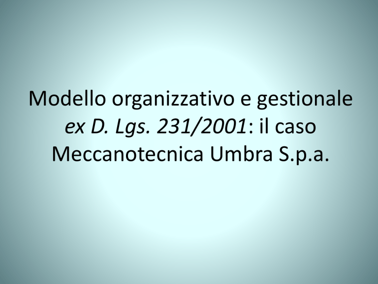 Modello organizzativo e gestionale ex D. Lgs. 231/2001: il caso Meccanotecnica Umbra S.p.a. Decreto legislativo 8 giugno 2001, n. 231 Il decreto legislativo 231/01 ha introdotto il concetto di responsabilità amministrativa delle imprese per reati commessi da amministratori, manager o dipendenti, collegando ad esse pesanti sanzioni pecuniarie o interdittive. Tale disposizione prevede l'attribuzione di alcuni tipi di reati non più solo alle persone fisiche che hanno commesso l'illecito, ma anche e soprattutto alle persone giuridiche (ad esempio le imprese presso le quali essi lavorano). I destinatari di tale Decreto sono gli enti dotati e non di personalità giuridica quali, ad esempio, Spa, Srl, Sapa, Snc, Sas, associazioni, cooperative, fondazioni, enti economici sia privati che pubblici e più in generale tutte le imprese organizzate in forma societaria. La normativa è esclusa solo per le imprese individuali. Capo I: Responsabilità Amministrativa dell’Ente Art. 6. Soggetti in posizione apicale e modelli di organizzazione dell'ente 1. Se il reato è stato commesso dalle persone indicate nell'articolo 5, comma 1, lettera a), l'ente non risponde se prova che: a) l'organo dirigente ha adottato ed efficacemente attuato, prima della commissione del fatto, modelli di organizzazione e di gestione idonei a prevenire reati della specie di quello verificatosi; b) il compito di vigilare sul funzionamento e l'osservanza dei modelli di curare il loro aggiornamento è stato affidato a un organismo dell'ente dotato di autonomi poteri di iniziativa e di controllo; c) le persone hanno commesso il reato eludendo fraudolentemente i modelli di organizzazione e di gestione; d) non vi è stata omessa o insufficiente vigilanza da parte dell'organismo di cui alla lettera b). Capo I: Responsabilità Amministrativa dell’Ente Art.6 Soggetti in posizione apicale e modelli di organizzazione dell'ente 2. In relazione all'estensione dei poteri delegati e al rischio di commissione dei reati, i modelli di cui alla lettera a), del comma 1, devono rispondere alle seguenti esigenze: a) individuare le attività nel cui ambito possono essere commessi reati; b) prevedere specifici protocolli diretti a programmare la formazione e l'attuazione delle decisioni dell'ente in relazione ai reati da prevenire; c) individuare modalità di gestione delle risorse finanziarie idonee ad impedire la commissione dei reati; d) prevedere obblighi di informazione nei confronti dell'organismo deputato a vigilare sul funzionamento e l'osservanza dei modelli; e) introdurre un sistema disciplinare idoneo a sanzionare il mancato rispetto delle misure indicate nel modello. COSA SI INTENDE PER MODELLO ORGANIZZATIVO E GESTIONALE… Modello organizzativo e gestionale Confindustria ha provveduto a formulare specifiche Linee Guida per la redazione del Modello di organizzazione, gestione e controllo per: Individuare le aree a rischio Creare un sistema di controlli interni Ovviamente, ogni impresa potrà costruire il proprio modello organizzativo, in base alle proprie caratteristiche. Il rischio reato di ogni impresa è strettamente dipendente dal settore economico, dalla complessità organizzativa - non solo dimensionale - dell’impresa e dell'area geografica in cui essa opera. Modello organizzativo e gestionale I modelli organizzativi e gestionali, secondo quanto disposto dal decreto, devono rispondere alle seguenti esigenze: • individuare le Aree a rischio nel cui ambito esiste la possibilità che vengano commessi i reati previsti dal Decreto; • prevedere specifici protocolli diretti a programmare la formazione e l'attuazione delle decisioni dell’ente in relazione ai reati da prevenire; • individuare modalità di gestione delle risorse finanziarie idonee a impedire la commissione di tali reati; • prevedere obblighi di informazione nei confronti dell'organismo deputato a vigilare sul funzionamento e l'osservanza del Modello; • introdurre un sistema disciplinare interno idoneo a sanzionare il mancato rispetto delle misure indicate nel Modello. Modello organizzativo e gestionale: Meccanotecnica Umbra S.p.a. MTU ha ritenuto opportuno procedere all’adozione del suddetto modello seguendo le linee guida dettate da Confindustria. Il processo di definizione del Modello si è articolato in due fasi: • la mappatura dei rischi finalizzata all’ identificazione delle aree e delle le attività a rischio; • la definizione del modello di organizzazione, accompagnata da incontri formativi tenuti da professionisti esperti della materia e rivolti ai soggetti operanti nelle aree a rischio. Modello organizzativo e gestionale: Meccanotecnica Umbra S.p.a. Il MOG adottato dalla MTU S.p.a. è suddiviso in due sezioni: • Parte generale: contiene una sintesi della disciplina posta dal decreto 231, descrive i principi che ispirano il documento, gli scopi e le caratteristiche dell’Organismo di Vigilanza, cioè l’ente preposto alla valutazione dell’efficacia del modello stesso; • Parte speciale: contiene una descrizione dei reati che l’azienda ritiene, data la tipologie delle attività svolte, ipotizzabili. Contiene, inoltre, una mappatura delle aree a rischio e i principi di comportamento e operativi che ispirano le procedure aziendali interne adottate nonché lo specifico sistema disciplinare atto a sanzionare eventuali violazioni del Modello. Modello organizzativo e gestionale della MTU S.p.a.: parte generale All’interno della Parte generale la MTU mette in evidenza: 1. Le finalità del modello, sintetizzabili nelle 3 seguenti: • evidenziare, a chi lavora a vario titolo per MTU, la possibilità di incorrere in caso di violazione delle disposizioni riportate, in un illecito passibile di sanzioni; • precisare la condanna di comportamenti illeciti, non solo perché violano disposizioni di legge, ma anche perché contrari ai valori etici e sociali che l’azienda persegue nello svolgimento della propria attività; • consentire l’ inte