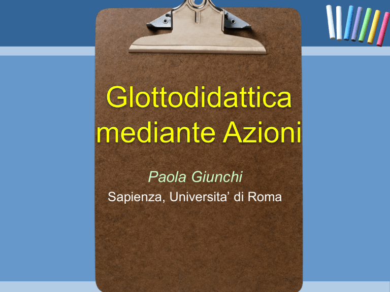 Paola Giunchi Sapienza, Universita’ di Roma Introduzione I • La glottodidattica studia il modo in cui si insegnano le lingue “altre”, ma • non solo le procedure pratiche messe in atto, ma anche le ragioni per cui queste funzionano, • diverse scienze contribuiscono alla glottodidatica come la psicolinguistica che indaga sui meccanismi che regolano l’acquisizione delle lingue. Introduzione II glottodidattica in dialogo costante con le neuroscienze Apprendimento via azioni Ruolo dell’azione nell’apprendimento. Apprendimento Azione Neurologia et al. Meccanismi neurologici nel linguaggio e nell’apprendimento, regole astratte dei grandi della psicologia del linguaggio, analisi del coinvolgimento degli emisferi, soprattutto di quello destro, nell’acquisizione della lingua altra ruolo dell’emisfero destro nella acquisizione della lingua altra Le teorie relazioni fra i meccanismi neurologici e l’apprendimento del linguaggio i neuroni specchio: cellule cerebrali del cervello collocate nell’area F5, a livello delle zone frontali Neuroni specchio La Habana - 2012 Neuroni specchio I Si attivano quando compiamo un movimento finalizzato (es. mostriamo la lingua) e anche quando osserviamo qualcun altro compiere quel dato movimento. Nel cervello dell’uomo possono osservarsi mediante tecniche di brain imaging. La Habana - 2012 Neuroni specchio II Se ho sete e decido di bere, nel momento in cui prendo la bottiglia i miei neuroni specchio si attivano. I neuroni specchio intervengono anche quando vedo qualcun altro che muove la mano per afferrare la bottiglia. La scoperta, (rivoluzionaria nel campo delle neuroscienze che alcuni l’hanno paragonata alla scoperta del DNA in biologia), è di un gruppo di ricercatori dell’Università di Parma, (cfr. Rizzolatti - Sinigaglia, 2006; Iacoboni, 2008). Neuroni specchio III Lo studio sugli animali sfrutta l’inserimento di elettrodi che consentono di “sentire” il neurone mirror che si attiva, si può udire proprio il rumore che fa quando entra in stato di eccitazione Mentre sugli umani gli studi sono più complessi e richiedono, spesso, una batteria di ricerche volte a confutare ogni possibile dubbio circa il coinvolgimento di una classe specifica di cellule. Specchi nel cervello questi neuroni si attivano… quando entriamo in relazione con gli altri, quanto essi incidono su apprendimento, acquisizione del linguaggio, emozioni, empatia fino ad arrivare all’ipotesi che li lega al disturbo autistico. Neroni specchio al lavoro I neuroni specchio si attivano anche quando la modalità di fruizione è uditiva. A differenza delle scimmie, questi neuroni umani, si attivano anche quando vedono un’azione solo mimata. In generale l’uomo utilizza le aree dei neuroni specchio per azioni molto più astratte rispetto ai macachi. Neuroni specchio e apprendimento Iacoboni (2008, 43) : «I neuroni specchio che rispondono all’uso di utensili costituiscono un’allettante evidenza empirica che collega i neuroni specchio al comportamento imitativo, un potente meccanismo per l’apprendimento». Le scimmie, imitando gli umani che mangiano, avrebbero appreso un altro modo utile per raggiungere l’obiettivo cibo! L’imitazione nell’apprendimento Capiamo le implicazioni per l’apprendimento. Se dei macachi hanno introdotto nel proprio repertorio motorio anche l’uso di utensili solo attraverso l’osservazione, quali le grandi potenzialità dei mirror negli umani. Si tratta di sfruttare queste potenzialita’ nell’apprendimento. La Habana - 2012 I neuroni specchio: un vocabolario di atti in comune I I neuroni specchio sono un substrato che abbiamo in comune con gli altri. Riconosciamo e apprendiamo dai gesti dell’altro perché sono i nostri. (Riconosco nel tuo movimento quello che solitamente compio io). È come se, a livello cerebrale, io avessi dentro di me la rappresentazione di un’azione che solitamente compio, ma che in questo caso è inibita. La Habana - 2012 I neuroni specchio: un vocabolario di atti in comune II Alcuni esperimenti dimostrano che i neuroni specchio ci permettono anche di capire l’intenzione dell’altro, tanto che i mirror sono stati collegati al senso di empatia. Cosa vuol dire che captiamo l’intenzione dell’altro? Che dai suoi gesti siamo in grado di decifrare qual è lo scopo sottostante. In un esperimento condotto sul modo di afferrare una tazza è stato messo in evidenza come, sia i movimenti di precisione che facciamo, sia il contesto, ci permettono di comprendere lo scopo che guida l’azione dell’altro. Basi fisiologiche delle azioni comunicative Noi condividiamo un vocabolario d’atti con l’altro, o o quello dell’osservatore è un atto potenziale, egli può contare su una selezione automatica delle strategie più efficaci in quel determinato contesto non si basa, quindi, su teorie, ma su basi fisiologiche concrete (Rizzolatti - Sinigaglia, 2006) Iacoboni (2008) ha dimostrato che esistono connessioni anatomiche e scambi di informazioni tra neuroni specchio, insula e sistema limbico, ovvero tra aree motorie e aree legate alle emozioni. I neuroni specchio: atti in comune aree motorie aree legate alle emozioni I neuroni specchio: esperimento I E’ stato chiesto ai soggetti di osservare e poi di imitare l’espressione di immagini di volti. Le tre aree si attivavano quando le immagini venivano solo guardate e tale eccitazione aumentava durante il momento imitativo. Questo accade perché l’empatia ha a che fare sia con l’azione (il gesto che vedo compiere all’altro) sia con l’emozione che essa suscita in me. Siamo empatici, quindi, grazie al sistema di specchi che esiste nel nostro cervello. l’ipotesi che una lesione ai mirror potrebbe essere la causa dell’autismo. Neuroni specchio e linguaggio Il sistema dei mirror ha spinto gli studiosi ad interrogarsi sulla sua implicazione nell’apprendimento del linguaggio. Il linguaggio viene considerato un insieme di “gesti fonetici” (Gal
