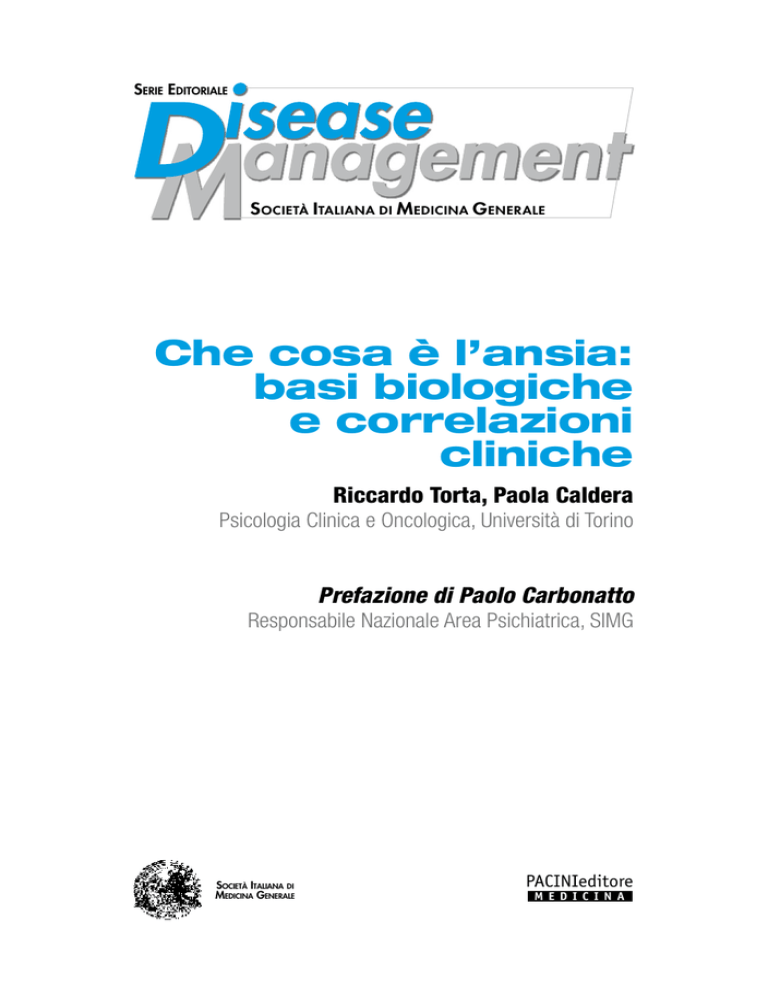 Serie Editoriale S ocietà Italiana di M edicina G enerale Che cosa è l’ansia: basi biologiche e correlazioni cliniche Riccardo Torta, Paola Caldera Psicologia Clinica e Oncologica, Università di Torino Prefazione di Paolo Carbonatto Responsabile Nazionale Area Psichiatrica, SIMG Società Italiana di Medicina Generale PACINIeditore MedicIna © Copyright 2008 by Pacini Editore S.p.A. – Pisa Realizzazione editoriale Pacini Editore S.p.A. Via Gherardesca 1 56121 Ospedaletto – Pisa [email protected] www.pacinimedicina.it Grafica e stampa Industrie Grafiche Pacini – Pisa In copertina Henri Matisse, Deux fillettes, fond jaune et rouge, 1947. @ by SIAE (autorizzazione richiesta agli aventi diritto) La pubblicazione è resa possibile grazie al contributo di Lundbeck Italia SpA Edizione fuori commercio. Omaggio per i Signori Medici Le fotocopie per uso personale del lettore possono essere effettuate nei limiti del 15% di ciascun volume/fascicolo di periodico dietro pagamento alla SIAE del compenso previsto dall’art. 68, commi 4 e 5, della legge 22 aprile 1941 n. 633. Le riproduzioni effettuate per finalità di carattere professionale, economico o commerciale o comunque per uso diverso da quello personale possono essere effettuate a seguito di specifica autorizzazione rilasciata da AIDRO, Corso di Porta Romana n. 108, Milano 20122, e-mail [email protected] e sito web www.aidro.org. Indice Prefazione......................................................................................... 5 Introduzione....................................................................................... 9 Circuiti neuronali implicati nella modulazione dell’ansia....................... 11 Meccanismi neurotrasmettitoriali........................................................ 15 Acido γ-amino butirrico................................................................ 15 Neurotrasmettitori eccitatori......................................................... 17 Monoamine................................................................................. 21 Neurosteroidi............................................................................... 25 L’asse ipotalamo-ipofisi-surrene................................................... 25 Sistema immunitario.................................................................... 29 Disturbi d’ansia e circuiti psicobiologici.............................................. 33 Disturbo di panico....................................................................... 33 Disturbo d’ansia generalizzato..................................................... 38 Disturbo post-traumatico da stress.............................................. 39 Fobia semplice............................................................................ 41 Disturbi da ansia sociale.............................................................. 41 Disturbo ossessivo-compulsivo................................................... 42 Prefazione Tutti siamo convinti di conoscere il significato del termine ansia, anche se poi abbiamo difficoltà a darne una definizione precisa. Sicuramente l’ansia appartiene alla sfera dell’affettività ed è un’emozione o un sentimento che può avere intensità o cause diverse; l’ansia è una condizione fisiologica e psicologica non anormale in sé, ma che può interessare la psichiatria. Il problema cruciale è distinguere tra ansia normale e ansia patologica. L’ansia normale è un fenomeno importante per la nostra sopravvivenza, uno stato di allerta psichica con attivazione generalizzata delle risorse individuali, diretta contro uno stimolo ben conosciuto e reale. L’ansia normale è dunque una reazione d’allarme che non solo non interferisce negativamente, ma al contrario potenzia le capacità operative del soggetto nel risolvere una situazione. Bisogna essere consapevoli che se l’ansia esiste è anche perché i geni che la permettono sono arrivati fino a noi; mentre i nostri progenitori che non avevano “i geni per l’ansia” sono probabilmente finiti, prima di potersi riprodurre, nello stomaco di qualche animale carnivoro. L’ansia diventa patologica quando tali reazioni sono quantitativamente esagerate, con conseguente caduta nel livello delle prestazioni. Tutto ciò è stato ben documentato negli animali già nel 1908 da Yerkes e Doson, che elaborarono sulla base dei loro esperimenti l’omonima legge (Fig. 1). Per capire meglio il rapporto tra ansia e prestazioni (e anche l’effetto che su di esso hanno i farmaci ansiolitici) si pensi ad esempio alla situazione di uno studente che deve preparare un esame. Se il suo livello di ansia fosse troppo basso, non si impegnerebbe a sufficienza nella preparazione: un minimo di ansia costituisce uno stimolo indispensabile. Ma se il livello di ansia fosse troppo elevato, egli rischierebbe di non riuscire a concentrarsi abbastanza per studiare e di sentirsi poi paralizzato davanti al professore ed incapace di proferire parola. Quindi l’uso eventuale di un ansiolitico potrebbe rivelarsi utile nel caso di un’ansia eccessiva, migliorando la prestazione; ma il medesimo ansiolitico, se usato per sedare un’ansia fisiologica, peggiorerebbe la prestazione ed il nostro studente potrebbe essere rallentato non più dalla paura ma dalla sonnolenza. In alcune condizioni morbose, l’ansia ed i disturbi somatici ad essa correlati vengono individuati in termini operativi come veri e propri criteri diagnostici. In questo volumetto saranno esaminati più avanti i vari disturbi d’ansia classificabili secondo i criteri del DSM. Sembra però utile cominciare ad accennare qui in modo sintetico e pratico ai principali quadri sintomatologici che un medico può di fatto trovarsi ad affrontare, inquadrandoli semplicemente in base ai seguenti elementi: a) durata; b) presenza di stimoli scatenanti; c) presenza di contenuti specifici dei fenomeni psico Che cosa è l’ansia: basi biologiche e correlazioni cliniche patolo