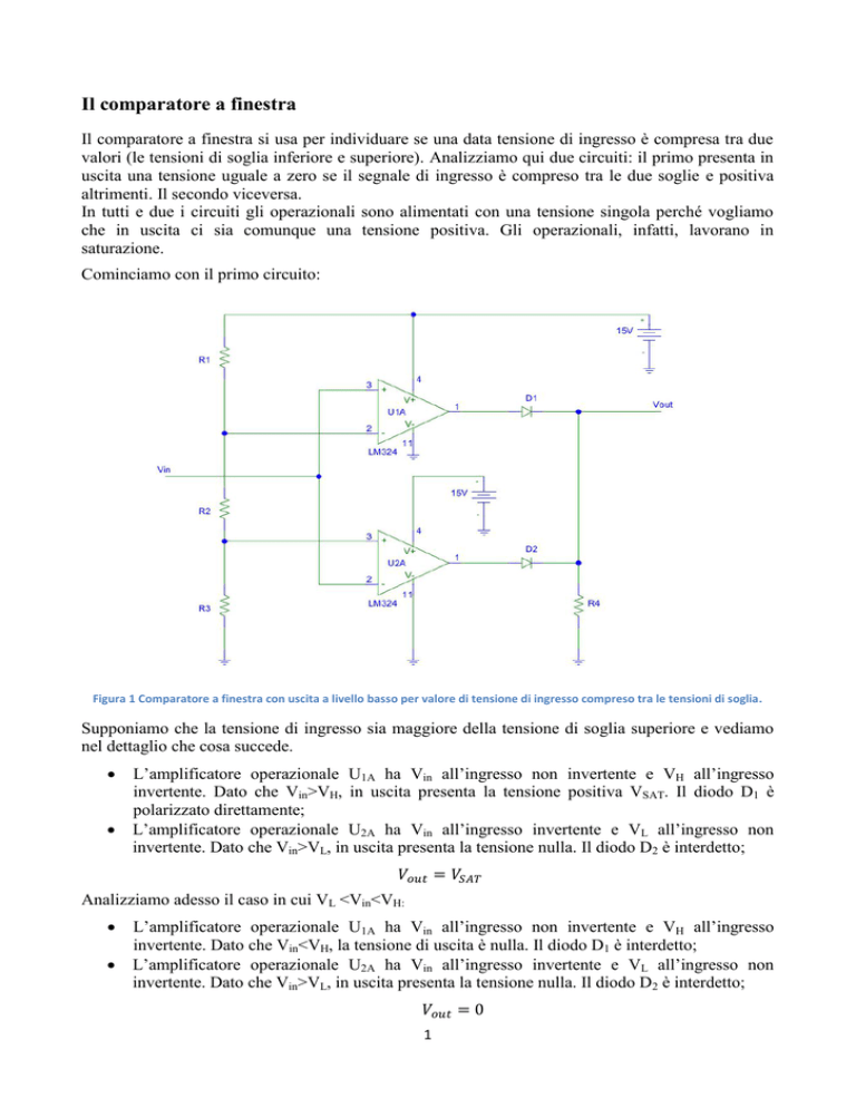 Il comparatore a finestra Il comparatore a finestra si usa per individuare se una data tensione di ingresso è compresa tra due valori (le tensioni di soglia inferiore e superiore). Analizziamo qui due circuiti: il primo presenta in uscita una tensione uguale a zero se il segnale di ingresso è compreso tra le due soglie e positiva altrimenti. Il secondo viceversa. In tutti e due i circuiti gli operazionali sono alimentati con una tensione singola perché vogliamo che in uscita ci sia comunque una tensione positiva. Gli operazionali, infatti, lavorano in saturazione. Cominciamo con il primo circuito: Figura 1 Comparatore a finestra con uscita a livello basso per valore di tensione di ingresso compreso tra le tensioni di soglia. Supponiamo che la tensione di ingresso sia maggiore della tensione di soglia superiore e vediamo nel dettaglio che cosa succede. ο· ο· L’amplificatore operazionale U1A ha Vin all’ingresso non invertente e VH all’ingresso invertente. Dato che Vin>VH, in uscita presenta la tensione positiva VSAT. Il diodo D1 è polarizzato direttamente; L’amplificatore operazionale U2A ha Vin all’ingresso invertente e VL all’ingresso non invertente. Dato che Vin>VL, in uscita presenta la tensione nulla. Il diodo D2 è interdetto; πππ’π‘ = πππ΄π Analizziamo adesso il caso in cui VL <Vin<VH: ο· ο· L’amplificatore operazionale U1A ha Vin all’ingresso non invertente e VH all’ingresso invertente. Dato che Vin<VH, la tensione di uscita è nulla. Il diodo D1 è interdetto; L’amplificatore operazionale U2A ha Vin all’ingresso invertente e VL all’ingresso non invertente. Dato che Vin>VL, in uscita presenta la tensione nulla. Il diodo D2 è interdetto; πππ’π‘ = 0 1 Consideriamo il terzo ed ultimo caso dove Vin<VL ο· ο· L’amplificatore operazionale U1A ha Vin all’ingresso non invertente e VH all’ingresso invertente. Dato che Vin<VH, in uscita presenta tensione nulla. Il diodo D1 è interdetto; L’amplificatore operazionale U2A ha Vin all’ingresso invertente e VL all’ingresso non invertente. Dato che Vin<VL, in uscita presenta la tensione positiva VSAT. Il diodo D2 è polarizzato direttamente; πππ’π‘ = πππ΄π Disegniamo il grafico dei segnali di ingresso e di uscita: Figura 2 Segnali di ingresso ed uscita del comparatore a finestra di figura 1. Ricaviamo infine le tensioni di soglia usando i partitori di tensione: ππ» = π 2 + π 3 π π 1 + π 2 + π 3 πΆπΆ ππΏ = π 3 π π 1 + π 2 + π 3 πΆπΆ Secondo circuito: Figura 3 Comparatore a finestra con uscita a livello alto per valore di tensione di ingresso compreso tra le tensioni di soglia. 2 Analizziamo, come prima, i tre casi. Tensione di ingresso maggiore della tensione di soglia superiore: ο· ο· L’amplificatore operazionale invertente. Dato che Vin>VH, direttamente; L’amplificatore operazionale invertente. Dato che Vin>VL, polarizzato inversamente; U1A ha Vin all’ingresso invertente e VH all’ingresso non in uscita presenta tensione nulla. Il diodo D1 è polarizzato U2A ha Vin all’ingresso non invertente e VL all’ingresso in uscita presenta la tensione positiva VSAT. Il diodo D2 è πππ’π‘ = 0 Nel secondo caso VL <Vin<VH: ο· ο· L’amplificatore operazionale U1A ha Vin all’ingresso invertente e VH all’ingresso non invertente. Dato che Vin<VH, in uscita presenta tensione positiva VSAT. Il diodo D1 è polarizzato inversamente; L’amplificatore operazionale U2A ha Vin all’ingresso non invertente e VL all’ingresso invertente. Dato che Vin>VL, in uscita presenta la tensione nulla. Il diodo D2 è polarizzato inversamente; πππ’π‘ = πππ΄π Terzo Vin<VL: ο· ο· L’amplificatore operazionale U1A ha Vin all’ingresso invertente e VH all’ingresso non invertente. Dato che Vin<VH, in uscita presenta tensione positiva VSAT. Il diodo D1 è polarizzato inversamente; L’amplificatore operazionale U2A ha Vin all’ingresso non invertente e VL all’ingresso invertente. Dato che Vin<VL, in uscita presenta la tensione positiva VSAT. Il diodo D2 è polarizzato direttamente; πππ’π‘ = 0 Grafico dei segnali di ingresso e di uscita: Figura 4 Segnali di ingresso ed uscita del comparatore a finestra di figura 3. Le tensioni di soglia sono state ricavate precedentemente. Possiamo dimensionare le resistenze R1, R2 ed R3 per ottenere le tensioni di soglia desiderate. 3 Per il dimensionamento di R4 dal datasheet dell’amplificatore operazionale scelto (LM324) si legge che: πΌππ’π‘ = ππΆπΆ < 40ππ΄ π 4 In questo esempio troviamo: 15 < 40 β 10−3 π 4 → π 4 > 15 β 103 = 375β¦ 40 Scegliamo R4=10kβ¦ come suggerito in uno schema di esempio del datasheet. In questo caso, quando l’uscita è a livello alto (circa 15V) la corrente di uscita assuma il seguente valore: πΌππ’π‘ = ππΆπΆ 15 = 4 = 1.5ππ΄ π 4 10 Sempre sul datasheet si legge che per un corretto funzionamento degli amplificatori operazionali le altre resistenze devono essere di qualche kβ¦. Questo file può essere scaricato gratuitamente. Se pubblicato citare la fonte. Matilde Consales 4