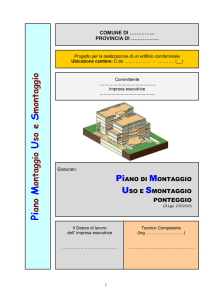 COMUNE DI …………… PROVINCIA DI …………….. Piano Montaggio Uso e Smontaggio Progetto per la realizzazione di un edificio condominiale Ubicazione cantiere: C.da ………………. - ………… (__) Committente …………………………………….. Impresa esecutrice …………………………………… Elaborato: PiANO DI MONTAGGIO USO E SMONTAGGIO PONTEGGIO (D.Lgs. 235/2003) Il Datore di lavoro dell’ Impresa esecutrice Tecnico Competente (Ing. ……………………..) ………………………………… ………………………………………. 1 PREMESSA Le modifiche apportate al D.Lgs. n. 626/1994 dall’ex D.Lgs. n. 235/2003, in particolare l'introduzione dell'articolo 36-quater, avevano integrato la normativa vigente in materia di montaggio, uso e smontaggio dei ponteggi metallici. Alla normativa previgente, che non era stata modificata, e che era imperniata su quanto richiesto dal D.P.R. n. 164/1956 e dalle sue circolari esplicative, erano stati introdotti sostanzialmente due elementi innovativi: 1) la redazione da parte dell'impresa che monterà il ponteggio di un piano di manutenzione, uso e smontaggio (PIMUS); 2) la formazione obbligatoria e specifica del personale che sarà addetto al montaggio, smontaggio e trasformazione del ponteggio. Il PIMUS è stato reso obbligatorio dall'art. 36-quater del D.Lgs. n. 626/1994, modificato dal D.Lgs. n. 235/2003: "Art. 36-quater – ad oggi art.136 comma 1 del D.Lgs 81/08 Art. 136. - Montaggio e smontaggio: 1. Nei lavori in quota il datore di lavoro provvede a redigere a mezzo di persona competente un piano di montaggio, uso e smontaggio (Pi.M.U.S.), in funzione della complessità del ponteggio scelto, con la valutazione delle condizioni di sicurezza realizzate attraverso l'adozione degli specifici sistemi utilizzati nella particolare realizzazione e in ciascuna fase di lavoro prevista. Tale piano può assumere la forma di un piano di applicazione generalizzata integrato da istruzioni e progetti particolareggiati per gli schemi speciali costituenti il ponteggio, ed è messo a disposizione del preposto addetto alla sorveglianza e dei lavoratori interessati. Il datore di lavoro procede alla redazione di un calcolo di resistenza e di stabilità e delle corrispondenti configurazioni di impiego, se nella relazione di calcolo del ponteggio scelto non sono disponibili specifiche configurazioni strutturali con i relativi schemi di impiego. Il datore di lavoro è esonerato da tale obbligo se provvede all'assemblaggio del ponteggio in conformità agli schemi previsti nel libretto del ponteggio. Il datore di lavoro assicura che i ponteggi siano montati, smontati o trasformati sotto la sorveglianza di un preposto e ad opera di lavoratori che hanno ricevuto una formazione adeguata e mirata alle operazioni previste. Pertanto, il presente documento assolve agli obblighi normativi succitati indicando e definendo: a) i soggetti addetti al montaggio e la loro abilitazione a farlo per legge; b) le corrette procedure di montaggio/trasformazione/smontaggio del ponteggio e delle sue parti; c) gli schemi di montaggio del ponteggio e delle sue parti, riferendosi a quelli già allegati all'autorizzazione ministeriale alla commercializzazione del ponteggio ovvero, nei casi in cui ciò risulti essere necessario, predisponendo apposito progetto da parte di ingegnere o architetto abilitato). Descrizione dell'opera L'oggetto del presente documento è il montaggio, lo smontaggio e la manutenzione di un ponteggio per la realizzazione di lavori di: costruzione di un fabbricato per civile abitazione ed attività commerciale, sito in C.da ………………….. – in …………………… (__) La struttura portante dell'edificio: in cemento armato. Pi.M.U.S. relativo al cantiere edile sito in c.da ………………….. – Comune di ………………………. 2 2 Dati Cantiere Committente: Indirizzo: Comune: Oggetto appalto: Lavori di costruzione fabbricato condominiale 3 Impresa Esecutrice Impresa esecutrice: EDIL ……………… Rappresentante legale: Sede legale: Telefono/FAX: Direttore tecnico: Servizio prevenzione e prot. assunzione diretta del SPP 3. 1 Squadra Preposto: Telefono (cell. di cantiere) : Il datore di lavoro assicura che i ponteggi siano montati, smontati o trasformati sotto la diretta sorveglianza di un preposto, a regola d'arte e conformemente al Pi.M.U.S., ad opera di lavoratori che hanno ricevuto una formazione adeguata e mirata alle operazioni previste. La formazione ha carattere teorico-pratico e deve riguardare: a) la comprensione del piano di montaggio, smontaggio o trasformazione del ponteggio; b) la sicurezza durante le operazioni di montaggio, smontaggio o trasformazione del ponteggio con riferimento alla legislazione vigente; c) le misure di prevenzione dei rischi di caduta di persone o di oggetti; d) le misure di sicurezza in caso di cambiamento delle condizioni meteorologiche pregiudizievoli alla sicurezza del ponteggio; e) le condizioni di carico ammissibile; f) qualsiasi altro rischio che le suddette operazioni di montaggio, smontaggio o trasformazione possono comportare. Il caposquadra (preposto) come previsto dall'art.136 comma 6 è quella figura che deve sorvegliare direttamente i propri sottoposti durante l'esecuzione dell'opera provvisionale ed in particolare: - deve sorvegliare la realizzazione del ponteggio da una posizione che gli permetta di intervenire in ausilio ai lavoratori per eventuali difficoltà; - deve assicurare che gli ancoraggi siano realizzati secondo quanto previsto dall'autorizzazione ministeriale; 1 - Lavoratore: Indirizzo: Telefono (cell. di cantiere) : 2- Lavoratore: Indirizzo: Telefono (cell. di cantiere) : I compiti del lavoratore subordinato sono di attuare le misure comportamentali che sono state oggetto di formazione, informazione ed addestramento. Deve utilizzare i D.P.I., agire in base a quanto concordato con il caposquadra (preposto) in merito alle atti