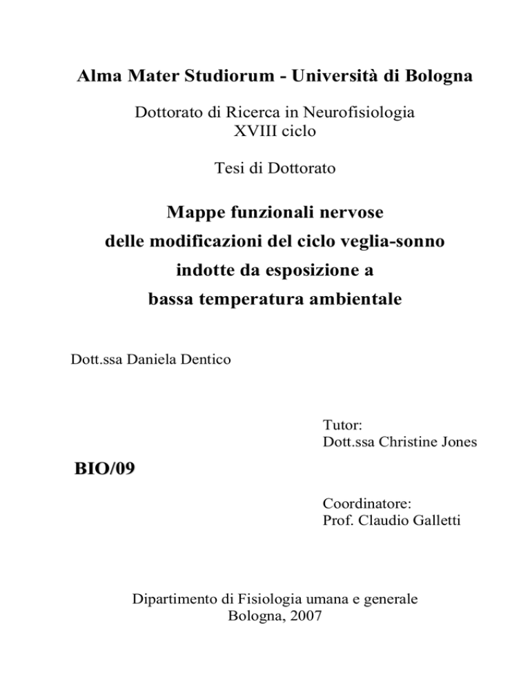 Alma Mater Studiorum - Università di Bologna Dottorato di Ricerca in Neurofisiologia XVIII ciclo Tesi di Dottorato Mappe funzionali nervose delle modificazioni del ciclo veglia-sonno indotte da esposizione a bassa temperatura ambientale Dott.ssa Daniela Dentico Tutor: Dott.ssa Christine Jones BIO/09 Coordinatore: Prof. Claudio Galletti Dipartimento di Fisiologia umana e generale Bologna, 2007 Indice generale Indice delle abbreviazioni..................................................................................... 4 Lista dei fornitori ................................................................................................ 12 Introduzione ..............................................................15 Attività elettrica cerebrale nel ciclo veglia-sonno ............................................ 21 Fenotipo chimico dei neuroni implicati nel controllo del ciclo veglia-sonno . 25 Meccanismi ipotetici del controllo nervoso del sonno nei mammiferi ........... 27 Omeostasi del sonno ............................................................................................ 32 Omeostasi nel sonno............................................................................................ 36 La termoregolazione dipende dagli stati comportamentali............................. 37 Il ruolo della PO-AH nella termoregolazione e nel sonno............................... 38 Metodi di deprivazione ipnica............................................................................ 40 Risultati molecolari della intensificazione dei processi della veglia e del sonno ............................................................................................................................... 45 Ulteriori modalità molecolari di studio del sonno e scopo della ricerca ........ 46 c-Fos come marcatore dei processi della veglia e del sonno nel ratto ............ 55 Materiali e metodi .....................................................61 Fase di messa a punto delle metodiche sperimentali ..................... 63 Anestesia .............................................................................................................. 63 Fissazione tissutale .............................................................................................. 65 Crioprotezione ..................................................................................................... 69 Congelamento ...................................................................................................... 69 Preparazione dei vetrini ..................................................................................... 72 Taglio.................................................................................................................... 72 Colorazione istologica ......................................................................................... 74 Metodica immunoistochimica ............................................................................ 77 1 Aspetti generali.................................................................................................. 77 Uso di un modello noto di attivazione tissutale per controllare i parametri della tecnica immunoistochimica ............................................................................... 79 Studio di un modello specifico di incremento dell'attivazione tissutale............ 83 Elaborazioni successive e affinamento tecnico del protocollo immunoistochimico ........................................................................................... 86 Studi di competizione ........................................................................................ 89 Fase sperimentale ..............................................................................91 Condizioni sperimentali ...................................................................................... 91 Processamento immunoistochimico ................................................................... 93 Analisi dei dati ...................................................................................96 Acquisizione delle immagini in forma digitale.................................................. 96 Sistema a scansione manuale (fase pre-sperimentale)....................................... 96 Sistema a scansione automatica (fase sperimentale) ....................................... 101 Correzione della vignettatura........................................................................... 104 Riferimenti anatomici........................................................................................ 109 Griglie per il conteggio dei nuclei marcati ...................................................... 116 Metodo di conteggio dei nuclei marcati........................................................... 120 Elaborazione dei dati......................................................................................... 126 Analisi statistica ................................................................................................. 127 Risultati................................................................... 129 Immunoreattività per c-Fos.............................................................................. 131 Conta dei nuclei marcati ................................................................................... 131 Pattern caratteristici ......................................................................................... 134 Analisi relative ai parametri area e intensità.................................................. 136 Discussione............................................................. 139 2 Considerazioni metodologiche ....................................................... 141 Modalità di campionamento dalle aree nervose prescelte............................. 141 Immunoreattività attribuibile al c-Fos in condizioni prolungate di stimolazione ................................................................................................