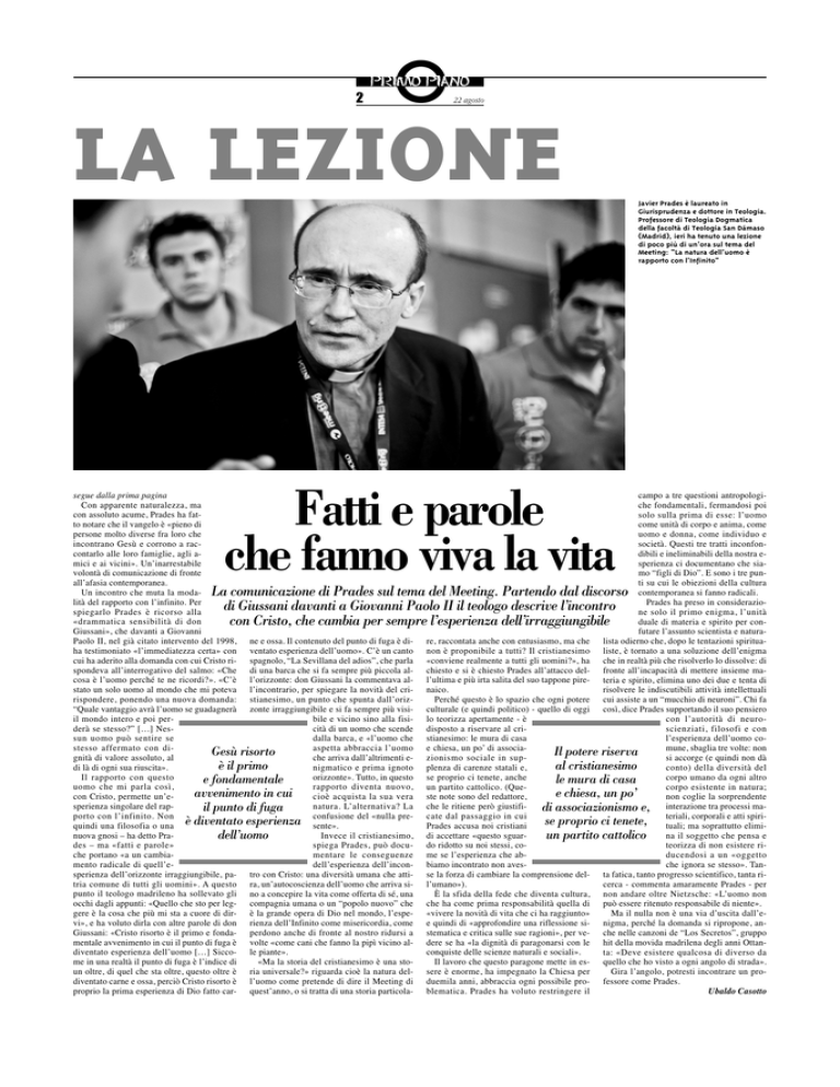 PRIMO PIANO 2 22 agosto LA LEZIONE Javier Prades è laureato in Giurisprudenza e dottore in Teologia. Professore di Teologia Dogmatica della facoltà di Teologia San Dámaso (Madrid), ieri ha tenuto una lezione di poco più di un’ora sul tema del Meeting: “La natura dell’uomo è rapporto con l’Infinito” Fatti e parole che fanno viva la vita segue dalla prima pagina Con apparente naturalezza, ma con assoluto acume, Prades ha fatto notare che il vangelo è «pieno di persone molto diverse fra loro che incontrano Gesù e corrono a raccontarlo alle loro famiglie, agli amici e ai vicini». Un’inarrestabile volontà di comunicazione di fronte all’afasia contemporanea. Un incontro che muta la modalità del rapporto con l’infinito. Per spiegarlo Prades è ricorso alla «drammatica sensibilità di don Giussani», che davanti a Giovanni Paolo II, nel già citato intervento del 1998, ne e ossa. Il contenuto del punto di fuga è diha testimoniato «l’immediatezza certa» con ventato esperienza dell’uomo». C’è un canto cui ha aderito alla domanda con cui Cristo ri- spagnolo, “La Sevillana del adios”, che parla spondeva all’interrogativo del salmo: «Che di una barca che si fa sempre più piccola alcosa è l’uomo perché te ne ricordi?». «C’è l’orizzonte: don Giussani la commentava alstato un solo uomo al mondo che mi poteva l’incontrario, per spiegare la novità del cririspondere, ponendo una nuova domanda: stianesimo, un punto che spunta dall’oriz“Quale vantaggio avrà l’uomo se guadagnerà zonte irraggiungibile e si fa sempre più visiil mondo intero e poi perbile e vicino sino alla fisiderà se stesso?” […] Nescità di un uomo che scende sun uomo può sentire se dalla barca, e «l’uomo che stesso affermato con diaspetta abbraccia l’uomo Gesù risorto gnità di valore assoluto, al che arriva dall’altrimenti eè il primo di là di ogni sua riuscita». nigmatico e prima ignoto Il rapporto con questo orizzonte». Tutto, in questo e fondamentale uomo che mi parla così, rapporto diventa nuovo, avvenimento in cui cioè acquista la sua vera con Cristo, permette un’esperienza singolare del rapnatura. L’alternativa? La il punto di fuga porto con l’infinito. Non confusione del «nulla prequindi una filosofia o una è diventato esperienza sente». nuova gnosi – ha detto PraInvece il cristianesimo, dell’uomo des – ma «fatti e parole» spiega Prades, può docuche portano «a un cambiamentare le conseguenze mento radicale di quell’edell’esperienza dell’inconsperienza dell’orizzonte irraggiungibile, pa- tro con Cristo: una diversità umana che attitria comune di tutti gli uomini». A questo ra, un’autocoscienza dell’uomo che arriva sipunto il teologo madrileno ha sollevato gli no a concepire la vita come offerta di sé, una occhi dagli appunti: «Quello che sto per leg- compagnia umana o un “popolo nuovo” che gere è la cosa che più mi sta a cuore di dir- è la grande opera di Dio nel mondo, l’espevi», e ha voluto dirla con altre parole di don rienza dell’Infinito come misericordia, come Giussani: «Cristo risorto è il primo e fonda- perdono anche di fronte al nostro ridursi a mentale avvenimento in cui il punto di fuga è volte «come cani che fanno la pipì vicino aldiventato esperienza dell’uomo […] Sicco- le piante». me in una realtà il punto di fuga è l’indice di «Ma la storia del cristianesimo è una stoun oltre, di quel che sta oltre, questo oltre è ria universale?» riguarda cioè la natura deldiventato carne e ossa, perciò Cristo risorto è l’uomo come pretende di dire il Meeting di proprio la prima esperienza di Dio fatto car- quest’anno, o si tratta di una storia particola- campo a tre questioni antropologiche fondamentali, fermandosi poi solo sulla prima di esse: l’uomo come unità di corpo e anima, come uomo e donna, come individuo e società. Questi tre tratti inconfondibili e ineliminabili della nostra esperienza ci documentano che siamo “figli di Dio”. E sono i tre punti su cui le obiezioni della cultura contemporanea si fanno radicali. Prades ha preso in considerazione solo il primo enigma, l’unità duale di materia e spirito per confutare l’assunto scientista e naturare, raccontata anche con entusiasmo, ma che lista odierno che, dopo le tentazioni spirituanon è proponibile a tutti? Il cristianesimo liste, è tornato a una soluzione dell’enigma «conviene realmente a tutti gli uomini?», ha che in realtà più che risolverlo lo dissolve: di chiesto e si è chiesto Prades all’attacco del- fronte all’incapacità di mettere insieme mal’ultima e più irta salita del suo tappone pire- teria e spirito, elimina uno dei due e tenta di naico. risolvere le indiscutibili attività intellettuali Perché questo è lo spazio che ogni potere cui assiste a un “mucchio di neuroni”. Chi fa culturale (e quindi politico) - quello di oggi così, dice Prades supportando il suo pensiero lo teorizza apertamente - è con l’autorità di neurodisposto a riservare al criscienziati, filosofi e con stianesimo: le mura di casa l’esperienza dell’uomo coe chiesa, un po’ di associamune, sbaglia tre volte: non Il potere riserva zionismo sociale in supsi accorge (e quindi non dà al cristianesimo plenza di carenze statali e, conto) della diversità del se proprio ci tenete, anche corpo umano da ogni altro le mura di casa un partito cattolico. (Quecorpo esistente in natura; e chiesa, un po’ ste note sono del redattore, non coglie la sorprendente che le ritiene però giustifidi associazionismo e, interazione tra processi macate dal passaggio in cui corporali e atti spirise proprio ci tenete, teriali, Prades accusa noi cristiani tuali; ma soprattutto elimidi accettare «questo sguarun partito cattolico na il soggetto che pensa e do ridotto su noi stessi, coteorizza di non esistere rime se l’esperienza che abducendosi a un «oggetto biamo incontrato non avesche ignora se stesso». Tanse la for