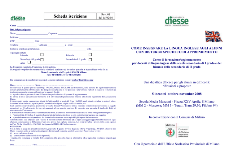 Scheda iscrizione Rev. 01 del 15/02/08 Corso _____________________________________________________________________________________ Dati del partecipante Nome ____________________________ Cognome _________________________________________________ Indirizzo ___________________________________________________________________________________ CAP _________________ Città _________________________________________________________________ Telefono ________________ Cellulare _______________ e – mail ___________________________________ Istituto o scuola di appartenenza _________________________________________ Città ___________________ Tipologia istituto Infanzia Primaria Secondaria di I grado Altro COME INSEGNARE LA LINGUA INGLESE AGLI ALUNNI CON DISTURBO SPECIFICO DI APPRENDIMENTO Secondaria di II grado ______________________________________________________________ La frequenza è gratuita, l’iscrizione è obbligatoria. Si prega di compilare in stampatello la scheda di iscrizione ed inviarla o portarla in busta chiusa o via fax a: Diesse Lombardia via Pergolesi 8 20124 Milano Fax: 02/45409013 Tel: 02/36587288 Per informazioni è possibile rivolgersi al seguente indirizzo e-mail: [email protected] Data …………………….. Firma…………………………………….. In osservanza di quanto previsto dal D.lgs. 196/2003, Diesse, TITOLARE del trattamento, nella persona del legale rappresentante dichiara che la finalità del trattamento dei dati personali che sono in suo possesso o che verranno richiesti in seguito o comunicati da terzi sono necessari e saranno utilizzati per le seguenti finalità: A. organizzazione e gestione di corsi di formazione professionale e di percorsi di aggiornamento B. attività di invio del calendario formativo e di altro materiale promozionale relativo alle attività organizzate dall’Associazione Diesse. Il titolare potrà venire a conoscenza di dati definiti sensibili ai sensi del D.lgs 196/2003, quali idonei a rivelare lo stato di salute, l’adesione ad un sindacato, a partiti politici, convinzioni religiose, origini raziali od etniche, ecc. I dati saranno conservati presso gli archivi e le banche dati dall’Associazione Diesse e saranno comunicati esclusivamente ai soggetti competenti per l’espletamento dei servizi necessari ad una corretta gestione del rapporto, con garanzia di tutela dei diritti di riservatezza dell’interessato. L’eventuale non comunicazione, o comunicazione errata, di una delle informazioni necessarie, ha come conseguenze emergenti: l’impossibilità del titolare di garantire la congruità del trattamento stesso ai patti contrattuali per cui esso sia eseguito; la possibile mancata corrispondenza dei risultati del trattamento stesso agli obblighi imposti dalla normativa . Tale trattamento sarà effettuato con l’ausilio di moderni sistemi informatici ed ad opera di soggetti appositamente incaricati. Ogni ulteriore comunicazione o diffusione avverrà solo previo Suo esplicito consenso. Lei potrà far valere i propri diritti come espressi dall’art. 7,8,9 e 10 del D.lgs. 196/2003, rivolgendosi al TITOLARE del trattamento. CONSENSO Con la firma in calce alla presente informativa, preso atto di quanto previsto dagli art. 7,8,9 e 10 del D.lgs. 196/2003, attesto il mio libero consenso scritto al trattamento dei propri dati personali comuni e sensibili (crocettare l’espressione scelta) ( ) senza esclusione alcuna ( ) con esclusione della finalità di cui al punto b) vincolandolo comunque al rispetto delle condizioni della presente clausola informativa ed ad ogni altra condizione imposta per legge. Data ……………………. Firma…………………………………….. Corso di formazione/aggiornamento per docenti di lingua inglese della scuola secondaria di I grado e del biennio della secondaria di II grado Una didattica efficace per gli alunni in difficoltà: riflessioni e proposte 5 incontri ottobre-novembre 2008 Scuola Media Manzoni - Piazza XXV Aprile, 8 Milano (MM 2 - Moscova; MM 3 - Turati; Tram 29,30; Filobus 94) In convenzione con il Comune di Milano Con il patrocinio dell’Ufficio Scolastico Provinciale di Milano Obiettivi: conoscere la problematica dei disturbi specifici dell’apprendimento riflettere sulla normativa italiana ed europea dai traguardi di sviluppo per le competenze alle competenze dell’obbligo di istruzione mettere a fuoco una metodologia di lavoro adeguata conoscere esperienze efficaci elaborare un sistema di valutazione coerente conoscere e valutare l’utilizzo di strumenti compensativi Contenuti: i disturbi dell’apprendimento: diagnosi e difficoltà specifiche la normativa vigente in Italia e le prospettive a livello europeo l’insegnamento dell’inglese nei diversi gradi di scuola media: metodo, strumenti e valutazione presentazione di esperienze significative quando e come utilizzare gli strumenti compensativi Programma degli incontri: I disturbi specifici di apprendimento: diagnosi e difficoltà specifiche La normativa vigente in Italia e le prospettive a livello europeo Lunedì 20 ottobre 2008 - 15.30-17.30 L’insegnamento dell’inglese nei diversi gradi di scuola: metodi, strumenti e valutazione Giovedì 6 novembre 2008 - 15.30-17.30 Laboratorio a gruppi suddivisi per ordini di scuola: Presentazione di esperienze significativi Costruzione di piste di lavoro Lunedì 17 novembre 2008 - 15.30-17.30 Laboratorio a gruppi suddivisi per ordini no [ ] Se sì, quali________________________________________________________ _________________________________________________________________ _________________________________________________________________ Conosce la normativa specifica relativa alla DSA si [ ] no [ ] Dislessia Disgrafia Disortografia Disnomia Discalculia [ [ [ [ [ ] ] ] ] ] Quali difficoltà e problemi ha rilevato: _________________________________________________________________ _________________________________________________________________ di scuola: Presentazione d