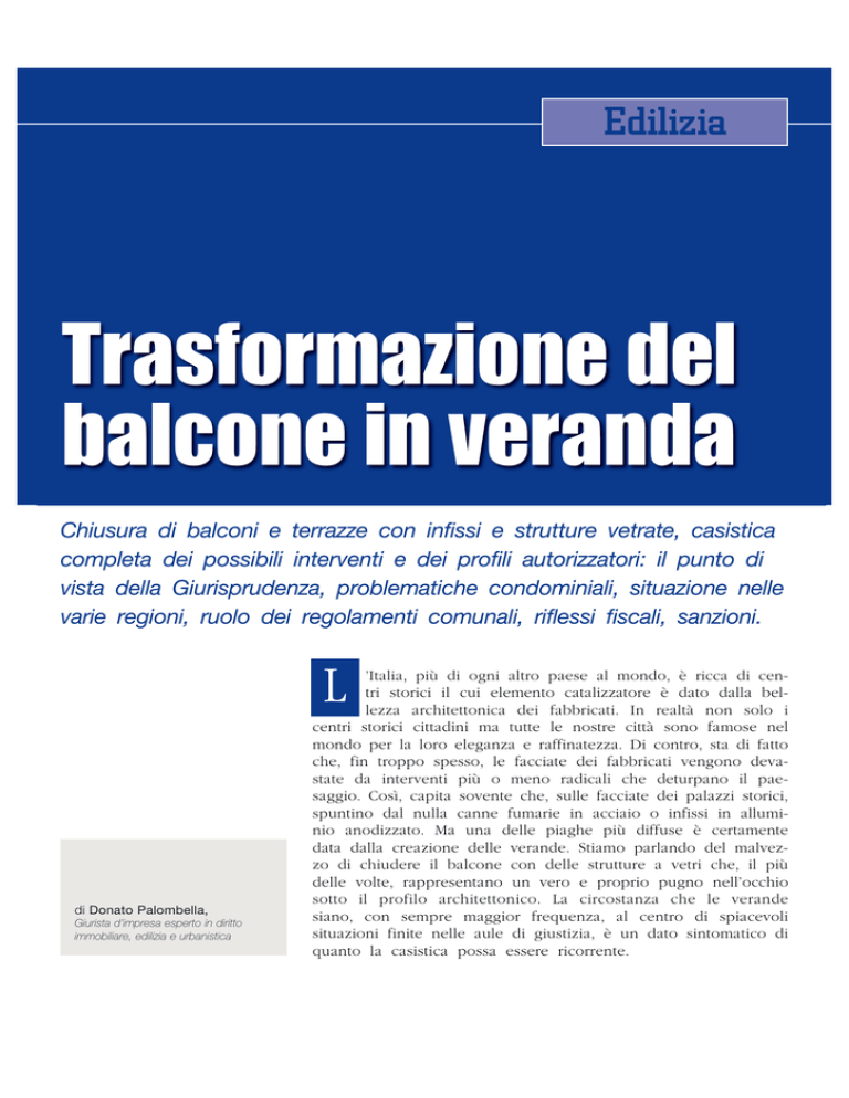 Edilizia Trasformazione del balcone in veranda Chiusura di balconi e terrazze con infissi e strutture vetrate, casistica completa dei possibili interventi e dei profili autorizzatori: il punto di vista della Giurisprudenza, problematiche condominiali, situazione nelle varie regioni, ruolo dei regolamenti comunali, riflessi fiscali, sanzioni. L di Donato Palombella, Giurista d’impresa esperto in diritto immobiliare, edilizia e urbanistica ’Italia, più di ogni altro paese al mondo, è ricca di centri storici il cui elemento catalizzatore è dato dalla bellezza architettonica dei fabbricati. In realtà non solo i centri storici cittadini ma tutte le nostre città sono famose nel mondo per la loro eleganza e raffinatezza. Di contro, sta di fatto che, fin troppo spesso, le facciate dei fabbricati vengono devastate da interventi più o meno radicali che deturpano il paesaggio. Così, capita sovente che, sulle facciate dei palazzi storici, spuntino dal nulla canne fumarie in acciaio o infissi in alluminio anodizzato. Ma una delle piaghe più diffuse è certamente data dalla creazione delle verande. Stiamo parlando del malvezzo di chiudere il balcone con delle strutture a vetri che, il più delle volte, rappresentano un vero e proprio pugno nell’occhio sotto il profilo architettonico. La circostanza che le verande siano, con sempre maggior frequenza, al centro di spiacevoli situazioni finite nelle aule di giustizia, è un dato sintomatico di quanto la casistica possa essere ricorrente. Il punto di vista tecnico-costruttivo. In primo luogo occorre partire dalla definizione del “balcone” e della “terrazza”. Il balcone, altrimenti detto poggiolo, consiste in una sporgenza dalla facciata dell’edificio munita di ringhiera o parapetto. Si differenzia dalla terrazza in quanto, mentre il primo costituisce un elemento aggiunto al corpo principale dell’edificio, consistendo, quindi, in una sporgenza, la terrazza è inclusa nel fabbricato. Vengono definiti, invece, “balconi a castello” i balconi incassati nel perimetro dei muri portanti dell’edificio; in questo caso la struttura portante del piano del balcone a castello è parte integrante di quella dell’edificio. La veranda, quindi, altro non è se non un balcone (o una terrazza) chiuso mediante un telaio (in pvc, alluminio, anticorodal, legno o altro) che supporta materiali trasparenti (vetro) o opachi (policarbonato). L’aspetto urbanistico. A ben vedere la realizzazione di una veranda non compromette, solo e semplicemente, l’aspetto architettonico o il decoro del corpo di fabbrica ma coinvolge problematiche sotto certi aspetti più severe e restrittive. Ad essere chiamata in causa, infatti, è l’urbanistica che considera la chiusura del balcone come un’opera capace di influire sulla cubatura e sulla superficie utile e, quindi, idonea ad incidere sui parametri edilizi. E non è tutto. La costruzione del manufatto, infatti, in casi estremi, potrebbe incidere negativamente sulla statica del fabbricato. La realizzazione di tale tipologia di opera richiede, quindi, l’intervento di un tecnico che, in base alla propria esperienza e preparazione professionale saprà valutare, caso per caso, la necessità di procedere alla presentazione di un progetto ottenendo, se del caso, il preventivo rilascio di un idoneo titolo abilitativo dei lavori. Da un punto di vista prettamente tecnico la realizzazione di una veranda comporta certamente la realizzazione di un nuovo volume determinando un amento della superficie utile, una modifica della sagoma del fabbricato ed un cambio di destinazione. Il parere della giurisprudenza: la tipologia dell’opera. La giurisprudenza, comunque, non è concorde nell’inquadramento del manufatto all’interno di un’unica categoria. La realizzazione della veranda, infatti, a volte viene considerata alla stregua di un “intervento di ristrutturazione edilizia” (T.A.R. Molise, Sez. I, 1° giugno 2911 n. 310) mentre altre volte viene inquadrato tra gli interventi di nuova costruzione ex art. 3 comma 1 lett. e) del d.P.R. n. 380/2001 (Corte di Cassazione, Sez. III pen., 20 luglio 2011, n. 28927). In entrambi i casi la sostanza non cambia molto in quanto il manufatto dovrebbe essere assentito con un titolo abilitativo dei lavori. Le sanzioni penali. La terza Sezione penale della Corte di Cassazione, con la sentenza dell’11 maggio 2011, n. 18507 ha adottato la linea dura contro chi, in assenza di un titolo abilitativo dei lavori, aveva chiuso il balcone con una intelaiatura metallica e pannelli in vetro. Si tratterebbe, secondo il Palazzaccio, di un vero e proprio abuso edilizio. Con quale risultato? All’imputato viene contestata la violazione dell’articolo 44, lett. b) del d.P.R. 6 giugno 2001, n. 380, il che si traduce in una pena detentiva di due mesi di arresto, una sanzione di 15.000 euro e la condanna alle spese di giudizio. Nel caso in esame la veranda è stata considerata come un nuovo locale autonomamente utilizzabile destinato a durare nel tempo con l’effetto di ampliare la superficie e la cubatura dell’immobile. La sanzione, probabilmente, sarebbe stata evitata se l’imputato fosse riuscito a dimostrare di aver realizzato una struttura precaria destinata a sopperire ad esigenze temporanee e contingenti. Vietato “svecchiare” le vecchie strutture. Capita, alle volte, di avere in casa una vecchia veranda realizzata con mate- 2 quaderni di legislazione tecnica riali non più confacenti alle nuove esigenze. Ci si chiede, in questo caso, se si possa procedere alla sostituzione dei vecchi materiali con altri più moderni. Secondo il T.A.R. della Campania (Napoli, Sez. IV, sentenza depositata in cancelleria il 6 marzo 2009, n. 1039) la sostituzione dei materiali con altri più moderni non salva dalle manette. Nel caso in esame, il proprietario si era limitato a sostituire i materiali con cui era stata realizzata una vecchia veranda di circa 7 mq. Il TAR partenopeo, questa volta, ha ordi