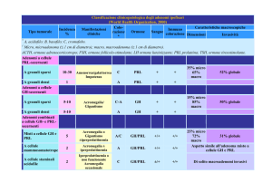 SAPIENZA UNIVERSITA’ DI ROMA 1a Facoltà di Medicina e Chirurgia Dipartimento di Fisiopatologia Medica PATOLOGIA IPOTALAMO-IPOFISI Antonio F. Radicioni [email protected] Rappresentazione schematica asse ipotalamo-ipofisi-gonadi IPOTALAMO IPOFISI ANTERIORE Rappresentazione schematica asse ipotalamo-ipofisi-gonadi •ACTH •GH •FSH - LH •TSH - PRL IPOFISI ANTERIORE IPOTALAMO •CRH •GHRH •GnRH •TRH CELLULE DELL’ADENOIPOFISI • Secernenti PRL • Secernenti ACTH • Secernenti GH • Secernenti LH-FSH • Secernenti TSH 20% 15% 50% 10% 5% CLASSIFICAZIONE EZIOPATOGENETICA DELL’IPOPITUITARISMO • Ipopituitarismo funzionale •Malnutrizione, digiuno prolungato • Ipopituitarismo organico •Congenito •Acquisito CLASSIFICAZIONE EZIOPATOGENETICA DELL’IPOPITUITARISMO • Ipopituitarismo organico • Congenito •Agenesia e ipoplasia ipofisaria •S. di Kalmann •S. della “sella vuota” •Deficit isolato di ormoni ipofisari • Acquisito •Lesioni tumorali occupanti spazio •Iatrogeno •Ipofisite autoimmune •Vascolare •Traumi •Istiocitosi, Sarcoidosi, Emocromatosi SINDROME DI KALLMANN IPOGONADISMO IPOGONADOTROPO ANOSMIA, IPOSMIA Delezione nel braccio corto del cromosoma X (Xp 22.3) Gene KAL codifica per una proteina di adesione coinvolta nella migrazione dei neuroni GnRH-secernenti e dei neuroni olfattivi nella regione dellipotalamo mediobasale Sindrome di Kallmann R.S. R.S. Età: Età:21 21aa aa altezza: altezza:182.1 182.1 peso: peso: 78.900 78.900 FSH: FSH:0.32 0.32mUI/mL mUI/mL LH: LH:0.08 0.08mUI/mL mUI/mL Te: Te:1.10 1.10ng/mL ng/mL DHT: DHT:22.6 22.6ng/mL ng/mL E2: E2:12.8 12.8pg/mL pg/mL PRL: PRL:7.20 7.20ng/mL ng/mL Quesito diagnostico: anorgasmia Sindrome di Kallmann R.S. R.S. Età: Età: 30 30 aa aa altezza: altezza: peso: peso: FSH: FSH: 1.62 1.62 mUI/mL mUI/mL LH: LH: 0.12 0.12 mUI/mL mUI/mL Te: Te: 5.30 5.30 ng/mL ng/mL Fte: Fte: 36.30 36.30 pg/mL pg/mL DHT: DHT: 116.0 116.0 ng/mL ng/mL E2: E2: 18.9 18.9 pg/mL pg/mL PRL: PRL: 6.16 6.16 ng/mL ng/mL DIAGNODI DIFFERENZIALE IPOGONADISMO IPOGONADOTROPO • DEFICIT IPOFISARIO MULTIPLO (IPOPITUITARISMO) - IDIOPATICO - SECONDARIO a patologie dell’ipofisi o di strutture adiacenti Tumori Craniofaringoma, Germinoma, Glioma, Meningioma, Pinealoma Disordini infiltrativi Sarcoidosi, Emocromatosi, Istiocitosi X Trauma cranico Terapia radiante Ipofisite DIAGNOSI IPOPITUITARISMO Indagini di 1° livello FSH, LH, GH, PRL, TSH, ACTH E2, T, FTe, Cortisolo, FT3, FT4, IGF1 DIAGNOSI IPOPITUITARISMO Indagini di 2° livello Asse somatotropo > Test al GHRH + Arginina (1µg/Kg + 30 g/100 ml ev) Asse tiroideo > Test al TRH (200 µg ev in bolo) Asse surrenalico > Test all’ACTH (250 µg ev) > Test al CRH (100 µg ev) Asse gonadico > Test al GnRH (100 µg ev) TEST AL GnRH: Soggetto normale BARATTA SERGIO 05/07/99 1000 Te INHB FSH LH 400 350 25 800 20 400 INHB (pg/mL) 600 250 15 200 10 150 100 200 5 LH & FSH (mUI/mL) Te (ng/dL) 300 50 0 0 0 0 15 30 45 60 90 120 1440 time (min) TEST AL GnRH: IPOGONADISMO IPOGONADOTROPO congenito CARDILLO ZALLO LUCA 15/07/99 Te INHB FSH LH 400 1000 350 25 800 20 300 15 200 10 150 100 200 5 LH & FSH (mUI/mL) Te (ng/dL) 400 250 INHB (pg/mL) 600 50 0 0 0 0 15 30 45 60 90 120 1440 time (min) DIAGNOSI IPOPITUITARISMO Indagini di 3° livello RMN con contrasto angio-RMN (aneurismi dell’a. carotide interna TERAPIA IPOPITUITARISMO Cortisone acetato (25 mg + 12,5 mg) L-tiroxina sodica (50 µg – 25 µg) Rec-GH (0,025-0,035 mg/kg/die – 0,15-0,3 mg/die) Esteri del testosterone (100-250/14-28 gg im IPOGONADISMO IPOGONADOTROPO POST-CH DOPO T Te Te E2 E2 10 10 8 8 Te (ng/mL) Te (ng/mL) Free-Te (pg/mL) Free-Te (pg/mL) 700 700 DHT DHT FTe FTe 30 30 20 20 35 35 600 600 500 500 6 6 400 400 300 300 4 4 10 10 30 30 25 25 20 20 200 200 2 2 0 0 40 40 800 800 Testoviron depot 250 fl i.m. 0 0 100 100 0 0 7 7 14 14 21 21 0 0 15 15 10 10 Tempi (gg) Tempi (gg) Livelli di degli steroidi sessuali in paziente di 37 anni, affetto da ipogonadismo ipogonadotropo post-chirurgico (adenoma ipofisario GH-secernente), dopo testosterone i.m. E2 (pg/mL) E2 (pg/mL) 12 12 DHT (pg/mL) DHT (pg/mL) 40 40 Sindrome della “sella vuota” C.A. C.A. Età: Età:51 51aa aa altezza: altezza:147,1 147,1 peso: peso: 39,2 39,2 FSH: FSH:0.35 0.35mUI/mL mUI/mL LH: LH:0.05 0.05mUI/mL mUI/mL Te: Te:0.08 0.08ng/mL ng/mL Fte: Fte:0.01 0.01pg/mL pg/mL DHT: DHT:44.0 44.0ng/dL ng/dL PRL: PRL:30.60 30.60ng/mL ng/mL TSH: TSH:1.23 1.23uUI/mL uUI/mL FT3: FT3:2.35 2.35pg/mL pg/mL FT4: FT4:0.71 0.71ng/dL ng/dL SHBG: SHBG:107 107nmol/L nmol/L E2: E2:3.09 3.09pg/mL pg/mL ACTH: ACTH:31.0 31.0pg/mL pg/mL Cortisolo Cortisolo::72.0 72.0ng/mL ng/mL SINDROME DELLA SELLA VUOTA INCIDENZA: 5-23% in casistiche autoptiche DEFINIZIONE: Lo spazio subaracnoideo si espande nella sella turcica riempiendola parzialmente con liquido cerebrospinale, determinando un aumento del volume della stessa con conseguente appiattimento dell’ipofisi. Incontinenza del diaframma sellare (micromeningocele intrasellare) SINDROME DELLA SELLA VUOTA CAUSE: •Intervento chirurgico all’ipofisi •Terapia radiante •Infarto ipofisario post-partum (Sindrome di Sheehan) •Terapia medica (ex bromocriptina) I tumori ipofisari PRL e GH secernenti, sono soggetti ad infarti emorragici subclinici, inducendo un affondamento della cisterna soprasellare nella stessa sella. SINDROME DELLA SELLA VUOTA SINDROME DELLA SELLA VUOTA RMN immagine in sagittale: ipofisi compressa con parsiale riempimento della sella turcica da liquido cerebrospinale. TUMORI IPOFISARI 1) 2/3: neoplasie con basso ritmo di crescita - se non funzionanti, non sono rilevabili clinicamente, e la loro scoperta è accidentale; - se funzionanti, danno gravi sindromi cliniche (acromegalia, malattia di Cushing…) e possono essere letali anche se la proliferazione tumorale è bassa; 2) 1/3: tumori a rapida crescita • funzionanti o non funzionanti •diventando invasivi, creano problemi da compressione meccanica e/o ipopituitarismo per dis