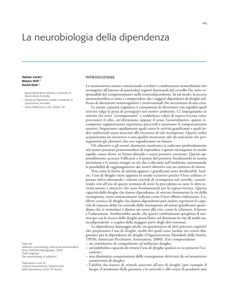 103 La neurobiologia della dipendenza Adrian Carter 1 Wayne Hall 2 David Nutt 3 1 Queensland Brain Institute, University of Queensland, Australia 2 School of Population Health, University of Queensland, Australia 3 Henry Wellcome L.I.N.E, Bristol, UK Tratto da: Addiction neurobiology: ethical and social implications, EMCDDA Monographs, 2009 Titolo originale: The neurobiology of addiction Traduzione a cura di: Unità di Neuroscienze, Dipartimento delle Dipendenze ULSS 20 Verona INTRODUZIONE Le neuroscienze stanno cominciando a svelare i cambiamenti neurochimici che avvengono all’interno di particolari regioni funzionali del cervello che sono responsabili del comportamento nella tossicodipendenza. In tal modo, la ricerca neuroscientifica ci aiuta a comprendere che i soggetti dipendenti da droghe soffrono di alterazioni neurocognitive e motivazionali che necessitano di una cura. Le nostre capacità cognitive ci consentono di discernere con rapidità quali attività valga la pena di perseguire nel nostro ambiente. Ci impegniamo in attività che sono “ricompensanti” e soddisfano valori di sopravvivenza come procurarsi il cibo, un’abitazione, oppure il sesso. Generalmente, queste ricompense rappresentano esperienze piacevoli e motivano il comportamento assunto. Impariamo rapidamente quali siano le attività gratificanti e quali indizi ambientali siano associati alla ricezione di tali ricompense. Questi indizi acquisiscono un incentivo o una qualità motivante tale da assicurare che perseguiremo gli obiettivi che essi segnaleranno in futuro. Gli obiettivi o gli eventi altamente motivanti si radicano profondamente nel nostro pensiero permettendoci di rispondere a queste ricompense in modo rapido, senza sforzi, in forma abituale e senza pensiero cosciente. Questo apprendimento accresce l’efficacia e il potere del pensiero focalizzando la nostra attenzione e le nostre energie su ciò che è rilevante nell’ambiente aumentando le possibilità di raggiungimento dei nostri obiettivi con un minimo di sforzo. Non tutte le forme di attività apprese e gratificanti sono desiderabili. Inoltre, l’uso di droghe viene appreso in modo eccessivo perché il loro utilizzo ripetuto attiva oltremodo i sistemi centrali di ricompensa nel cervello, consentendo così all’uso di queste sostanze di avere la precedenza su tutte le altre attività mirate a obiettivi che sono fondamentali per la sopravvivenza. Questa capacità delle droghe che danno dipendenza, di attivare fortemente la via della ricompensa, viene comunemente indicata come il loro effetto rinforzante. L’utilizzo cronico di droghe che danno dipendenza può inoltre reprimere la capacità di risposta della via centrale della ricompensa ad azioni gratificanti quotidiane che ci stimolano e danno un senso alla vita, come le relazioni, il lavoro e l’educazione. Sembrerebbe anche che questi cambiamenti spieghino il motivo per cui la ricerca delle droghe possa finire col dominare la vita di molti tossicodipendenti, a scapito della maggior parte degli altri interessi. La dipendenza danneggia anche un quantitativo di altri processi cognitivi che perpetuano l’uso di droghe, molti dei quali sono inclusi nei criteri diagnostici per la dipendenza da droghe (Organizzazione Mondiale della Sanità, 1993b; American Psychiatric Association, 2000). Essi comprendono: – un sentimento di compulsione ad utilizzare droghe; – un’indebolita capacità di evitare l’uso di droghe qualora se ne presenti l’occasione; – una diminuita comprensione delle conseguenze derivanti da un’assunzione ininterrotta di droghe; – l’abilità che hanno di stimoli associati all’uso di droghe (per esempio il luogo, il momento della giornata o le attività) e allo stress di produrre una 104 - Elementi di NEUROSCIENZE E DIPENDENZE ricaduta nell’uso di droghe in un individuo astinente persino mesi o anni dopo aver smesso. La neurobiologia della dipendenza incomincia a scoprire come l’uso cronico di droghe che danno dipendenza possa sconvolgere anche altri importanti vie neurali nel cervello che portano a questi deficit cognitivi. L’uso cronico di droga può provocare cambiamenti neurochimici nelle regioni corticali superiori della parte frontale del cervello (corteccia frontale) che rendono la droga così attraente, e può danneggiare la capacità di dominare gli impulsi a non usare le droghe. Ciò sortisce l’effetto di focalizzare l’attenzione del soggetto dipendente sull’uso di droga e può rendere più difficoltose le decisioni di non assumerne. Si crede che questi cambiamenti spieghino anche la comparsa di desiderio compulsivo (craving) per le sostanze d’abuso e il continuo consumo di droga nonostante le conseguenze terribilmente negative per il tossicodipendente. I neuroadattamenti in altre parti della corteccia frontale sarebbero coinvolti nell’alterata capacità di valutare le conseguenze di un uso ininterrotto di droghe. La scoperta di cambiamenti persistenti nelle regioni del cervello responsabili dell’apprendimento e della memoria aiuta anche a spiegare il perché la ricaduta nell’utilizzo di droghe sia così frequente nonostante mesi e talvolta anni di astinenza. I neuroadattamenti a livello delle sinapsi all’interno di queste regioni conferiscono un’incrementata salienza ai ricordi correlati all’uso di droghe. Di conseguenza, eventi o indizi che riportano alla memoria questi ricordi (per esempio un’immagine di uno strumento di iniezione o della droga stessa; rivisitare luoghi dove la droga è stata consumata) ha la capacità di innescare forte dediderio compulsivo per la sostanza d’abuso, spesso risultanti in una ricaduta all’uso di droga. Questi neuroadattamenti si sono verificati in tossicodipendenti in astinenza da mesi (Volkow e Fowler, 2000). Lo stress rappresenta un forte fattore scatenante della ricaduta, e le neuroscienze cominciano anche a spiegare come l’utilizzo cronico di droghe possa rendere i tossicodipendenti 