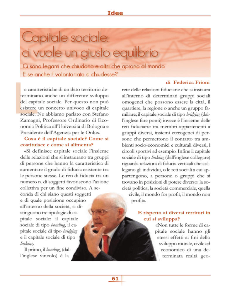 Idee Capitale sociale: ci vuole un giusto equilibrio Ci sono legami che chiudono e altri che aprono al mondo. E se anche il volontariato si chiudesse? di Federica Frioni rete delle relazioni fiduciarie che si instaura all’interno di determinati gruppi sociali omogenei che possono essere la città, il quartiere, la regione o anche un gruppo familiare; il capitale sociale di tipo bridging (dall’inglese fare ponti) invece è l’insieme delle reti fiduciarie tra membri appartenenti a gruppi diversi, insiemi eterogenei di persone che permettono il contatto tra ambienti socio-economici e culturali diversi, i circoli sportivi ad esempio. Infine il capitale sociale di tipo linking (dall’inglese collegare) riguarda relazioni di fiducia verticali che collegano gli individui, o le reti sociali a cui appartengono, a persone o gruppi che si trovano in posizioni di potere diverso: la società politica, la società commerciale, quella civile, il mondo for profit, il mondo non profit». e caratteristiche di un dato territorio determinano anche un differente sviluppo del capitale sociale. Per questo non può esistere un concetto univoco di capitale sociale. Ne abbiamo parlato con Stefano Zamagni, Professore Ordinario di Economia Politica all’Università di Bologna e Presidente dell’Agenzia per le Onlus. Cosa è il capitale sociale? Come si costituisce e come si alimenta? «Si definisce capitale sociale l’insieme delle relazioni che si instaurano tra gruppi di persone che hanno la caratteristica di aumentare il grado di fiducia esistente tra le persone stesse. Le reti di fiducia tra un numero n. di soggetti favoriscono l’azione collettiva per un fine condiviso. A seconda di chi siano questi soggetti e di quale posizione occupino all’interno della società, si distinguono tre tipologie di capitale sociale: il capitale sociale di tipo bonding, il capitale sociale di tipo bridging e il capitale sociale di tipo linking. Il primo, il bonding, (dall’inglese vincolo) è la E rispetto ai diversi territori in cui si sviluppa? «Non tutte le forme di capitale sociale hanno gli stessi effetti ai fini dello sviluppo morale, civile ed economico di una determinata realtà geo- 61 Idee grafica. Precisamente si dimostra che quando il capitale sociale di tipo bonding è troppo alto, costituisce un impedimento al progresso. Questo spiega perché ad esempio il nostro Mezzogiorno non riesce ad agganciare il Nord: nell’Italia del Sud c’è tanto capitale bonding, troppo poco bridging e quasi per nulla linking, invece per quel determinato territorio servirebbe il tipo bridging perché importante ai fini dello sviluppo economico, mentre se vogliamo un progresso che non sia solo economico, ma anche civile e morale allora bisogna aggiungere anche il linking. Insomma bisogna smetterla di parlare di un solo capitale sociale, perché questo confonde le idee: infatti nel Meridione c’è tantissimo capitale sociale, ma di quello sbagliato». perché da una parte c’è molto capitale sociale di tipo bridging, ma soprattutto ce ne è tanto anche di quello linking. Tra le regioni italiane è quella che ne ha di più, supera anche la Lombardia che ha molto bridging, valido invece per un notevole sviluppo economico. In Emilia Romagna, dove c’è invece un’alta idea del “link”, organizzazioni di volontariato o anche quelle di cooperazione sociale riescono a stabilire legami forti con il Comune, la Regione, il mondo for profit ed i risultati si vedono. Per fare un esempio, in questi giorni è uscito sui giornali che l’università di Bologna è stata la prima in Italia, battendo anche Roma che è più grande del 30, 34%, nell’acquisizione dei fondi per la ricerca scientifica gestiti da Bruxelles. Questo è potuto accadere semplicemente perché l’università si è collegata con l’associazione industriali di Bologna e anche con altri soggetti appartenenti al non profit. Insieme hanno fatto partita comune ed i risultati si sono visti». Per fare un esempio pratico? «Posso avvalermi di un’analogia biomedicale. Quando misuriamo il colesterolo, troviamo due tipi di grassi nel sangue, i saturi e gli insaturi e cioè quelli che fanno male e quelli che fanno meno male. Nel nostro caso è la stessa cosa: non basta dire solo capitale sociale. Se in una realtà geografica c’è troppo capitale sociale di tipo bonding è un male, non è un bene. Nel Sud la maggior parte delle reti di fiducia le troviamo tra i membri di un stessa famiglia, del casato, del parentado e il rischio è quello, come accade spesso, di diventare un gruppo chiuso e di non fidarsi più degli altri. Analizzando invece una regione come l’Emilia Romagna, possiamo affermare che, da questo punto di vista, è all’avanguardia, Ma allora bisognerebbe puntare solo su due tipi di capitale sociale? «Non voglio dire che il capitale sociale bonding non serva, è chiaro che serve anche quello, ma nella giusta misura. Il segno che in un determinato territorio c’è troppo bonding è dato dallo sviluppo della corruzione, del nepotismo, i legami familiari troppo stretti che sono di fatto molto negativi perché impediscono ai giovani di emergere, di far carriera. Se non si fa parte di un certo casato non si va avanti e allora io credo che i giovani del Sud Italia dovrebbero vedere e capire queste cose e ri- 62 Idee vute maniere, a modificare la composizione dei tipi di capitale sociale di una determinata realtà geografica: sempre riducendo il primo, equilibrando il secondo e soprattutto aumentando il terzo. Il volontariato è fondamentale, senza volontariato non ci sarebbe società perché è l’antidoto al bonding. Per sua natura, ed è una caratteristica importantissima, il volontariato è universale, perché deve essere sempre pronto a fornire il proprio servizio o la propria testimonianza nei confronti di tutti, anche di quelli che stanno dall’altra parte del mondo. Ecco perché abbiamo sempre più bisogno di volontari. A volte però accade che