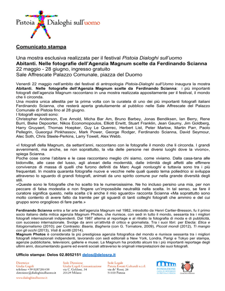 Comunicato stampa Una mostra esclusiva realizzata per il festival Pistoia Dialoghi sull’uomo Abitanti. Nelle fotografie dell’Agenzia Magnum scelte da Ferdinando Scianna 22 maggio - 28 giugno, ingresso gratuito Sale Affrescate Palazzo Comunale, piazza del Duomo Venerdì 22 maggio nell’ambito del festival di antropologia Pistoia-Dialoghi sull’Uomo inaugura la mostra Abitanti. Nelle fotografie dell’Agenzia Magnum scelte da Ferdinando Scianna: i più importanti fotografi dell’agenzia Magnum raccontano in una mostra realizzata appositamente per il festival, il mondo che li circonda. Una mostra unica allestita per la prima volta con la curatela di uno dei più importanti fotografi italiani Ferdinando Scianna, che resterà aperta gratuitamente al pubblico nelle Sale Affrescate del Palazzo Comunale di Pistoia fino al 28 giugno. I fotografi esposti sono: Christopher Anderson, Eve Arnold, Micha Bar Am, Bruno Barbey, Jonas Bendiksen, Ian Berry, Rene Burri, Bieke Depoorter, Nikos Economopoulos, Elliott Erwitt, Stuart Franklin, Jean Gaumy, Jim Goldberg, Harry Gruyaert, Thomas Hoepker, Guy Le Querrec, Herbert List, Peter Marlow, Martin Parr, Paolo Pellegrin, Gueorgui Pinkhassov, Mark Power, George Rodger, Ferdinando Scianna, David Seymour, Alec Soth, Chris Steele-Perkins, Larry Towell, Alex Webb. «I fotografi della Magnum, da settant’anni, raccontano con le fotografie il mondo che li circonda. I grandi avvenimenti, ma anche, se non soprattutto, la vita delle persone nei diversi luoghi dove la vivono», spiega Scianna. Poche cose come l’abitare e le case raccontano meglio chi siamo, come viviamo. Dalla casa-tana alle bidonville, alle case del lusso, agli alveari della modernità, dalle intimità degli affetti alle effimere convivenze di massa di quelli che furono definiti da Marc Augé nonluoghi e tuttavia sono tra i più frequentati. In mostra quaranta fotografie nuove e vecchie nelle quali questo tema poliedrico si sviluppa attraverso lo sguardo di grandi fotografi, animati da uno spirito comune pur nella grande diversità degli stili. «Queste sono le fotografie che ho scelto tra le numerosissime. Ne ho incluso persino una mia, per non peccare di falsa modestia e non fingere un’impossibile neutralità nella scelta. In tal senso, se fare il curatore significa questo, nella scelta c’è anche il mio sguardo» racconta Scianna «Ma soprattutto sono molto contento di avere fatto da tramite per gli sguardi di tanti colleghi fotografi che ammiro e del cui gruppo sono orgoglioso di fare parte.» Ferdinando Scianna entra a far arte dell’agenzia Magnum nel 1982, introdotto da Henri Cartier-Bresson, fu il primo socio italiano della mitica agenzia Magnum Photos, che riunisce, con sedi in tutto il mondo, sessanta tra i migliori fotografi internazionali indipendenti. Dal 1987 alterna al reportage e al ritratto la fotografia di moda e di pubblicità, con successo internazionale. Svolge da anni un’attività di critico e giornalista. Tra i suoi libri: per Electa: Etica e fotogiornalismo (2010); per Contrasto: Baaria, Bagheria (con G. Tornatore, 2009), Piccoli mondi (2012), Ti mangio con gli occhi (2013), Visti & scritti (2014). Magnum Photos è considerata la più prestigiosa agenzia fotografica del mondo e riunisce sessanta tra i migliori fotografi internazionali indipendenti, lavorando con sedi editoriali a New York, Londra, Parigi e Tokyo per stampa, agenzie pubblicitarie, televisioni, gallerie e musei. La Magnum ha prodotto alcuni tra i più importanti reportage degli ultimi anni, documentando guerre ed eventi sociali attraverso le originali interpretazioni dei suoi fotografi. Ufficio stampa: Delos 02.8052151 [email protected]