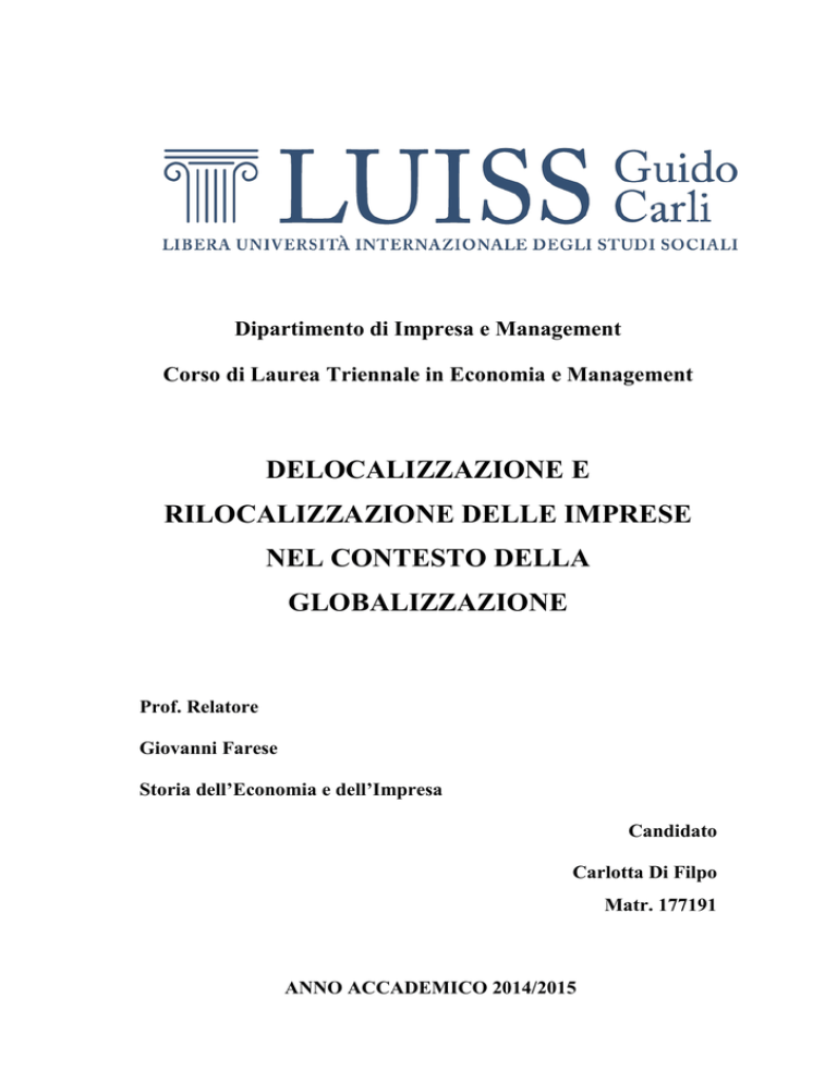Dipartimento di Impresa e Management Corso di Laurea Triennale in Economia e Management DELOCALIZZAZIONE E RILOCALIZZAZIONE DELLE IMPRESE NEL CONTESTO DELLA GLOBALIZZAZIONE Prof. Relatore Giovanni Farese Storia dell’Economia e dell’Impresa Candidato Carlotta Di Filpo Matr. 177191 ANNO ACCADEMICO 2014/2015 1 INDICE 2 INTRODUZIONE……………………………………………………….3 CAPITOLO 1: OFFSHORING………………………………………….6 1.1. Contesto generale: globalizzazione e internazionalizzazione delle imprese…………………………………………………………...7 1.2. Delocalizzazione: modalità, evoluzione storica e dimensioni del fenomeno......................................................................................12 1.3. Vantaggi, fattori ed opportunità ………………...……………...23 1.4. Svantaggi, rischi e fallimenti………………...…………………30 CAPITOLO 2: RESHORING….………………...…………………….34 2.1.Concettualizzazione e descrizione del fenomeno………...…….35 2.2.Nuovi scenari economici e sociali. Motivazioni principali della rilocalizzazione…………………………………………………......42 2.3.Paesi e settori interessati……………………………...………...53 2.4.Italia: effetto “Made In” e altri casi……………………………..63 CONCLUSIONI………………………………………………………..70 BIBLIOGRAFIA…………………………………………………...…..74 3 INTRODUZIONE 4 L’evoluzione del sistema economico e più in particolare quello delle imprese appare oggi più che mai guidato e spinto da forze diverse, se non spesso antitetiche. Questa tesi si propone di affrontare, in questo contesto complesso ed articolato, due argomenti in particolare: l’offshoring e il reshoring. Per offshoring (o delocalizzazione) si intende l'organizzazione della produzione dislocata in Regioni o Stati diversi. Per reshoring (o rilocalizzazione) si intende in sostanza il fenomeno opposto, ovvero il rientro nel Paese di origine delle attività produttive precedentemente delocalizzate all’estero. Se infatti, fino al decennio scorso, si pensava alla Cina e all’Est Europa come principali destinazioni degli impianti produttivi delle imprese, in questi ultimi anni la situazione sta decisamente cambiando ed è impossibile non fare i conti con un’evidente, seppure ancora circoscritta e incompleta, inversione di tendenza. A prescindere dal soggettivo ed individuale interesse nei confronti del tema, infatti, il dibattito a riguardo va allargandosi in parallelo insieme al fenomeno stesso sia nella stampa specializzata di tipo economico (The Economist), sia in quella di tipo generalista (La Repubblica, Il Corriere della Sera), sia in varie relazioni e report di società di consulenza e direzione. Per affrontare questi processi nel modo più chiaro possibile innanzitutto è stato fondamentale inserire i due fenomeni, diversi ma interrelati, in un contesto unico ed attuale: quello della globalizzazione. Solo partendo da qui è infatti possibile comprendere e spiegare al meglio gli eventi, le situazioni e i fattori che li hanno condotti e caratterizzati. Come appena accennato, l’offshoring e il reshoring si contrappongono ovviamente per molti aspetti, ma allo stesso tempo hanno anche svariate radici comuni e tantissimi punti di contatto. Per chiarezza espositiva è stato preferibile dedicare un capitolo a ciascun fenomeno, tuttavia è importante sottolineare che nessuno dei due esiste a sé e che per avere una visione completa ed esaustiva è necessario considerare la relazione biunivoca fra tali fenomeni che è alla base degli argomenti trattati. Il Primo Capitolo, dedicato all’ offshoring, si apre, come preannunciato, con un necessario percorso introduttivo sul contesto della globalizzazione e dell’internazionalizzazione delle imprese all’interno del quale si pongono entrambi i fenomeni. Si analizza in seguito il fenomeno delocalizzativo nel suo complesso, osservando nel particolare le sue varie forme e modalità, la sua evoluzione storica e le sue dimensioni a livello quantitativo nonché di distribuzione geografica. Vengono poi affrontanti ed illustrati tutti i vantaggi che hanno spinto le imprese ad attuare questo 5 tipo di decisione e i successi che ne sono derivati. Infine, di fondamentale importanza, si discute degli altrettanti fallimenti, rischi ed insuccessi del processo in parola. Proprio a partire da questi fallimenti si innesta infatti il fenomeno del reshoring a cui è dedicato invece il Secondo Capitolo. Quest’ultimo, partendo dalla concettualizzazione del termine, si sviluppa poi descrivendo i nuovi scenari economici e sociali all’interno del quale si afferma la rilocalizzazione e le cause e le motivazioni principali da cui è scaturita e che continuano tutt’ora a trainarla. Infine, per rendere più concreto e tangibile il discorso, la seconda parte del Capitolo si concentra sulle dimensioni del fenomeno, illustrando i Paesi e i settori maggiormente interessati e i dati e i casi empirici, prima internazionali, e poi in particolare italiani, in riferimento soprattutto al congiunto fenomeno del Made in Italy. Il lavoro vuole quindi offrire a riguardo una sintesi delle (ad oggi) ancora scarse evidenze empiriche disponibili. E nonostante l’esigua quantità di dati a riguardo e la difficoltà nel reperirli, è stato ritenuto opportuno presentare quanti più grafici, tabelle e casi di studio possibili nell’obiettivo di rendere più chiara la trattazione ma soprattutto di suscitare l’attenzione del lettore su un fenomeno nuovo e che merita il giusto interesse e la giusta considerazione. Questi dati - accompagnati dall’inquadramento teorico del fenomeno – si spera possano essere di aiuto per identificare delle possibili direttrici per future attività di ricerca sul tema. 6 CAPITOLO 1 OFFSHORI