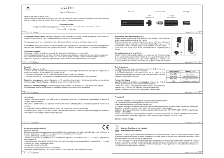 eGo-Duo Batteria Sigaretta Elettronica Base Atomizzatore Grazie per aver scelto un prodotto Ovale! Leggere attentamente le indicazioni per un uso corretto e sicuro del prodotto. Per ulteriori informazioni o domande riguardo questo prodotto ed il suo uso, si prega di rivolgersi al rivenditore Ovale più vicino, o visitare il sito www.ovaleeurope.com. Boccaglio Atomizzatore Corpo atomizzatore Contenuto del kit: 1* sigaretta elettronica completa (con batteria 850 mAh - 2 ml serbatoio Tank - atomizzatore 1.2 ohm ) 1*cavo USB - 1* Manuale eGo-Duo Italiano Accensione /Spegnimento: premere il pulsante 5 volte in rapida successione, la luce lampeggerà 5 volte indicando che eGo Duo è pronta all’ uso. Procedere nelle stesso modo per lo spegnimento. Come svapare: premere il pulsante ed inalare. Quando il pulsante viene premuto la luce si accenderà. Caricamento: collegare la batteria ad un wall-charger OVALE (da 500 mA) oppure ad una presa USB ad alta potenza del computer, attraverso il cavo USB specifico in dotazione. Quando la ricarica è completa, la luce rossa si spegnerà. Riempimento liquido: Capovolgere il tank e procedere a separarlo dal resto del prodotto (svitare in senso orario). Inserire il liquido direttamente nell’ area esterna del tank (evitando di lasciarne cadere nel foro centrale di aspirazione). Non riempire fino all’ orlo, lasciare sempre uno spazio d’ aria, quindi riavvitare il tank al resto del prodotto (in senso antiorario e in posizione capovolta). Il prodotto può essere riposizionato verticalmente e pronto all'uso. eGo-Duo Italiano Italiano eGo-Duo Sostituzione testa atomizzatore (Fig.1): Svitare la base atomizzatore dalla batteria. Capovolgere il tank, affinchè il liquido possa posizionarsi tutto al suo interno. Svitare poi la base dal corpo atomizzatore (in senso antiorario) ed estrarne l'atomizzatore per la sostituzione. Inserito l'atomizzatore nuovo, serrare nuovamente la base ed avvitare il tutto sul vano batteria (in senso orario). (Attenzione: non usare acqua. Pulire con alcohol e con un panno pulito di cotone). Controllo fuoriuscita d’ aria (Fig.2): Ruotare l’ anello sulla base atomizzatore in senso orario per diminuire l'entrata d’ aria e antiorario per aumentare l'entrata d’ aria. Aprendo entra più aria e il tiro è più morbido, chiudendo il tiro è più sofferto.Importante: la finestra d’ aria va chiusa quando non si utilizza per evitare che lo sporco entri e crei problemi. Funzioni: Protezione da corto circuito: 1. In caso di corto circuito l’ immissione di corrente elettrica si interromperà direttamente. Per riattivare il dispositivo è necessario collegarlo all'alimentatore per qualche minuto. 2. Corto circuito prima dell’ uso: la luce sul pulsante si illumina 5 volte e poi si spegne. 3. Corto circuito durante l’ uso: la luce sul pulsante si illumina 3 volte prima del corto circuito (resettare). Test di resistenza 1 . Quando la resistenza rilevata in uscita è > 5 Ohm, la spia lampeggia lentamente se si preme il pulsante. 2 . Quando la resistenza rilevata in uscita è < 0,3 Ohm, la spia lampeggia rapidamente per cinque volte, indicando bassa potenza oppure un potenziale cortocircuito. Protezione atomizzatore: premere il pulsante per 15 secondi per interrompere l’ emissione di energia: una luce bianca lampeggerà per 10 volte. Rilasciare il pulsante: la luce interromperà i lampeggi. Funzioni del display Quando la batteria è carica la luce lampeggerà lentamente o rimarrà accesa, diversamente, la luce lampeggia ad intermittenza. La luce della batteria lampeggerà durante la ricarica o quando verrà collegata con il cavo usb e si spegnerà in circa cinque secondi. Inserire e collegare il cavo usb per visualizzare il valore di carica. Protezione da basso voltaggio: quando il voltaggio della batteria è al di sotto di 3.3 V il pulsante della batteria lampeggerà per 40 volte e il dispositivo si spegnerà. Premendo il pulsante non si riaccenderà. eGo-Duo Italiano Avvertenze: Utilizzare esclusivamente il cavo USB fornito in dotazione nel kit. Altri cavi potrebbero danneggiare la batteria e causare malfunzionamenti. Utilizzare la porta USB ad alta potenza del computer. Quelle a bassa potenza non sono in grado di ricaricare la batteria. La capacità di ricarica della batteria agli ioni di litio, con il tempo, diminuisce gradualmente. Per ottimizzare la durata di vita della batteria, lasciare che il dispositivo si scarichi completamente per poi ricaricarlo con l'apposito wall-charger (evitare ricariche parziali). Livello batteria Italiano eGo-Duo Display LED Luce accesa Lampeggia lentamente Lampeggia moderatamente Lampeggia ad intermittenza Italiano eGo-Duo Precauzioni: 1.Utilizzare una batteria che sia in grado di supportare resistenze sub ohm. 2.E’ consigliabile spegnere il dispositivo quando non utilizzato. 3. Non premere il pulsante se eGo Duo non è in uso. 4. In caso di assistenza per la vostra eGo Duo, rivolgersi esclusivamente ad un centro Ovale. Non tentare di riparare il dispositivo personalmente onde evitare lesioni alla persona o danni alla sigaretta. 5.eGo Duo dev’ essere utilizzata in condizioni asciutte con temperature tra -10 ° C(14F) e 60 ° C(140F) e ricaricata tra 0°C(32F) e 45°C(113F). 6. eGo Duo è costituita da componenti Ovale originali. L’ utilizzo di componenti non originali potrebbe provocare danni o malfunzionamento, invalidando la garanzia. Usare solo il caricatore 500 mAh fornito da Ovale. Garanzia come per legge. eGo-Duo Italiano Dichiarazione di conformità Noi, Ovale Italia SRL Dichiariamo sotto la nostra esclusiva responsabilità che il prodotto sigaretta elettroncia eGo-Duo, a cui si riferisce la presente dichiarazione, è conforme alle seguenti norme e/o altri documenti normativi: - direttiva 2006/95/CE sulla “Bassa Tensione”; - direttiva 2004/108/CE recepita in Italia con decreto legislativo 6 novembre 2007, n. 193 sulla “Compatibilità Elettromagnetica”; - direttive Europee 2002/9