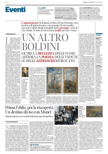 la Repubblica SABATO 31 GENNAIO 2015 49 Le Mostre DI REPUBBLICA CONTATTI [email protected] WWW.REPUBBLICA.IT LE DONNE La dame de Biarritz (particolare, 1912). Sotto, Sulla panchina al Bois (1872) Ai Musei San Domenico di Forlì da domani la rassegna dedicata al maestro a cavallo tra Ottocento e Novecento LA RISCOPERTA DELL’ARTISTA SIGNORE DEL RITRATTO FABRIZIO D’AMICO IOVANNI Boldini, nato a Ferrara nel 1842, è uno dei casi della pittura italiana dell’Ottocento che la critica non ha saputo decifrare fino in fondo. Celebre e richiestissimo in Europa e in America nei lunghi anni che vanno dalla fine del nono decennio del XIX secolo fino almeno a quelli della prima guerra mondiale, la sua fortuna mercantile s’è in seguito incrinata, e con essa la frequenza degli studi sulla sua opera. Fintanto che, negli ultimi decenni in particolare, l’una e gli altri hanno risollevato la testa, riportando in auge il pittore e facendolo oggetto di molte mostre di qualità. Adesso, a cura di Francesca Dini e Fernando Mazzocca, i Musei San Domenico di Forlì tornano a rivisitarne la figura con una mostra vastissima (da domani al 14 giugno), che si avvale di molti inediti (fra i quali alcuni dipinti murali del ciclo immaginato dal giovane Boldini per la villa pistoiese della Falconiera), oltre che dei suoi più celebrati capolavori, messi a confronto con opere di altri artisti italiani attivi per un periodo della loro vita a Parigi, dove invece Boldini scelse — quando non aveva ancora trent’anni — di trasferirsi definitivamente. Lasciò allora Firenze — dove s’era stabilito, ma che gli sembrò poi sempre troppo piccola per le sue ambizioni — e quei luoghi dove s’era educato e aveva stretto le prime solidarietà con i pittori “della macchia”. Sono della seconda metà degli anni Sessanta del secolo i suoi primi risultati maturi, prevalentemente tesi a ripensare il modo del ritratto del suo tempo, con esiti notevoli (qui esposti alcuni ben noti dipinti, quali il RitrattodiDiego Martelli, di Cristiano e di Leonetto Banti, assieme ad altri inediti: ad acclarare un tempo del lavoro di Boldini su cui la mostra odierna si sofferma a lungo, proficuamente). Poi la smania di far classico e insieme elegante, ripetendo i modi di Boucher, e Fragonard, che fa capo al vasto movimento del “settecentismo” (smania fatta propria, fra i molti altri, da Meissonier e sulla sua scia da Mariano Fortuny padre) prende anche Boldini che, dopo aver brevemente visitato Parigi nel ‘67 in occasione dell’Esposizione Universale, vi ha fissato la sua stabile dimora nel ‘71. G >SEGUE NELLA PAGINA SUCCESSIVA Boldini Il pittore che svelò il grande spettacolo della modernità 50 la Repubblica SABATO 31 GENNAIO 2015 LE MOSTRE DI REPUBBLICA Giovanni Boldini Nella capitale europea seppe interpretare l’aria del tempo e maturare il distacco dal mondo dei macchiaioli in cui si era formato da giovane L’italiano a Parigi che cantò la Belle Epoque LA MOSTRA <SEGUE DALLA PAGINA PRECEDENTE FABRIZIO D’AMICO Boldini, lo spettacolo della modernità ai Musei San Domenico di Forlì (1°febbraio14 giugno) a cura di Fernando Mazzocca e Francesca Dini Organizzata dalla Fondazione Cassa dei Risparmi di Forlì Direttore organizzazione Gianfranco Brunelli Allestimento di Lucchi e Wilmotte Catalogo Silvana Editoriale Orari: da martedì a venerdì: 9.30-19; sabato, domenica, giorni festivi: 9.30-20 Lunedì chiuso Biglietti: intero 11 euro; ridotto 9 Informazioni e prenotazioni: tel. 199.15.11.34 Riservato gruppi e scuole tel. 0543.36217 VENGONO allora, in lunga teoria, raffigurazioni di interni borghesi punteggiati da minute figurette, animate e coloratissime, e da minimi racconti fatti quasi soltanto di sorrisi, di grazie ed inchini. O piccoli quadri di gremite piazze parigine, di carrozze, di squarci della Senna, persino di paesaggi che per un attimo sembrano condividere almeno i temi della nouvelle peinture impressionista (a Forlì, ad esempio, La grande rue à Combes-la-Ville, del 1873). D’altronde Boldini ricorderà e farà tesoro, nei suoi primi anni parigini, di quel suo talento d’afferrare, di ghermire quasi, le cose. E lo fa attraverso quella “freschezza del colorito” che fu sua dote riconosciuta dai più in occasione della prima, fortunata uscita pubblica (a Firenze, nel 1866). Una facilità di mano, peraltro, guardata fin d’allora con un filo di sospetto da Telemaco Signorini («per l’appunto questa freschezza è la qualità che meno apprezziamo in quest’artista. Mentre la fattura larga e facile ci piace, il colore continuamente bello e lucido ci stanca», scrisse allora il Signorini — autorevolmente, e con una sorta di preveggenza di quanto sarebbe venuto in seguito, in quello che resta comunque un avvio prestigioso della vastissima bibliografia di Boldini). Era, quello nel quale si stabilì a Parigi, un tempo in cui, tramontata con la Comune e con l’esito infausto della guerra francoprussiana la stella del Courbet più aspro e intransigente, il gusto del pubblico s’orientava — complici le giurie tradizionaliste dei Salon annuali — su valori lontani da ogni radicalismo, e per lo più dettati ancora dallo storicismo e dall’esotismo che avevano caratterizzato il modo della pittura francese nei decenni precedenti, ma in cerca di sempre più raffinate eleganze e di iperbolici virtuosismi del pennello. Boldini, in quel suo primo periodo parigino, pone ascolto con intelligenza all’aria del tempo, e non fa fatica ad adeguarvisi. D’altra parte, proprio per le sue radici nella presunta cernita di “verità” propria della voga settecentista, «anche i più convinti assertori del realismo pittorico, come il criti- E I DIPINTI Da sinistra in senso orario, Ritratto di Miss Bell; Madame Charles Max; Marthe Regnier; Scène de fête au Moulin Rouge; Conversazione al caffè; La contessa de Rasty sul divano co Diego Martelli, finivano con il tollerare queste fughe nel passato di Boldini», scrive 