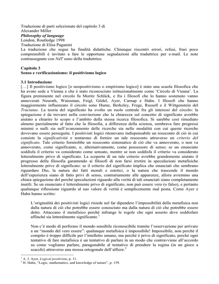 Traduzione di parti selezionate del capitolo 3 di Alexander Miller Philosophy of language London, Routledge 1998 Traduzione di Elisa Paganini La traduzione che segue ha finalità didattiche. Chiunque riscontri errori, refusi, frasi poco comprensibili è invitato a fare le opportune segnalazioni alla traduttrice per e-mail. Le note contrassegnate con NdT sono della traduttrice. Capitolo 3 Senso e verificazionismo: il positivismo logico 3.1 Introduzione […] Il positivismo logico [o neopositivismo o empirismo logico] è stato una scuola filosofica che ha avuto sede a Vienna e che è stato riconosciuto istituzionalmente come ‘Circolo di Vienna’. La figura preminente nel circolo fu Moritz Schlick, e fra i filosofi che lo hanno sostenuto vanno annoverati Neurath, Waissman, Feigl, Gödel, Ayer, Carnap e Hahn. I filosofi che hanno maggiormente influenzato il circolo sono Hume, Berkeley, Frege, Russell e il Wittgenstein del Tractatus. La teoria del significato ha svolto un ruolo centrale fra gli interessi del circolo: la spiegazione è da trovarsi nella convinzione che la chiarezza sul concetto di significato avrebbe aiutato a chiarire lo scopo e l’ambito della stessa ricerca filosofica. Si sarebbe così rimediato almeno parzialmente al fatto che la filosofia, a differenza della scienza, sembrava fare progressi minimi o nulli sia nell’avanzamento delle ricerche sia nelle modalità con cui queste ricerche dovevano essere perseguite. I positivisti logici ritenevano indispensabile un resoconto di ciò in cui consiste la significatività e tentarono di fornire un tale resoconto attraverso un criterio del significato. Tale criterio fornirebbe un resoconto sistematico di ciò che va annoverato, o non va annoverato, come significante, o, alternativamente, come possessore di senso; se un enunciato soddisfa il criterio va considerato come sensato, mentre se non soddisfa il criterio va considerato letteralmente privo di significato. La scoperta di un tale criterio avrebbe grandemente aiutato il progresso della filosofia garantendo ai filosofi di non farsi irretire in speculazioni metafisiche letteralmente prive di significato: se il criterio del significato implica che enunciati che sembrano riguardare Dio, la natura dei fatti morali e estetici, o la natura che trascende il mondo dell’esperienza siano di fatto privi di senso, contrariamente alle apparenze, allora avremmo una chiara spiegazione del perché speculazioni riguardo alla verità di tali enunciati siano completamente inutili. Se un enunciato è letteralmente privo di significato, non può essere vero (o falso), e pertanto qualunque riflessione riguardo al suo valore di verità è semplicemente mal posta. Come Ayer e Hahn hanno scritto: L’originalità dei positivisti logici risiede nel far dipendere l’impossibilità della metafisica non dalla natura di ciò che potrebbe essere conosciuto ma dalla natura di ciò che potrebbe essere detto. Attaccano il metafisico perché infrange le regole che ogni asserto deve soddisfare affinché sia letteralmente significante.1 Non c’è modo di perforare il mondo sensibile riconoscibile tramite l’osservazione per arrivare a un “mondo del vero essere”: qualunque metafisica è impossibile! Impossibile, non perché il compito è troppo difficile per l’intelletto umano, ma perché è privo di significato, perché ogni tentativo di fare metafisica è un tentativo di parlare in un modo che contravviene all’accordo su come vogliamo parlare, paragonabile al tentativo di prendere la regina (in un gioco a scacchi) attraverso una mossa ortogonale dell’alfiere.2 1 2 A. J. Ayer, Logical positivism, p. 11. H. Hahn, “Logic, mathematics, and knowledge of nature”, p. 159. 2 In base al criterio suggerito dai positivisti logici, ci sono solo due modi in cui un enunciato può essere letteralmente significante: esprimendo un pensiero a posteriori, un pensiero che è empiricamente verificabile, o esprimendo un pensiero a priori, un pensiero che è vero semplicemente in virtù di fatti a proposito del significato (o senso). Il primo tipo di asserto è analizzato dai positivisti nei termini del principio di verificazione, che si propone di spiegare chiaramente quali condizioni un asserto deve soddisfare per qualificarsi come letteralmente significante o sensato in virtù della suscettibilità alla verifica empirica.3 Il secondo tipo di asserto è analizzato nei termini di verità a priori: le verità a priori sono analitiche nel senso che sono vere semplicemente in virtù del loro significato (o senso). Nelle sezioni 3.2 e 3.3 considereremo il tentativo di Ayer di rendere esplicito il principio di verificazione in Linguaggio, verità e logica, il suo testo classico che si proponeva di divulgare la dottrina del positivismo logico; nella sezione 3.4 indagheremo il resoconto positivista dell’a priori, attraverso una discussione del capitolo 4 di quel lavoro, e vedremo come Ayer cerca di trovare uno spazio per la stessa filosofia in quanto attività a priori. La dicotomia fra asserti significanti in virtù del fatto che sono empiricamente verificabili, e asserti che sono veri semplicemente in virtù del loro significato viene ulteriormente sviluppata dalla famosa distinzione di Rudolf Carnap fra domande interne e esterne: questa distinzione è l’oggetto della sezione 3.5. Nella sezione 3.6 considereremo brevemente l’impatto della teoria del significato proposta dal positivismo logico sul linguaggio etico. Alla fine, nella sezione 3.7, consideriamo alcuni ulteriori aspetti della concezione di Ayer sugli asserti empiricamente verificabili: questo pone le basi per l’attacco di Quine alla teoria del significato proposta dal positivismo logico che è l’argomento del nostro prossimo capitolo. 3.2 La formulazione del principio di verificazione Il principio di verificazione può essere riassunto dal famoso slogan di Schlick “Il significato di un asserto consiste nel metodo della sua verifica”. Gli ass
