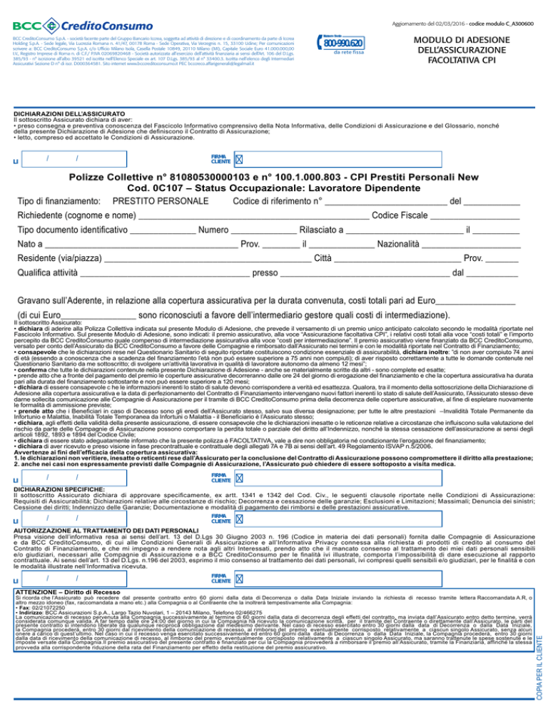 Aggiornamento del 02/03/2016 - codice modulo C_A300600 BCC CreditoConsumo S.p.A. - società facente parte del Gruppo Bancario Iccrea, soggetta ad attività di direzione e di coordinamento da parte di Iccrea Holding S.p.A. - Sede legale, Via Lucrezia Romana n. 41/47, 00178 Roma - Sede Operativa, Via Verzegnis n. 15, 33100 Udine; Per comunicazioni scrivere a: BCC CreditoConsumo S.p.A. c/o Ufficio Milano Isola, Casella Postale 10849, 20110 Milano (MI), Capitale Sociale Euro 41.000.000,00 I.V., Registro Imprese di Roma n. di C.F./ P.IVA 02069820468 - Società autorizzata all’esercizio dell’attività finanziaria ai sensi dell’Art. 106 del D.Lgs. 385/93 - n° iscrizione all’albo 39521 ed iscritta nell’Elenco Speciale ex art. 107 D.Lgs. 385/93 al n° 33400.3. Iscritta nell’elenco degli Intermediari Assicurativi Sezione D n° di iscr. D000364581. Sito internet www.bcccreditoconsumo.it PEC [email protected] 800-990.620 da rete fissa MODULO DI ADESIONE DELL’ASSICURAZIONE FACOLTATIVA CPI DICHIARAZIONI DELL’ASSICURATO Il sottoscritto Assicurato dichiara di aver: • preso consegna e preventiva conoscenza del Fascicolo Informativo comprensivo della Nota Informativa, delle Condizioni di Assicurazione e del Glossario, nonché della presente Dichiarazione di Adesione che definiscono il Contratto di Assicurazione; • letto, compreso ed accettato le Condizioni di Assicurazione. LI / / FIRMA CLIENTE Polizze Collettive n° 81080530000103 e n° 100.1.000.803 - CPI Prestiti Personali New Cod. 0C107 – Status Occupazionale: Lavoratore Dipendente Tipo di finanziamento: PRESTITO PERSONALE Codice di riferimento n° __________________________ del ____________ Richiedente (cognome e nome) _________________________________________________ Codice Fiscale ___________________ Tipo documento identificativo ______________ Numero ______________ Rilasciato a _________________________ il __________ Nato a _________________________________________ Prov. ________ il ______________ Nazionalità _____________________ Residente (via/piazza) ____________________________________________ Città ___________________________ Prov. _______ Qualifica attività ____________________________________ presso ____________________________________ dal ___________ Gravano sull’Aderente, in relazione alla copertura assicurativa per la durata convenuta, costi totali pari ad Euro_________________ (di cui Euro________________ sono riconosciuti a favore dell’intermediario gestore quali costi di intermediazione). Il sottoscritto Assicurato: • dichiara di aderire alla Polizza Collettiva indicata sul presente Modulo di Adesione, che prevede il versamento di un premio unico anticipato calcolato secondo le modalità riportate nel Fascicolo Informativo. Sul presente Modulo di Adesione, sono indicati: il premio assicurativo, alla voce “Assicurazione facoltativa CPI”, i relativi costi totali alla voce “costi totali” e l’importo percepito da BCC CreditoConsumo quale compenso di intermediazione assicurativa alla voce “costi per intermediazione”. Il premio assicurativo viene finanziato da BCC CreditoConsumo, versato per conto dell’Assicurato da BCC CreditoConsumo a favore delle Compagnie e rimborsato dall’Assicurato nei termini e con le modalità riportate nel Contratto di Finanziamento; • consapevole che le dichiarazioni rese nel Questionario Sanitario di seguito riportate costituiscono condizione essenziale di assicurabilità, dichiara inoltre: ”di non aver compiuto 74 anni di età (essendo a conoscenza che a scadenza del finanziamento l’età non può essere superiore a 75 anni non compiuti); di aver risposto correttamente a tutte le domande contenute nel Questionario Sanitario da me sottoscritto; di svolgere un’attività lavorativa in qualità di lavoratore autonomo da almeno 12 mesi”; • conferma che tutte le dichiarazioni contenute nella presente Dichiarazione di Adesione - anche se materialmente scritte da altri - sono complete ed esatte; • prende atto che a fronte del pagamento del premio le coperture assicurative decorreranno dalle ore 24 del giorno di erogazione del finanziamento e che la copertura assicurativa ha durata pari alla durata del finanziamento sottostante e non può essere superiore a 120 mesi; • dichiara di essere consapevole c he le informazioni inerenti lo stato di salute devono corrispondere a verità ed esattezza. Qualora, tra il momento della sottoscrizione della Dichiarazione di Adesione alla copertura assicurativa e la data di perfezionamento del Contratto di Finanziamento intervengano nuovi fattori inerenti lo stato di salute dell’Assicurato, l’Assicurato stesso deve darne sollecita comunicazione alle Compagnie di Assicurazione per il tramite di BCC CreditoConsumo prima della decorrenza delle coperture assicurative, al fine di espletare nuovamente le formalità di ammissione previste; • prende atto che i Beneficiari in caso di Decesso sono gli eredi dell’Assicurato stesso, salvo sua diversa designazione; per tutte le altre prestazioni –Invalidità Totale Permanente da Infortunio e Malattia, Inabilità Totale Temporanea da Infortuni o Malattia - il Beneficiario è l’Assicurato stesso; • dichiara, agli effetti della validità della presente assicurazione, di essere consapevole che le dichiarazioni inesatte o le reticenze relative a circostanze che influiscono sulla valutazione del rischio da parte delle Compagnie di Assicurazione possono comportare la perdita totale o parziale del diritto all’Indennizzo, nonché la stessa cessazione dell’assicurazione ai sensi degli articoli 1892, 1893 e 1894 del Codice Civile; • dichiara di essere stato adeguatamente informato che la presente polizza è FACOLTATIVA, vale a dire non obbligatoria né condizionante l’erogazione del finanziamento; • dichiara di aver ricevuto e preso visione in fase precontrattuale e contrattuale degli allegati 7A e 7B ai sensi dell’art. 49 Regolamento ISVAP n.5/2006. Avvertenze ai fini de