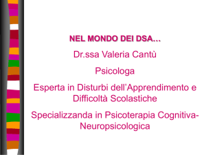 D.S.A. aspetti clinici, cognitivi e psicologici. Diagnosi precoce e rieducazione. Dr.ssa Marcella Mauro www.sosdislessia.it La Dislessia in Italia e in Europa -L’incidenza del DSA sulla popolazione varia in base alla lingua e alla cultura. 3,6% Italia – 7,3% America (Lingdren, De Renzi e Richman 1985) -British Dyslexia Association : 4% gravemente dislessici + 6% dislessia moderata o lieve - AID : 1.500.000 persone 4%- 6% Italia Incidenza è generalmente uguale ma lingua e cultura diversi hanno effetti sul peso statistico. INIZIATIVE -1996/97 Svezia: sensibilizzazione nelle biblioteche per accesso persone dislessiche ( libro IFLA 2001- International Federation of Library Association and Istitutions) -1990 USA: normativa sulle disabilità « American with Disabilities Act» garantisce pari opportunità di occupazione e protegge i lavoratori con queste caratteristiche da discriminazioni sul luogo del lavoro. Altra normativa americana « Individuals with Disabilities Education» richiede alle scuole di eseguire gratuitamente la valutazione e gli eventuali interventi -1994 Inghilterra: Ministro dell’Istruzione Inglese pubblica una guida per il trattamento e la valutazione delle esigenze particolari, compresa la dislessia -1991 Germania : emana un Decreto-Circolare per il sostegno degli alunni con difficoltà di lettura, scrittura e calcolo ( vd RdErl.d.Kultursministerium v.19.7.1991) -1997 EDA ( associazione Europea Dislessia) a Copenhaghen incoraggiano le biblioteche a usare strumenti idonei per permettere l’accesso a tutti anche ai dislessici - 2004-2005 Italia Circolari Ministeriali - 2010 Italia: legge Le difficoltà scolastiche interessano il 13% dei soggetti in età di scuola primaria; il 24% dei soggetti nella scuola media La Dislessia in ITALIA • • • • • • Stime epidemiologiche 1.500.000 dislessici in Italia 3,7% della popolazione scolastica ¾ sono maschi Il 70% dei casi ha base ereditaria > 50% l’abbandono scolastico dopo la scuola dell’obbligo 58% dei casi interessati nella scuola media ha maggiori problematiche di tipo affettivo/relazionale Difficoltà scolastiche Le ipotesi da considerare sono : - Ritardo mentale - Importante Disturbo Emotivo - Deficit neurologici e/o sensoriali - Disturbo Specifico d’Apprendimento Difficoltà scolastiche 10/20% popolazione scolastica -Deficit intellettivi di minima entità -Disturbi comportamentali e della condotta -Disagio scolastico da cause socio-familiari, Psicologiche -Disturbi d’ansia DISLESSIA La nosografia ufficiale (ICD-10/OMS E DSM-IV) indica alcuni criteri condivisi a livello internazionale Disturbo che si manifesta nella difficoltà di apprendere la lettura e la scrittura in ASSENZA DI: deficit intellettivi deficit neurologici deficit sensoriali IN PRESENZA DI: Normali opportunità scolastiche Favorevole ambiente socioculturale Disturbo Specifico d’Apprendimento: Dislessia Disortografia Disgrafia Disturbo di comprensione del testo Discalculia Disprassia Disturbo dell’attenzione con iperattività La Dislessia Evolutiva (ICD 10 dell’OMS) classificazione internazionale delle malattie e dei problemi correlati, stilata dall'Organizzazione mondiale della sanità La principale caratteristica di questo disturbo è una specifica e significativa compromissione dello sviluppo della capacità di lettura, che non è solamente spiegata dall’età mentale, da problemi di acutezza visiva o inadeguata istruzione scolastica La Dislessia Evolutiva (International Dyslexia Association 2003) E’ una disabilità specifica dell’apprendimento di origine neurobiologica. Essa è caratterizzata dalla difficoltà di effettuare una lettura accurata e/o fluente e da abilità scadenti nella scrittura e nella decodifica. Queste difficoltà tipicamente derivano da un deficit nella componente fonologica del linguaggio, che è spesso inattesa in rapporto alle altre abilità cognitive e alla garanzia di un’adeguata istruzione scolastica. Conseguenze secondarie possono includere problemi di comprensione nella lettura e una ridotta pratica della lettura, che può impedire la crescita del vocabolario e della conoscenza generale Colpa dei geni ? Una cosa è certa : dislessici si nasce non si diventa recenti studi….. • Aspetti genetici: Ereditabilità : ranges compreso tra 30-70% Varianti genetiche che influenzano la dislessia: studi di Linkage hanno mappato il potenziale rischio relativo ad alcuni loci di diversi cromosomi tra i quali il 2 - 3 – 6 – 15 – 18. Il gene DYXC1C1 è candidato per la dislessia (dipartimento di Pediatria Neurologica Ospedale per Bambini e Adolescenti- Università di Helsinki, 2003) Diverso rapporto maschi/femmine • Aspetti neurofisiologici : Studi compiuti su EEG (ha un aspetto del tutto caratteristico e diverso) • Neuroimmagini 1) Planum temporali simmetrici o con asimmetria invertita, dx più esteso del sx, (Hynd e coll. 1991). 2) Maggior asimmetria nei lobi parietali (Robichon et al. 2000). 3) Riduzione della sostanza grigia del lobo temporale (Eliez, 2000). 1) la Dislessia non è una malattia 2) il Disturbo è di natura neurobiologica, costituisce una caratteristica individuale del soggetto pertanto non lo abbandonerà mai, ma migliorerà nel tempo. Le conseguenze funzionali si modificano attraverso adeguate misure educative e riabilitative Spesso i problemi si manifestano già dalla prima elementare, ma in altri casi si evidenziano più tardivamente. Sono spesso associati a difficoltà comportamentali e a disturbo relazionale. Spesso le difficoltà si presentano “a grappolo” e in comorbidità. Vi è spesso incostanza dell’errore e grande sensibilità al contesto in cui viene svolto il compito. Consensus Conference 2007 ENTE PROMOTORE: Associazione Italiana Dislessia (AID) COMITATO PROMOTORE (AID) SOCIETÀ SCIENTIFICHE E ASSOCIAZIONI partecipanti alla sessione scientifica della Consensus Conference (Montecatini Terme): − Associazione italiana pediatri (ACP) − Associazione federativ