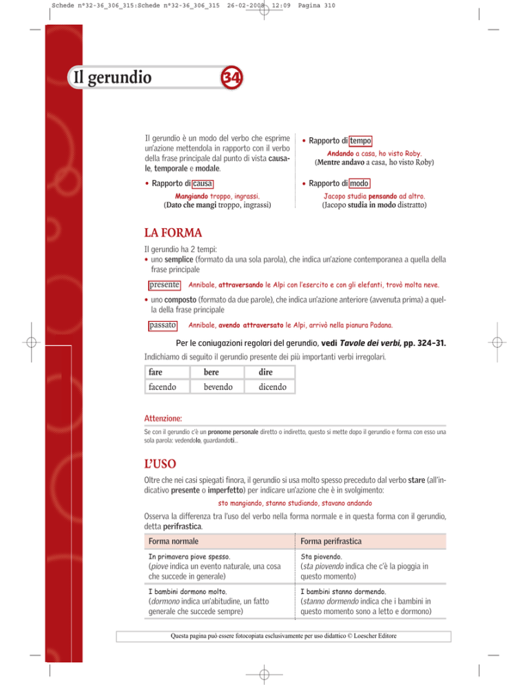Schede n°32-36_306_315:Schede n°32-36_306_315 Il gerundio 26-02-2008 12:09 Pagina 310 34 ??? Il gerundio è un modo del verbo che esprime un’azione mettendola in rapporto con il verbo della frase principale dal punto di vista causale, temporale e modale. • Rapporto di tempo • Rapporto di causa • Rapporto di modo Andando a casa, ho visto Roby. (Mentre andavo a casa, ho visto Roby) Mangiando troppo, ingrassi. Jacopo studia pensando ad altro. (Dato che mangi troppo, ingrassi) (Jacopo studia in modo distratto) LA FORMA Il gerundio ha 2 tempi: • uno semplice (formato da una sola parola), che indica un’azione contemporanea a quella della frase principale presente Annibale, attraversando le Alpi con l’esercito e con gli elefanti, trovò molta neve. • uno composto (formato da due parole), che indica un’azione anteriore (avvenuta prima) a quella della frase principale passato 310 Annibale, avendo attraversato le Alpi, arrivò nella pianura Padana. L’italiano per studiare Per le coniugazioni regolari del gerundio, vedi Tavole dei verbi, pp. 324-31. Indichiamo di seguito il gerundio presente dei più importanti verbi irregolari. fare bere dire facendo bevendo dicendo Attenzione: Se con il gerundio c’è un pronome personale diretto o indiretto, questo si mette dopo il gerundio e forma con esso una sola parola: vedendolo, guardandoti… L’USO Oltre che nei casi spiegati finora, il gerundio si usa molto spesso preceduto dal verbo stare (all’indicativo presente o imperfetto) per indicare un’azione che è in svolgimento: sto mangiando, stanno studiando, stavano andando Osserva la differenza tra l’uso del verbo nella forma normale e in questa forma con il gerundio, detta perifrastica. Forma normale Forma perifrastica In primavera piove spesso. Sta piovendo. (piove indica un evento naturale, una cosa che succede in generale) (sta piovendo indica che c’è la pioggia in questo momento) I bambini dormono molto. I bambini stanno dormendo. (dormono indica un’abitudine, un fatto generale che succede sempre) (stanno dormendo indica che i bambini in questo momento sono a letto e dormono) Questa pagina può essere fotocopiata esclusivamente per uso didattico © Loescher Editore Schede n°32-36_306_315:Schede n°32-36_306_315 26-02-2008 12:09 Pagina 311 Grammatica 01 • Trasforma al gerundio presente le espressioni in neretto delle seguenti frasi. 34 5. Dato che ha visto che c’era poca gente, Andrea si è offeso ed è andato via. .................................................. 1. Dato che pago con la carta di credito, tengo pochi soldi nel portafoglio. .................................................. 03 • Completa le seguenti frasi unendo al gerundio il pronome personale adatto. 2. Mentre scendeva le scale, Paola è scivolata 1. Vedendo. . . ho capito che Francesca e si è fatta male. e Sandra sono molto amiche. .................................................. 3. La poveretta è stata investita dalla macchina, mentre attraversava la strada sulle strisce pedonali. 2. Questi esercizi diventano più chiari rifacendo. . . . 3. Le mie magliette sono diventate troppo strette lavando. . . . .................................................. 4. Mentre pensava a lei, Peter era felice. .................................................. 5. Quando mi lavo i capelli, mi accorgo che ne perdo molti. 4. Questa merendina sembrava buona, ma mangiando . . . ho sentito un gusto cattivo. 5. Leggendo . . . ho visto che questo libro è abbastanza interessante. 311 02 • Trasforma al gerundio passato le espressioni in neretto delle seguenti frasi. 1. Il nostro esercito ha vinto la battaglia, dopo aver combattuto a lungo. .................................................. 2. Quando ho sentito come stavano le cose, ho preferito andarmene. 04 • Completa le seguenti frasi usando il gerundio nella forma perifrastica dei verbi indicati tra parentesi. 1. Fatima . . .sta . . . preparando . . . . . . . . . . . . . (preparare) il cous-cous. 2. Alla radio . . . . . . . . . . . . . . . . . . . (trasmettere) il Festival di Sanremo. 3. In questo momento . . . . . . . . . . . . . . . . . . . (tuonare) e . . . . . . . . . . . . . . . . (piovere) a dirotto. .................................................. 3. Dato che ha fatto molti straordinari, mio padre questo mese ha guadagnato più 4. Mentre io . . . . . . . . . . . . . . . . . . . (fare) colazione, è arrivata mia sorella piangendo. 5. Questo film . . . . . . . . . . . . . . . . . . . (avere) del solito. .................................................. molto successo. .................................................. 6. Che cosa . . . . . . . . . . . . . . . . . . . (fare) Ahmed 4. Dopo aver pagato tutti i debiti, loro quando l’hai incontrato? si sentono più tranquilli. 7. A chi . . . . . . . . . . . . . . . . . . . . (telefonare) Carlo? .................................................. 8. Il Presidente della Repubblica .................................................. . . . . . . . . . . . . . . . . . (parlare) ............ in televisione. Questa pagina può essere fotocopiata esclusivamente per uso didattico © Loescher Editore L’italiano per studiare ..................................................