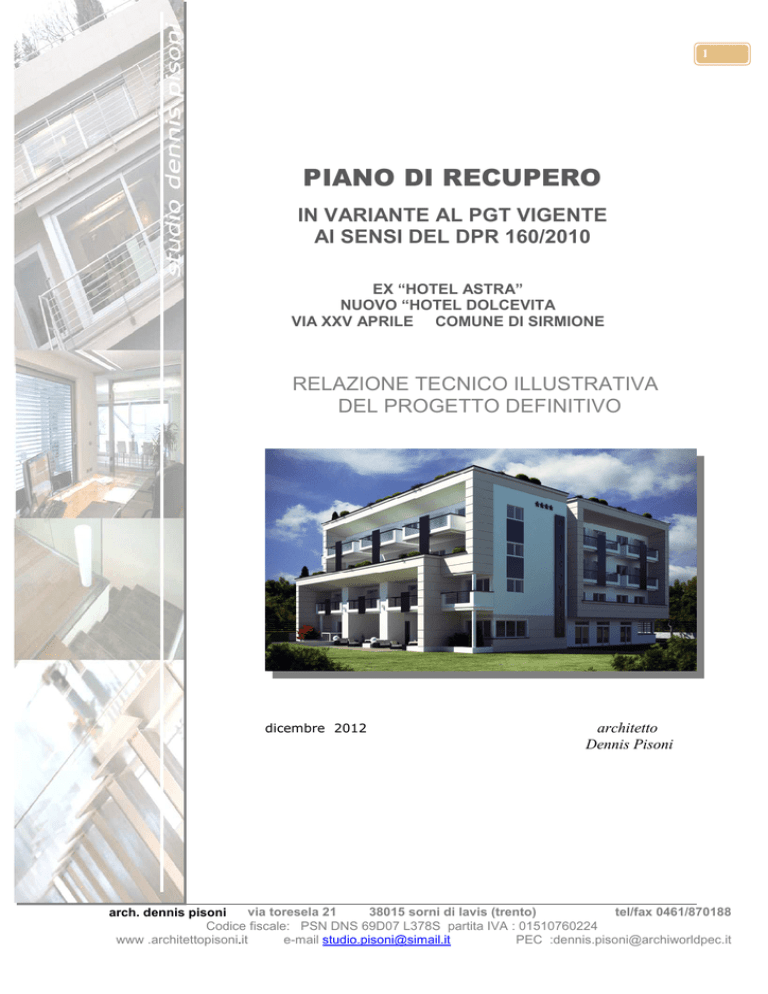 1 PIANO DI RECUPERO IN VARIANTE AL PGT VIGENTE AI SENSI DEL DPR 160/2010 EX “HOTEL ASTRA” NUOVO “HOTEL DOLCEVITA VIA XXV APRILE COMUNE DI SIRMIONE RELAZIONE TECNICO ILLUSTRATIVA DEL PROGETTO DEFINITIVO dicembre 2012 architetto Dennis Pisoni via toresela 21 38015 sorni di lavis (trento) tel/fax 0461/870188 arch. dennis pisoni Codice fiscale: PSN DNS 69D07 L378S partita IVA : 01510760224 www .architettopisoni.it e-mail [email protected] PEC :[email protected] 2 • PREMESSA La proposta progettuale prevede la demolizione e successiva ricostruzione del complesso alberghiero attualmente denominato “ Hotel Astra ***” sito in Sirmione in via XXV aprile e definito catastalmente con la p.ed 94 del c.c. di Sirmione. vista aerea della penisola di Sirmione con evidenziato il sito dell’ attuale Hotel Astra via toresela 21 38015 sorni di lavis (trento) tel/fax 0461/870188 arch. dennis pisoni Codice fiscale: PSN DNS 69D07 L378S partita IVA : 01510760224 www .architettopisoni.it e-mail [email protected] PEC :[email protected] 3 La scelta di demolire la struttura esistente per poterla ricostruire nasce dalla volontà/necessità di erigere un edificio che possa inserirsi in modo positivo nell’ambiente, sia da un punto di vista di impatto ambientale, sia da un punto di vista economico, cercando una dimensione che consenta una corretta impostazione di marketing. La nuova struttura (per la quale verrà specificata in maniera più esaustiva ogni caratteristica funzionale nei capitoli seguenti), sarà dotata di un piano interrato che ospiterà tutti i locali e le funzioni di servizio all’attività ricettiva, mentre i piani superiori saranno interamente dedicati alle sale soggiorno e spazi somministrazione a piano terra mentre i livelli superiori saranno destinati esclusivamente a stanze per ospiti. I livelli fuori terra saranno realizzati completamente in legno (con sistema costruttivo X-lam). La ricerca della dimensione ottimale ( che prevede un numero di stanze necessariamente vicino a 50) comporta la necessità di prevedere un ampliamento della struttura esistente, nonostante questo risulti in contrasto con la vigente normativa di piano. Viene a tal proposito richiesta una deroga all’indice edilizio pari a circa 650 mq di superficie utile di piano con la creazione di un terzo piano destinato a stanze. Tale ampliamento di superficie corrisponde in realtà ad un minimo intervento volumetrico in quanto il terzo piano seppur non abitabile in quanto privo di altezze sufficienti è già esistente: si tratta quindi di recuperarne la volumetria necessaria per renderlo fruibile. Da un punto di vista della scelta dei materiali, quindi la nuova struttura alberghiera verrà realizzata in bio-edilizia ad alta prestazione energetica consentendo un altissimo comfort all’utente e permettendo un fortissimo risparmio d’esercizio con conseguente ricaduta positiva su tutto il territorio. Nonostante il progetto presentato riporti la soluzione di riscaldamento tramite caldaie a metano integrate da pannelli solari e pannelli fotovoltaici (circa 12 Kw di fotovoltaico e …….. di solare termico ) è in fase di studio la ricerca di sitemi d’utilizzo di energia alternativa quali geotermia e/o pompe di calore. L’eventuale loro scelta, basata su studi di fattibilità e analisi economiche preventive, ma molto auspicata sia da parte progettuale che dalla committenza, porterebbe la struttura ad essere vicina ad una realizzazione edilizia ad “impatto zero” . via toresela 21 38015 sorni di lavis (trento) tel/fax 0461/870188 arch. dennis pisoni Codice fiscale: PSN DNS 69D07 L378S partita IVA : 01510760224 www .architettopisoni.it e-mail [email protected] PEC :[email protected] 4 • DESCRIZIONE DEL SITO E DELLO STATO DI FATTO l’Hotel Astra è una struttura alberghiera atre stelle che si sviluppa su tre livelli fuori terra e che ha terminato la sua stagione ricettiva nella stagione estiva 2012. L’edificio si trova adiacente al grande parcheggio di attestamento al centro storico di Sirmione e, affacciandosi sul Lago di Garda, gode di una pertinenza esclusiva a diretto contatto con l’area balneabile. Vista dell’albergo Astra fronte Lago con spazio pertinenziale di proprietà confinante con la spiaggia demaniale. Il fabbricato risale agli anni 70 e allo stato attuale dei fatti rivela in maniera molto evidente il sistema costriuttivo con struttura portante puntiforme in cemento armato. L’involucro è quindi privo di qualsiasi accorgimento per risolvere i ponti termici e ottimizzare il risparmio energetico. Anche gli impianti risultano essere non idonei alle esigenze sia funzionali sia normative di una nuova struttura alberghiera. Si riportano di seguito alcune fotografie dell’interno in cui risulta evidente lo stato di avnzato degrado della struttura esistente e la necessità di un profondo intervento di ristrutturazione ed adeguamento alle normative vigenti. via toresela 21 38015 sorni di lavis (trento) tel/fax 0461/870188 arch. dennis pisoni Codice fiscale: PSN DNS 69D07 L378S partita IVA : 01510760224 www .architettopisoni.it e-mail [email protected] PEC :[email protected] 5 vista della sala soggiorno in cui risulta evidente la mancanza di sistema di ricambio aria e/o condizionamento (vedi pale per movimentazione aria ) Evidenti effetti della condensa dovuta ai ponti termici della struttura puntiformi travi-pilastri Vista del corridoio interno di distribuzione alle stanze. via toresela 21 38015 sorni di lavis (trento) tel/fax 0461/870188 arch. dennis pisoni Codice fiscale: PSN DNS 69D07 L378S partita IVA : 01510760224 www .architettopisoni.it e-mail [email protected] PEC :[email protected] 6 Vista interna di una stanza tipo con rispettivo bagno via toresela 21 38015 sorni di lavis (trento) tel/fax 0461/870188 arch. dennis pisoni Codice fiscale: PSN DNS 69D07 L378S partita IVA : 01510760224 www .architettopisoni.it e-mail [email protected] PEC :[email protected] 7 • LINEE GUIDA DEL PROGETTO In prima