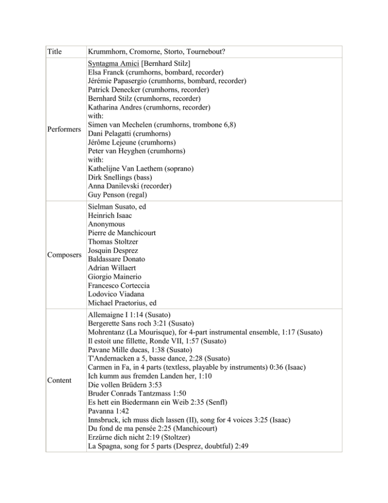 Title Krummhorn, Cromorne, Storto, Tournebout? Syntagma Amici [Bernhard Stilz] Elsa Franck (crumhorns, bombard, recorder) Jérémie Papasergio (crumhorns, bombard, recorder) Patrick Denecker (crumhorns, recorder) Bernhard Stilz (crumhorns, recorder) Katharina Andres (crumhorns, recorder) with: Simen van Mechelen (crumhorns, trombone 6,8) Performers Dani Pelagatti (crumhorns) Jérôme Lejeune (crumhorns) Peter van Heyghen (crumhorns) with: Kathelijne Van Laethem (soprano) Dirk Snellings (bass) Anna Danilevski (recorder) Guy Penson (regal) Sielman Susato, ed Heinrich Isaac Anonymous Pierre de Manchicourt Thomas Stoltzer Josquin Desprez Composers Baldassare Donato Adrian Willaert Giorgio Mainerio Francesco Corteccia Lodovico Viadana Michael Praetorius, ed Content Allemaigne I 1:14 (Susato) Bergerette Sans roch 3:21 (Susato) Mohrentanz (La Mourisque), for 4-part instrumental ensemble, 1:17 (Susato) Il estoit une fillette, Ronde VII, 1:57 (Susato) Pavane Mille ducas, 1:38 (Susato) T'Andernacken a 5, basse dance, 2:28 (Susato) Carmen in Fa, in 4 parts (textless, playable by instruments) 0:36 (Isaac) Ich kumm aus fremden Landen her, 1:10 Die vollen Brüdern 3:53 Bruder Conrads Tantzmass 1:50 Es hett ein Biedermann ein Weib 2:35 (Senfl) Pavanna 1:42 Innsbruck, ich muss dich lassen (II), song for 4 voices 3:25 (Isaac) Du fond de ma pensée 2:25 (Manchicourt) Erzürne dich nicht 2:19 (Stoltzer) La Spagna, song for 5 parts (Desprez, doubtful) 2:49 Chi la gagliarda (All ye who music love), madrigal 2:13 (Donato) Pavana, la Cornetta for consort 1:35 Saltarello Zorzi 1:01 Cingari simo venit'a giocare, canzona for 4 voices 1:39 (Willaert) Pavana El bisson 1:08 Tutu saltarello 0:42 Vecchie letrose non valete niente, canzona for 4 voices 1:37 (Willaert) La morte de la ragion, pavana à 4 2:00 L'arboscello ballo furlano & Puta nera ballo furlano 2:05 (Mainerio) Guardane almo pastore 2:39 (Corteccia) La Fiorentina 2:18 (Viadana) Padouana for 4 crumhorns in D minor (Banchetto musicale) 2:17 (Schein) Pass'e mezzo 1:26 (Praetorius) Gaillarde à 5 1:16 (Praetorius) Label Ricercar 262 Recorded July 2006 - September 2007, Notre-Dame de Centeilles / Saint-Apollin (FR) Released 2008 Length 59:00 Recorders Reviews Comments We would appreciate further details of this recording, namely Recorders Used, Reviews. Medium CD Cover image http://cover7.cduniverse.com/CDUCoverArt/Music/01/7617901.jpg
