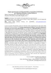 Gli ultimi concerti della Stagione 2013-14 Il Quartetto Ebène, da Mozart al Jazz di Miles Davis e a “Streets of Philadelphia” di Bruce Springsteen Sabato 5 Aprile, Teatro della Pergola, ore 16 Janine Jansen, il fascino del violino Domenica 6 Aprile, Teatro della Pergola (Saloncino), ore 21 Il debutto del Quartetto St. Lawrence Lunedì 7 Aprile, Teatro della Pergola (Saloncino), ore 21 Biglietti: - Sabato: 14-25 (interi), 12-21 (ridotti) - Domenica, Lunedì: 16-25 (interi), 14-21 (ridotti) euro 5 (Carta Giò del Comune di Firenze) Info: Amici della Musica Firenze, tel. 055608420, [email protected] www.amicimusica.fi.it, Streets of Philadelphia di Bruce Springsteen (scritto per il noto film Philadelphia), All Blues di Miles Davis e Misirlou di Nick Roubanis (utilizzato in Pulp Fiction) , Come together dei Beatles: queste e tante altre le rivisitazioni, di gusto cross-over, che verranno proposte dai giovani musicisti francesi del Quartetto Ebène, protagonista dell’appuntamento di Sabato 5 aprile (ore 16), al Teatro della Pergola, per gli Amici della Musica. È il culmine di un programma eclettico, aperto dalle classiche proposte del Quartetto KV 428 di Mozart e del Quartetto op.51 n.2 di Brahms. Una nuova tappa del ciclo Percorsi sonori, che confermerà la dinamica versatilità, la travolgente naturalezza nel muoversi fra generi diversi del Quartetto Ebène, grande rivelazione del Concorso Internazionale ARD (2004), entrata nella lista “New Generation Artistis” della BBC e oggi fra i più importanti quartetti della scena internazionale. Costituito nel 1999 da quattro promettenti allievi del Conservatorio Nazionale di BoulogneBillacourt (Pierre Colombet e Gabriele Le Magadure ai violini, Mathieu Herzog alla viola, Raphaël Merlin al violoncello), poi cresciuto sotto la guida del noto Quartetto Ysaÿe e del compositore Gyorgy Kurtag, il Quartetto Ebène è oggi invitato ad esibirsi nei maggiori festival d’Europa ed è protagonista di incisioni premiate dalla critica, rivelatrici di come la medesima passione possa essere riversata nei linguaggi musicali più differenti. Acclamata accanto alle orchestre più prestigiose, dal Royal Concertgebouw Orchestra ai Berliner Philharmoniker e alla New York Philharmonic, ama spesso tornare alla sua prima passione, la musica da camera: ed è in questa veste che fa il suo ritorno nei cartelloni degli Amici della Musica di Firenze (dove debuttò nel 1998, per Settembre Musica, giovanissima e ancora sconosciuta) la violinista olandese Janine Jansen, sul palcoscenico del Saloncino della ---------------------------------------------------------------------------------------------------------------------------------------------------------Amici della Musica Firenze Via Pier Capponi 41 – 50132 Firenze Tel. 055609012 – fax 055610141 www.amicimusica.fi.it [email protected] Pergola (ore 21), Domenica 6 Aprile. Ad accompagnarla è uno dei suoi partner cameristici più fedeli, il pianista di origine israeliana Itamar Golan, richiestissimo per tour in tutto il mondo a fianco di artisti noti come i violinisti Shlomo Mintz e Maxim Vengerov o come il violoncellista Mischa Maisky. Programma sfaccettato quanto impegnativo, costruito su contrasti e assonanze, quello presentato a Firenze dai due artisti: la Sonata di Janacek, la Fantasia D 934 di Schubert, il Poème op.25 di Chausson, il tutto suggellato da un capolavoro classico come la Sonata op.108, l’ultima di Brahms. Spesso al fianco di autorevoli bacchette come Daniel Harding, Mariss Jansons e Antonio Pappano, Janine Jansen in questa stagione è in tournée con la Philharmonia Orchestra diretta da Esa-Pekka Salonen e la Boston Symphony Orchestra con Lorin Maazel. Vanta un rapporto di lunga data con la Royal Concertgebouw Orchestra (uno dei suoi primi cd, con i Concerti di Mendelssohn e Bruch, la vede con questa leggendaria orchestra e Riccardo Chailly direttore) ed ha fondato e cura artisticamente il Festival Internazionale di Musica da Camera di Utrecht. Suona il “Barrere” di Antonio Stradivari (1727), strumento concessole in prestito dalla Fondazione Elise Mathilde. Finale di stagione per gli Amici della Musica con un debutto, nel nome di quell’attenzione al quartetto d’archi che, fin dalle origini, scandisce i cartelloni della storica associazione concertistica: Lunedì 7 Aprile (ore 16), per la prima volta sul palcoscenico del Teatro della Pergola si presenta il Quartetto St. Lawrence, formazione canadese che vanta oltre sedici anni di attività e oltre milleseicento concerti tenuti in tutto il mondo. Particolarmente originale il programma, che fra i due estremi classici offerti da Haydn (i Quartetti op.20 n.1 e op.71 n.2) accoglie il Quartetto di Verdi, rigoroso ma dalla gestualità operistica, e una breve pagina del compositore argentino contemporaneo Osvaldo Golijov, Qohelet, ispirata dal Libro biblico dell’Ecclesiaste (come dichiara il titolo, in ebraico) e presentata in prima mondiale proprio dal Quartetto St. Lawrence, nel 2011. Fondato a Toronto nel 1989, il Quartetto St. Lawrence si è formato sotto la guida dei Quartetti Emerson, Julliard e di Tokyo, ed ha debuttato con successo al Lincoln Center di New York e al Kennedy Center di Washington, ottenendo subito l’invito ad esibirsi presso le più importanti società concertistiche in America ed Europa. Oggi tiene corsi ed è in residence presso l’Università di Stanford. Oltre al più noto repertorio classico e romantico, si dedica con particolare attenzione alla musica del nostro tempo, lavorando a stretto contatto con compositori, fra i quali proprio Golijov ma anche Patrick Cardy e Jonatahn Berger, dei quali tiene spesso a battesimo lavori appositamente commissionati. Con preghiera di pubblicazione/diffusione Grazie per la cortese attenzione Francesco Ermini Polacci Amici della Musica Firenze onlus – Comunicazione e Promozione Tel. 055607440 / [email protected] ------------------------------------------------------------