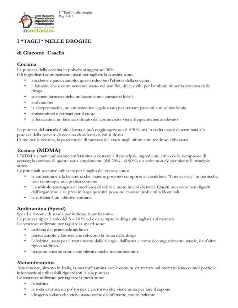 I “Tagli” nelle droghe Pag. 1 di 3 I “TAGLI” NELLE DROGHE di Giacomo Casella Cocaina La purezza della cocaina in polvere si aggira sul 30% . Gli ingredienti comunemente usati per tagliare la cocaina sono: • zucchero e paracetamolo; questi riducono l'effetto della cocaina • il lattosio, che è comunemente usato nei panifici, dolci e cibi per bambini; riduce la potenza della droga • sostanze farmaceutiche utilizzate come anestetici locali • amfetamine • la clorpromazina, un antipsicotico legale usato per trattare pazienti con schizofrenia • antistaminici e farmaci per il cuore • la fenacetina, un farmaco ritirato dal commercio, viene frequentemente rilevato. La purezza del crack è più elevata e può raggiungere quasi il 50% ma in realtà essa è determinata alla purezza della polvere di cocaina cloridrato da cui si ricava . Come per la cocaina, la percentuale di purezza del crack negli ultimi anni tende ad abbassarsi. Ecstasy (MDMA) L'MDMA ( metilendiossimetamfetamina o ecstasy) è il principale ingrediente attivo delle compresse di ecstasy; la purezza di queste varia ampiamente (dal 20% - al 90%) e a volte non c'è per niente il principio attivo. Le principali sostanze utilizzate per il taglio del ecstasy sono: • le amfetamine e la ketamina che assieme possono comporre la cosiddetta “finta ecstasy” in pasticche; non comunque una pratica comune • il sorbitolo (surrogato di zucchero) di solito è usato in cibi dietetici. Questi non sono ben digeriti dall'organismo e se presi in larga quantità possono causare problemi addominali. • la caffeina è un additivo comune. Amfetamina (Speed) Speed è il nome di strada per indicare le amfetamine. La purezza tipica è solo del 5 – 10 % ed è da sempre la droga più tagliata sul mercato. Le sostanze utilizzate per tagliare la speed sono: • caffeina è il principale additivo • paracetamolo e lattosio che riducono la forza della droga • l'efedrina, usata per il trattamento dalle allergie, dall'asma e come decongestionante nasale, è un'altro tipico additivo • occasionalmente sono state rilevate anche metamfetamine Metamfetamina Attualmente, almeno in Italia, la metamfetamina non è comune da trovare sul mercato sono quindi poche le informazioni utilizzabili riguardanti la sua purezza. Le sostanze utilizzate per tagliare la meth sono: • l'efedrina • la soda caustica un po' tossica e corrosiva che viene usata per fare il sapone • idrogeno iodato che viene usato come disinfettante, molto irritante I “Tagli” nelle droghe Pag. 2 di 3 • • • l'ammoniaca che viene usata per fare i fertilizzanti il fosforo rosso, usato per far accendere i fiammiferi lo iodio che è un antisettico. Un certo numero di sostanze chimiche si producono anche durante il processo di manifattura e queste possono essere ritrovate come impurità nei cristalli di metamfetamina. Eroina Anche in questo caso, la purezza dell'eroina da strada è molto variabile e più spesso è molto bassa, nell'ordine del 10% o meno della polvere venduta. In alcuni casi raggiunge il 30 % ma, se è tale, può diventale letale per consumatori di piazza che non hanno una tolleranza altrettanto elevata. In ogni caso il grado di purezza dipende veramente dal tipo di luogo, città, nazione in cui essa viene venduta. Gli ingredienti principali per tagliare l'eroina sono: • paracetamolo e caffeina • zuccheri • tranquillanti e barbiturici (diazepam e fenobarbital) che diminuiscono l'ansia e la tensione. Gli assuntori percepiscono la sensazione di essere più sedati. Questi sono farmaci oltre a poter indurre dipendenza sono particolarmente pericolosi, soprattutto i barbiturici, per la capacità di agire negativamente sull'attività respiratoria già depressa dall'eroina. Infezioni fatali o gravi si succedono periodicamente, dovute a contaminazioni batteriche. Marijuana/Hashish Quando si accenna alla purezza della marijuana e dell'hashish bisogna considerare la forza ovvero la potenza di questi, espressa in quantità di principio attivo presente (THC), in un prodotto non adulterato. La potenza decresce con il tempo e dipende dalla parte della pianta usata, quindi un utilizzatore ha poche garanzie rispetto all'intensità dell'esperienza. Tra marijuana e hashish è sopratutto quest'ultimo a dare opportunità di taglio; la marijuana meno frequentemente è mischiata con altri prodotti vegetali. Per aumentare il volume del hashish ed il guadagno del venditore vengono aggiunte altre sostanze che influenzano enormemente l’aspetto, il sapore, la tossicità e la compattezza e che poi vengono fumate con la resina: tinture, acquaragia, tranquillanti, sterco animale, l'hennè, la sabbia, il catrame, tutti i tipi di olio incluso quello di palma e di cocco. A volte, per alterare l'aspetto ed il peso, il “prodotto” viene spruzzato con vernice vetrificante. LSD e altri allucinogeni Al gruppo degli allucinogeni fanno parte la psilocibina (funghetti), la mescalina (peyote), la salvia divinorum, LSD e molti altri principi attivi. Tra questi l'LSD è quello che talvolta subisce processi di taglio e vengono aggiunte sostanze quali amfetamina, ecstasy, ecc. Per lo più il prodotto è originale così come prodotti completamente falsi non sono mai stati trovati. La quantità di acido contenuta in una dose è però molto variabile e non può essere conosciuta. I tagli influenzano fortemente gli effetti soprattutto nella fase finale della loro azione. Ketamina A volte viene riportato che questa sostanza è mescolata ad altre droghe tipo eroina, ecstasy o PCP (polvere degli angeli) I “Tagli” nelle droghe Pag. 3 di 3 E' abbastanza strano che il venditore sprechi l'eroina come sostanza da taglio visto il costo e l'effetto; se si aggiunge l'ecstasy, la ketamina potrebbe essere percepita come “non buona” considerati i suoi effetti non prettamente dissociativi se pure, in parte, allucinogeni. Forse la più probabile tra queste è il PCP ( una fencicilidina) considerato che
