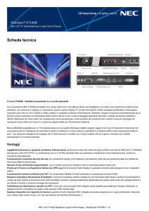Videowall 3x3 Cornice Ultrasottile SPECIFICHE TECNICHE Tecnologia schermo S-PVA TFT con retroilluminazione LED diretta, bianca Area schermo attivo (l x a) [mm] 1.209,8 x 680,6 Dimensioni schermo [inch/cm] 55 / 139 Rapporto di formato schermo 16:9 Luminosità [cd/m²] 700, 420 Eco (impostazione per spedizione) Rapporto di contrasto (tip.) 3500:1 Angolo di visualizzazione [°] 178 orizzontale / 178 verticale (tip. con rapporto di contrasto 10:1) Tempo di risposta (tip.) [ms] 8 Frequenza d'Aggiornamento [Hz] 60 Haze Level [%] 44 Orientamento Supportato A Faccia in Su; Landscape; Portrait Frequenza orizzontale [kHz] 31,5 - 91,1 Frequenza verticale [Hz] 50 - 85 Risoluzione nativa 1920 x 1080 a 60 Hz Supportato su DisplayPort e HDMI 3840 x 2160 (24/30 Hz); 1920 x 1080; 1600 x 1200; 1360 x 768; 1280 x 1024; 1280 x 768; 1080i; 1080p; 1024 x 768; 800 x 600; 720p (50/60 Hz); 640 x 480; 576p (50 Hz); 480p (60 Hz) Supportato soltanto su HDMI 4096 x 2160 (24 Hz); 3840 x 2160 (25 Hz); 1360 x 768; 576i (50 Hz); 480i (60 Hz) Input Video Analogo 1 x Dsub 15 Input Video Digitale 1 x DisplayPort (HDCP); 1 x DVI-D (con HDCP); 1 x HDMI (HDCP); 1 x Interfaccia Slot d'Espansione; 1 x OPS Slot Input Audio Analogo 2 x 3,5 mm jack Input Audio Digitale 1 x DisplayPort; 1 x HDMI Controllo Input filo comando a distanza (3,5mm jack); LAN 100Mbit; RS232 Output Video Digitale 1 x DisplayPort out (loop-through:DisplayPort, DVI-D, HDMI, Interfaccia Slot d'Estensione, OPS) Output Audio Analogo 3,5mm jack Controllo Output LAN 100Mbit Controllo da remoto Ingresso RS-232C (D-Sub 9 pin); LAN con SNMP; Telecomando IR (sensore interno/esterno (opzionale)) Tecnologia Slot Open pluggable specification (standard / Intel OPS) Corrente die spunto [A] max. 10 Consumo di Energia [W] max. 61 Tensione/Corrente [V/A] 16/4 INTERFACCIA SLOT D'ESTENSIONE Tecnologia Slot interfaccia d'estensione analoga e digitale SENSORI Sensore Illuminazione Ambiente Opzionale, azioni trigger programmabili Sensore di Presenza Opzionale, esterno, 4-5m gamma, azioni trigger programmabili Sensore Temperatura Integrato, 3 sensori, azioni trigger programmabili Sensore NFC Integrato, 2cm gamma, Android App richiesto Consumo di Energia [W] 146 Eco (impostazione per spedizione), 195 Modo Stand-by [W] < 0,5 (ECO Standby); < 1 Gestione energetica VESA DPMS Temperatura ambiente (operativa) [°C] da +0 a +40 Umidità ambiente (operativa) [%] da 20 a 80 Dimensioni (l x a x p) [mm] Senza supporto: 1.215,3 x 686,1 x 99,6 Peso [kg] Senza supporto: 29,2 Larghezza cornice [mm] 1,8 sotto/destra; 3,7 sopra/sinistra; 5.5; Content-to-content 5,7 Montaggio VESA [mm] 4 fori; 400 x 400 (FDMI); M6 Caratteristiche Particolari 10-bit LUT programmabile con 3 banchi di memoria; Assegnazione Auto ID; Cornice estremamente sottile , spessore di soli 5.7 mm tra contenuto e 5.5 mm di larghezza complessiva della; Frame Comp; Funzione di auto-sovrapposizione; Funzione log leggibile dall'utente; Funzione Post-it in OSD; Funzione Zoom su Punto; Immagine con effetto flipping; Intelligent Wireless Data (basato su NFC); Mail d'Allarme Automatiche; NaViSet Administrator 2; Server HTTP; TileMatrix Versioni colore Cornice anteriore nera, involucro posteriore nero Sicurezza ed ergonomia C-tick; CE; Energy Star 6.0; FCC classe B; PSB; RoHS; TÜV GS; UL/C-UL o CSA; VCCI Audio Optional Speakers (15 W + 15 W) Contenuto dell'imballo Cavo DisplayPort; Cavo elettrico; CD-ROM (guide per l'operatore/manuali); display; LAN software di controllo gratuito (download) Cavo segnale: Cavo LAN Garanzia 3 anni di garanzia compresa retroilluminazione; opzionale 4. + 5. anni estensione di garanzia; servizi addizionali disponibili Ore di Funzionamento 24/7 Accessori Altoparlanti (SP-RM1); Carrello (PD02VWM 2x2 46 55 L; PD02VWM 3x3 46 55 L); Kit comando a distanza (KT-RC2); Kit di calibrazione (KT-LFD-CC2); Kit telaio decorativo (KT-55UN-OF); Piedi (ST-5220); Supporto a muro (PDVWXUN 55 L/P; PD02VW MFS 46 55 L/P, easyFrame MX55UN) Interfaccia d'Estensione SB3-AB1 analogo: Audio; Componente; Composite; S-Video SB3-AB2 analogo: Audio; RGBHV SB3-DB1 digitale: 2 x HDMI OPS HD-SDI 1.5G / 3G; Intel® Celeron and Core i3, i5, i7 Slot-in PC; OPS Digital Signage Player; Ricevitore HDBaseT Efficienza energetica Carbon savings meter; Classe di efficienza energetica: B; Consumo d'energie annuale: 213 kWh (basato su 4 ore di funzionamento al giorno); Modo ECO; Sensore di Presenza Materiali ecologici Manuali su CD; Stand opzionale DISPLAY RAPPORTO DI SINCRONIZZAZIONE RISOLUZIONE CONNETTIVITÀ OPS SLOT OPZIONALE OPS SLOT OPZIONALE ELETTRICITÀ CONDIZIONI AMBIENTALI MECCANICO CARATTERISTICHE ADDIZIONALI OPZIONI DISPONIBILI GREEN FEATURES