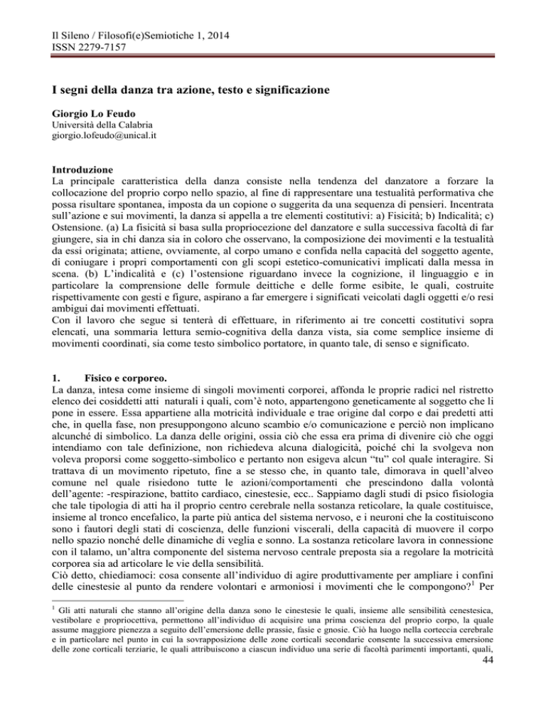 Il Sileno / Filosofi(e)Semiotiche 1, 2014 ISSN 2279-7157 I segni della danza tra azione, testo e significazione Giorgio Lo Feudo Università della Calabria [email protected] Introduzione La principale caratteristica della danza consiste nella tendenza del danzatore a forzare la collocazione del proprio corpo nello spazio, al fine di rappresentare una testualità performativa che possa risultare spontanea, imposta da un copione o suggerita da una sequenza di pensieri. Incentrata sull’azione e sui movimenti, la danza si appella a tre elementi costitutivi: a) Fisicità; b) Indicalità; c) Ostensione. (a) La fisicità si basa sulla propriocezione del danzatore e sulla successiva facoltà di far giungere, sia in chi danza sia in coloro che osservano, la composizione dei movimenti e la testualità da essi originata; attiene, ovviamente, al corpo umano e confida nella capacità del soggetto agente, di coniugare i propri comportamenti con gli scopi estetico-comunicativi implicati dalla messa in scena. (b) L’indicalità e (c) l’ostensione riguardano invece la cognizione, il linguaggio e in particolare la comprensione delle formule deittiche e delle forme esibite, le quali, costruite rispettivamente con gesti e figure, aspirano a far emergere i significati veicolati dagli oggetti e/o resi ambigui dai movimenti effettuati. Con il lavoro che segue si tenterà di effettuare, in riferimento ai tre concetti costitutivi sopra elencati, una sommaria lettura semio-cognitiva della danza vista, sia come semplice insieme di movimenti coordinati, sia come testo simbolico portatore, in quanto tale, di senso e significato. 1. Fisico e corporeo. La danza, intesa come insieme di singoli movimenti corporei, affonda le proprie radici nel ristretto elenco dei cosiddetti atti naturali i quali, com’è noto, appartengono geneticamente al soggetto che li pone in essere. Essa appartiene alla motricità individuale e trae origine dal corpo e dai predetti atti che, in quella fase, non presuppongono alcuno scambio e/o comunicazione e perciò non implicano alcunché di simbolico. La danza delle origini, ossia ciò che essa era prima di divenire ciò che oggi intendiamo con tale definizione, non richiedeva alcuna dialogicità, poiché chi la svolgeva non voleva proporsi come soggetto-simbolico e pertanto non esigeva alcun “tu” col quale interagire. Si trattava di un movimento ripetuto, fine a se stesso che, in quanto tale, dimorava in quell’alveo comune nel quale risiedono tutte le azioni/comportamenti che prescindono dalla volontà dell’agente: -respirazione, battito cardiaco, cinestesie, ecc.. Sappiamo dagli studi di psico fisiologia che tale tipologia di atti ha il proprio centro cerebrale nella sostanza reticolare, la quale costituisce, insieme al tronco encefalico, la parte più antica del sistema nervoso, e i neuroni che la costituiscono sono i fautori degli stati di coscienza, delle funzioni viscerali, della capacità di muovere il corpo nello spazio nonché delle dinamiche di veglia e sonno. La sostanza reticolare lavora in connessione con il talamo, un’altra componente del sistema nervoso centrale preposta sia a regolare la motricità corporea sia ad articolare le vie della sensibilità. Ciò detto, chiediamoci: cosa consente all’individuo di agire produttivamente per ampliare i confini delle cinestesie al punto da rendere volontari e armoniosi i movimenti che le compongono?1 Per 1 Gli atti naturali che stanno all’origine della danza sono le cinestesie le quali, insieme alle sensibilità cenestesica, vestibolare e propriocettiva, permettono all’individuo di acquisire una prima coscienza del proprio corpo, la quale assume maggiore pienezza a seguito dell’emersione delle prassie, fasie e gnosie. Ciò ha luogo nella corteccia cerebrale e in particolare nel punto in cui la sovrapposizione delle zone corticali secondarie consente la successiva emersione delle zone corticali terziarie, le quali attribuiscono a ciascun individuo una serie di facoltà parimenti importanti, quali, 44 Il Sileno / Filosofi(e)Semiotiche 1, 2014 ISSN 2279-7157 rispondere compiutamente è necessario modificare la prospettiva, passando dal concetto di corpo inteso come “motore” di atti naturali (cinestesie, etc.), a quello di corpo considerato “pro-motore” di azioni simboliche. Occorre, quindi, spostarsi da un contesto psico-fisiologico ad uno prettamente epistemologico2. Tale necessità è dovuta in primis a una ragione: la consapevolezza dello iato che separa uno status cerebrale, sufficiente per la messa in atto delle cinestesie, dai processi mentali che, invece, fanno sì che i semplici movimenti ripetuti divengano interpretabili e selezionabili e possano perciò assumere gradualmente la fisionomia delle rappresentazioni culturali3. 1.1 Atti naturali e azione simbolica. La nozione filosofica di atto naturale è stata articolata da Aristotele nei due concetti di “necessità” e “possibilità”. Egli, com’è noto, ha abbinato la “necessità” alle azioni involontarie concernenti il funzionamento del corpo umano e ha invece associato il concetto di “possibilità” ai comportamenti prodotti volontariamente e discrezionalmente. A valle di tale spartiacque, lo stagirita collocò inoltre un’altra importante specificazione: distinse le azioni possibili da quelle cosiddette pratiche, assegnando alle prime una qualificazione di tipo artistico e alle altre, una funzione prevalentemente tecnica. Le azioni possibili trovarono collocazione nell’alveo dell’estetica, mentre le pratiche furono collocate nel vasto elenco delle operazioni governate da regole. Tale ripartizione ha registrato nel tempo numerosi chiarimenti, il più importante dei quali è dovuto a Kant4. Egli, infatti, separò l’arte piacevole dall’arte bella e sostenne che la prima appare sottoforma di sensazione provocata da qualcos’altro che, in virtù di ciò, assume la denominazione di oggetto piacevole, mentre la seconda, l’arte be