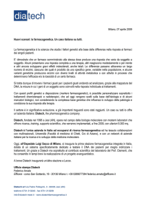 Foglio Informativo ANALISI FARMACOGENETICA Titolo dello Studio: Codice identificativo dello studio clinico: Versione del foglio informativo: La invitiamo a prendere attentamente in considerazione gli aspetti descritti in questo prospetto informativo. Si assicuri che: ne capisca il significato. Chieda al medico dello studio di spiegarle qualsiasi cosa che non capisca o che non le sia chiaro. esso sia accettabile per lei. Che cos'è la farmacogenetica? Ogni essere umano possiede una collezione di geni (il genoma). Un gene è l'unità di ereditarietà negli organismi viventi ed è posizionato lungo filamenti di DNA (molecole molto grandi contenute in ogni cellula dell’ organismo). Dal momento che ciascun gene può avere forme diverse da una persona all'altra, gli individui possono rispondere in maniera differente ai farmaci (come ciascun individuo differisce dagli altri per i propri tratti fisici). La farmacogenetica si prefigge di definire, attraverso l'analisi di uno o più geni, il modo probabile in cui una persona potrebbe rispondere ad un farmaco, al fine di ottimizzarne gli effetti utili e minimizzare o evitare il fallimento della terapia o la comparsa di effetti non terapeutici. Qual è il significato del campione ………..per lo studio farmacogenetico nell'ambito dello studio principale? Lo scopo è raccogliere e conservare campioni biologici per uno studio attuale/futuro per scoprire se un gene (o una combinazione di geni) possa essere utilizzato per ……………… Sono obbligato a fornire il campione supplementare per l'analisi farmacogenetica? No. La sua partecipazione allo studio non dipende dal fatto che Lei doni il campione di ……. per lo studio farmacogenetico. La decisione di donare o no il campione di …… è completamente sua. Se lei deciderà di partecipare, Le sarà consegnato questo prospetto informativo che terrà con sé e le sarà chiesto di firmarlo insieme al modulo di consenso. Cosa succederà se partecipo? Le sarà prelevato dal medico dello studio un campione aggiuntivo di ……. in occasione di una delle visite programmate presso ……………………. Avrete bisogno che vi fornisca ulteriori informazioni nel caso che io dia il campione di …… per lo studio farmacogenetico? No. Sarà necessario solo il campione di …… per lo studio farmacogenetico. Unitamente alle informazioni cliniche raccolte nell'ambito dello studio, esso sarà sufficiente per l'analisi farmacogenetica. Cosa accadrà al mio campione di ………. per lo studio farmacogenetico dopo che sarà stato prelevato? Una volta prelevato, il campione sarà inviato al laboratorio, ………………… ……………………………………….., dove si procederà all'estrazione del DNA dalle cellule di ……….. e all’esame del campione di DNA estratto. I campioni saranno conservati in condizioni di sicurezza presso..........................(specificare il luogo), a cura di............................(indicare il responsabile del trattamento e custodia del campione e quello del trattamento dei dati sensibili). Quali geni saranno analizzati? (INSERIRE IL PUNTO 1 O IL PUNTO 2) 1) I geni che saranno analizzati sono : ……………………………………………………… 2) Attualmente non sono conosciuti geni rilevanti per spiegare la patologia per la quale Lei è malato. Quali sono i possibili rischi della partecipazione? (INSERIRE SEMPRE I PUNTI 1 E 2, SCEGLIERE TRA IL PUNTO 3 O IL PUNTO 4) 1) Per quanto concerne l’atto del prelievo, esso è effettuato identicamente agli altri prelievi correnti programmati nell’ambito dello studio, e, quindi, non vi sono rischi aggiuntivi collegati al prelievo di questo campione. 2) Per quanto concerne l’atto del prelievo, esso richiede l’effettuazione di …….(biopsia p.es.)….. e, quindi, è possibile che si verifichi……………….. 3) Per quanto concerne il trattamento delle informazioni sensibili il campione è sottoposto solo ad indagini specifiche per i seguenti geni………..e, quindi, verrà trattato secondo le regole previste dalla legge sulla “privacy” (D. Lgs 196/2003) mediante anonimizzazione (esso, cioè, sarà caratterizzato da un codice specifico che potrà essere riferito alle Sue generalità solo dal medico responsabile dello studio). 4) Per quanto concerne il trattamento delle informazioni sensibili, il campione potrà essere analizzato per ricercare l’attività di geni attualmente non definiti. Per questo il campione sarà reso immediatamente completamente anonimo, in modo tale che esso non possa più essere ricondotto a Lei neppure dal medico responsabile dello studio che effettuerà il prelievo. Questo significa che il campione potrà essere analizzato con l’unico riferimento della sua malattia, del luogo e della data del prelievo. Il campione di ……. per lo studio farmacogenetico e i dati dell'analisi saranno collegati a me dopo che il campione sarà stato prelevato?(INSERIRE IL PUNTO 1 O IL PUNTO 2) 1) Si. Nel caso in cui il campione sia anonimizzato. 2) No. Nel caso in cui fosse reso completamente anonimo. E se mi dovessi pentire di aver donato il campione di ……. per lo studio farmacogenetico? (INSERIRE IL PUNTO 1 O IL PUNTO 2) Lei può revocare in qualsiasi momento il proprio consenso allo studio. 1) Nel caso in cui il prelievo sia anonimizzato il suo campione sarà distrutto come da sua richiesta. Dopo la distruzione del campione sarà inviata comunicazione a lei ad al medico dello studio. 2) Nel caso in cui il campione fosse anonimo, esso potrà anche non essere distrutto poiché il campione non è più rintracciabile. Per quanto tempo sarà conservato il mio campione per lo studio farmacogenetico? Il suo campione, sia nel caso in cui sia anonimizzato, che nel caso in cui sia completamente anonimo, sarà conservato per un massimo di ….. anni. A quel punto esso sarà distrutto. Chi detiene la proprietà del mio campione? Il campione di …… per lo studio farmacogeneti
