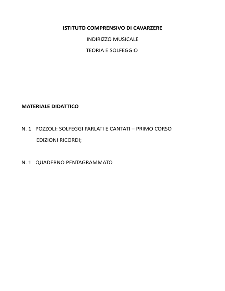 ISTITUTO COMPRENSIVO DI CAVARZERE INDIRIZZO MUSICALE TEORIA E SOLFEGGIO MATERIALE DIDATTICO N. 1 POZZOLI: SOLFEGGI PARLATI E CANTATI – PRIMO CORSO EDIZIONI RICORDI; N. 1 QUADERNO PENTAGRAMMATO